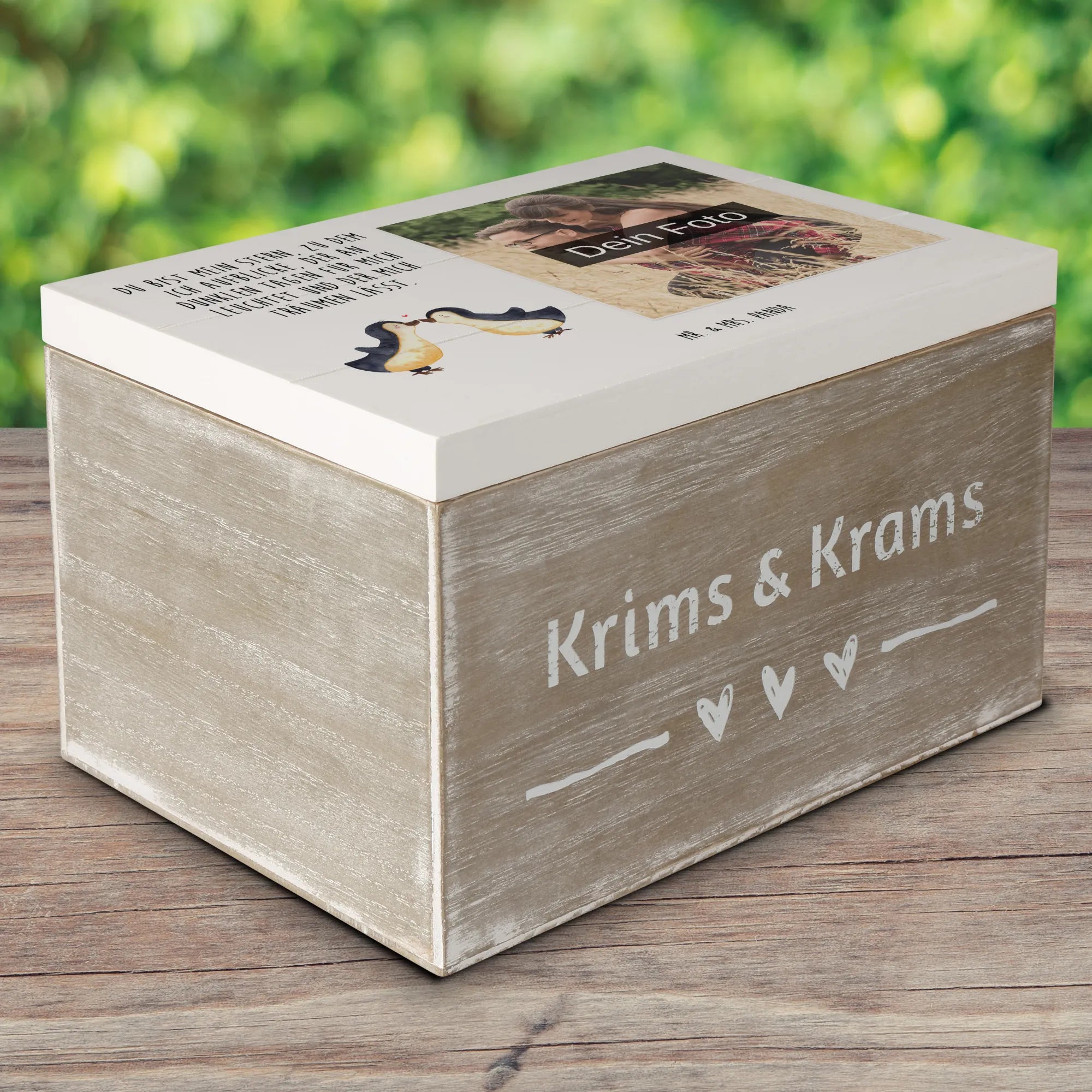 Entdecke die zauberhafte personalisierte Foto Holzkiste von Mr. & Mrs. Panda mit dem niedlichen Motiv 'Pinguin Liebe'. Wenn du auf der Suche nach dem perfekten Geschenk für deinen Lieblingsmenschen bist, ist diese Holzkiste genau das Richtige! Egal ob für den Jahrestag, den Hochzeitstag oder als Liebesgeschenk zum Valentinstag – diese wunderbare Kiste verleiht euren Erinnerungen einen ganz besonderen Platz.