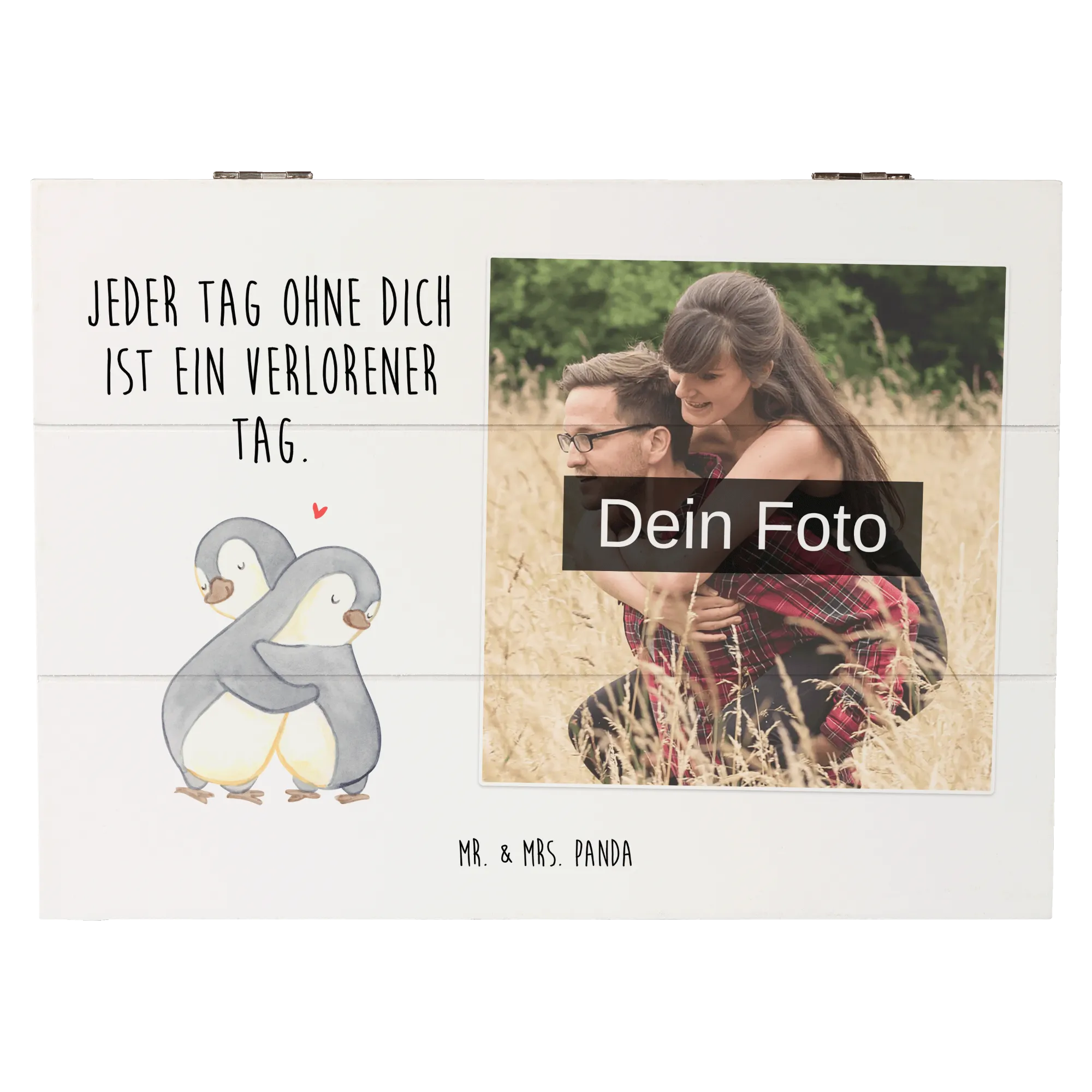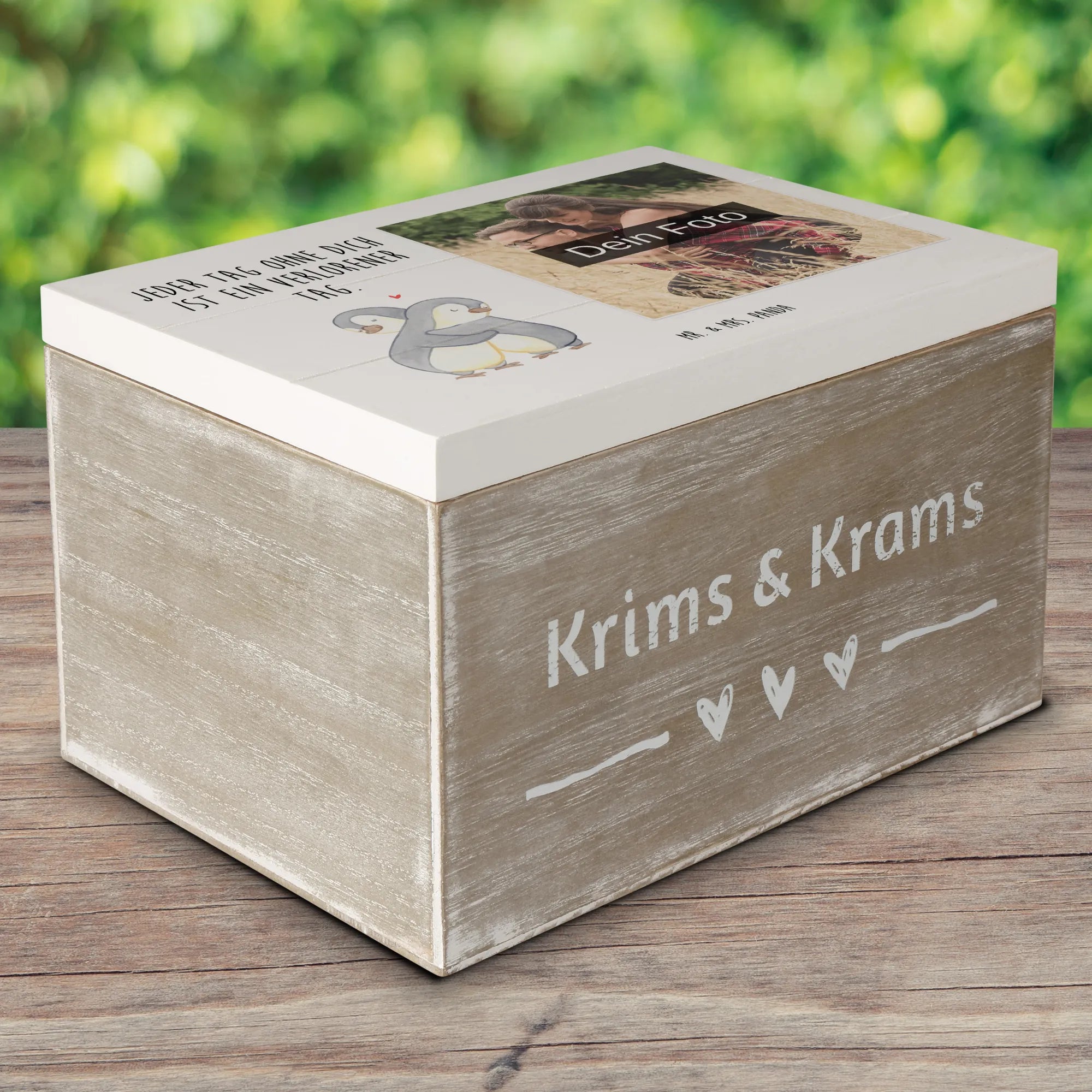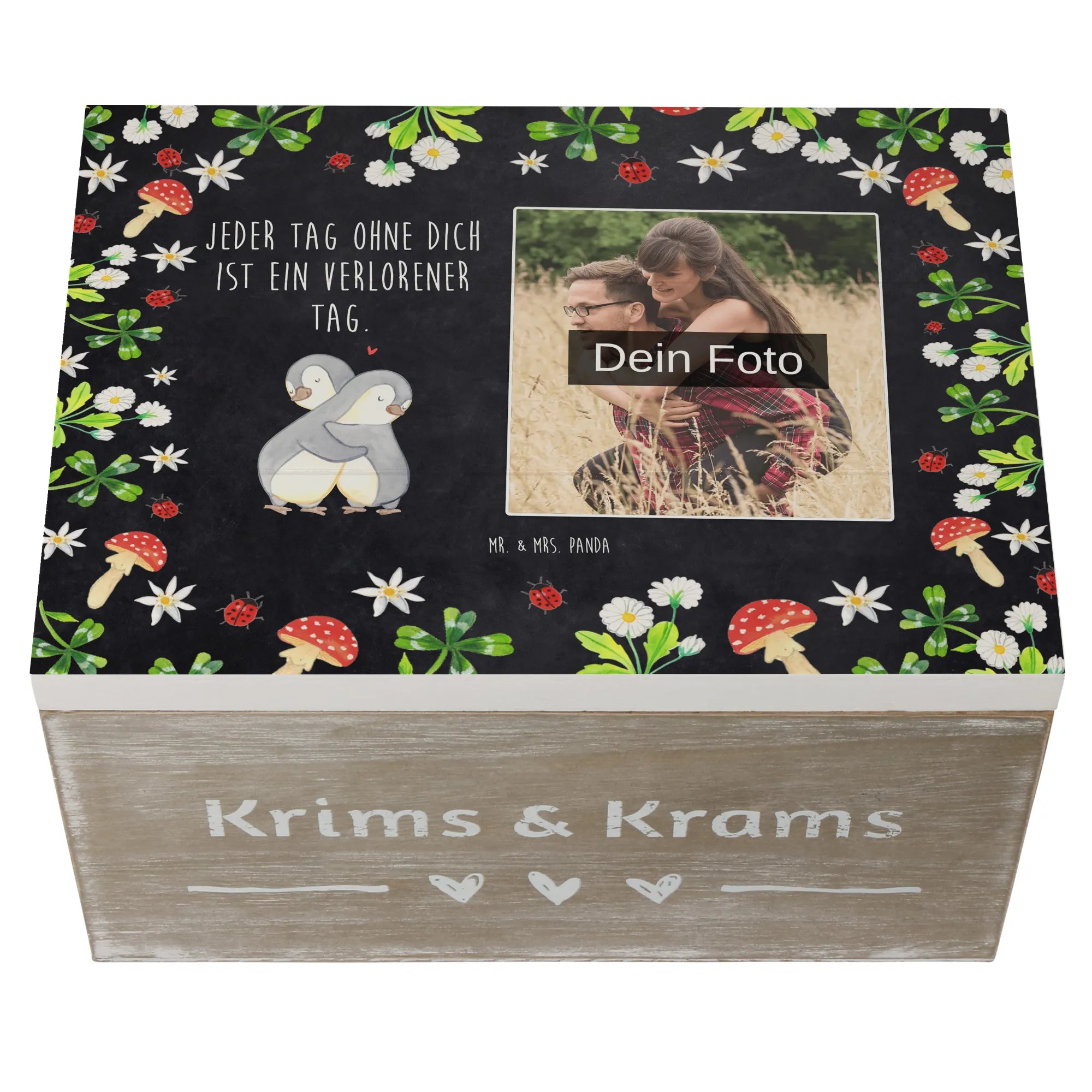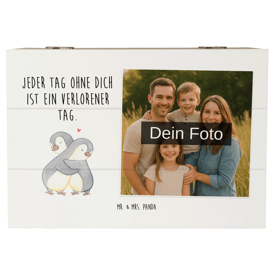 Die Kiste ist individuell anpassbar – du kannst dein eigenes Foto und einen Wunschnamen oder Text hinzufügen. Über dem liebevollen Motiv der Pinguine schwebt der Spruch "Jeder Tag ohne dich ist ein verlorener Tag", der die Zuneigung und Verbundenheit auf eine einzigartige Weise zum Ausdruck bringt. Diese Holzkiste ist somit nicht nur ein praktischer Aufbewahrungsort, sondern auch ein wunderbares Liebesbeweis, der Erinnerungen festhält.