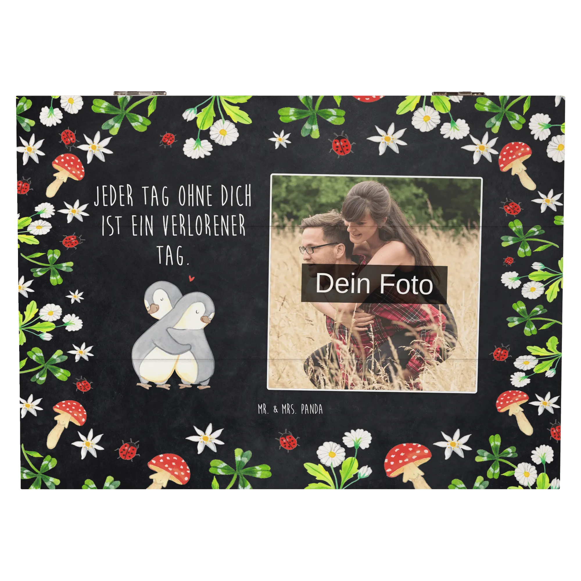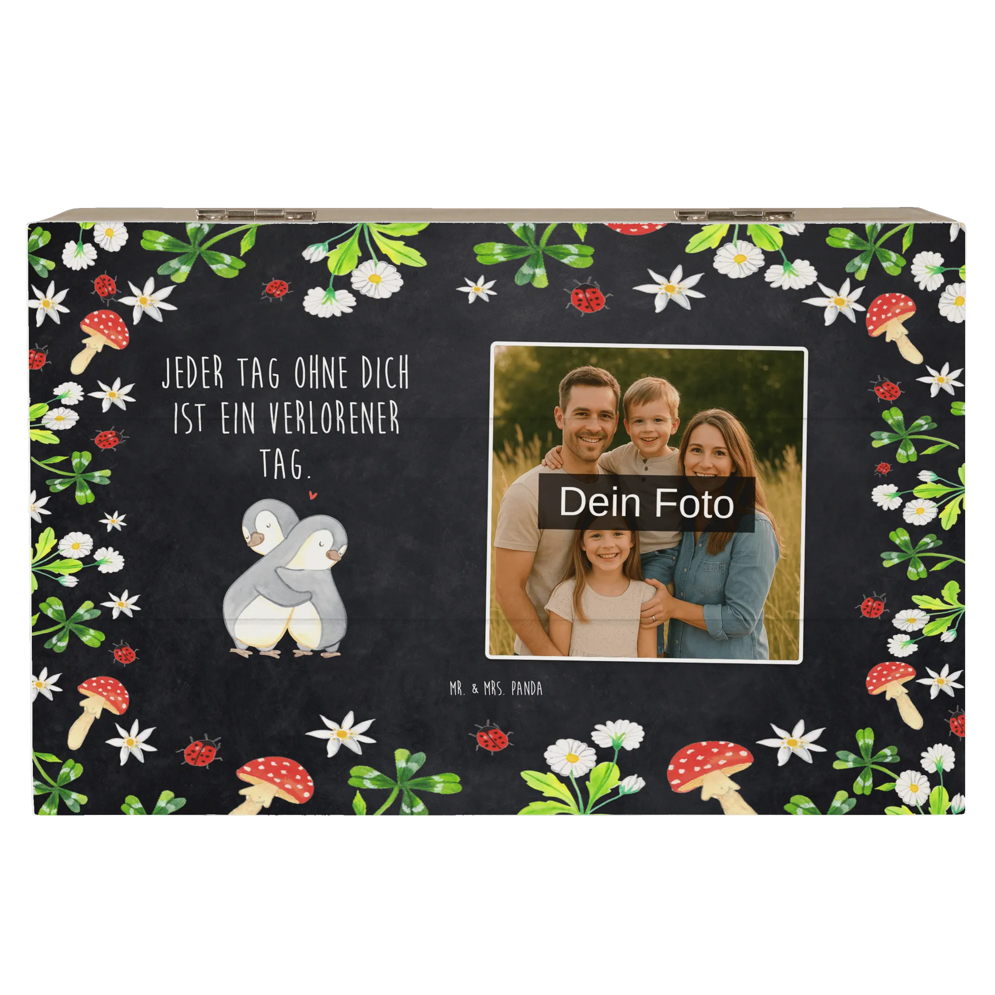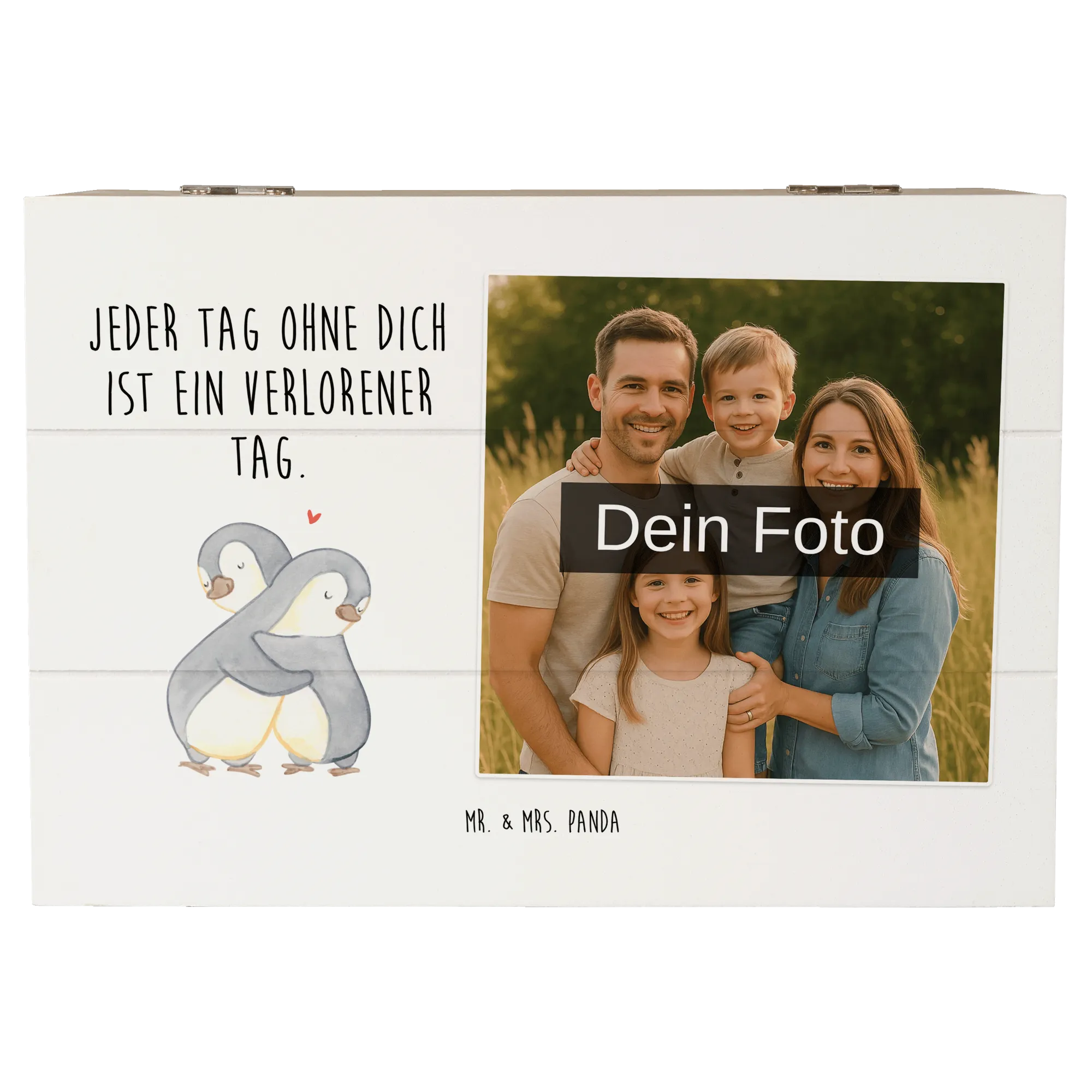 Die Kiste ist individuell anpassbar – du kannst dein eigenes Foto und einen Wunschnamen oder Text hinzufügen. Über dem liebevollen Motiv der Pinguine schwebt der Spruch "Jeder Tag ohne dich ist ein verlorener Tag", der die Zuneigung und Verbundenheit auf eine einzigartige Weise zum Ausdruck bringt. Diese Holzkiste ist somit nicht nur ein praktischer Aufbewahrungsort, sondern auch ein wunderbares Liebesbeweis, der Erinnerungen festhält.