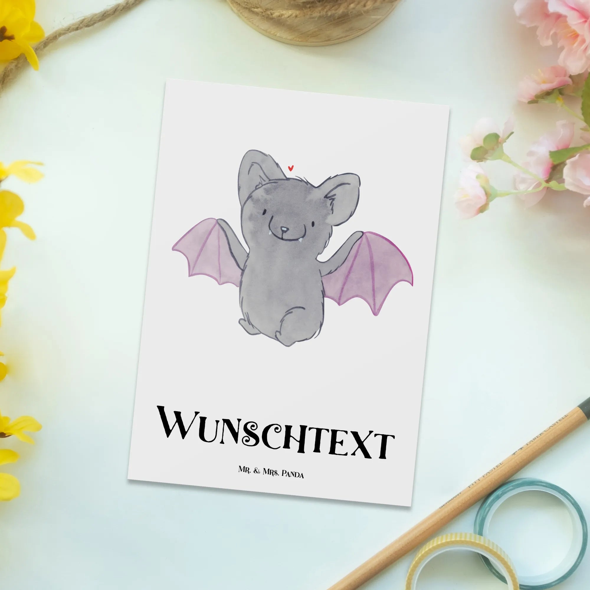 Die personalisierte Postkarte Fledermaus Classic aus der Halloween Kollektion von Mr. & Mrs. Panda ist das perfekte Geschenk für alle, die in der schönsten Zeit des Jahres, Halloween, eine ganz besondere Freude bereiten möchten.