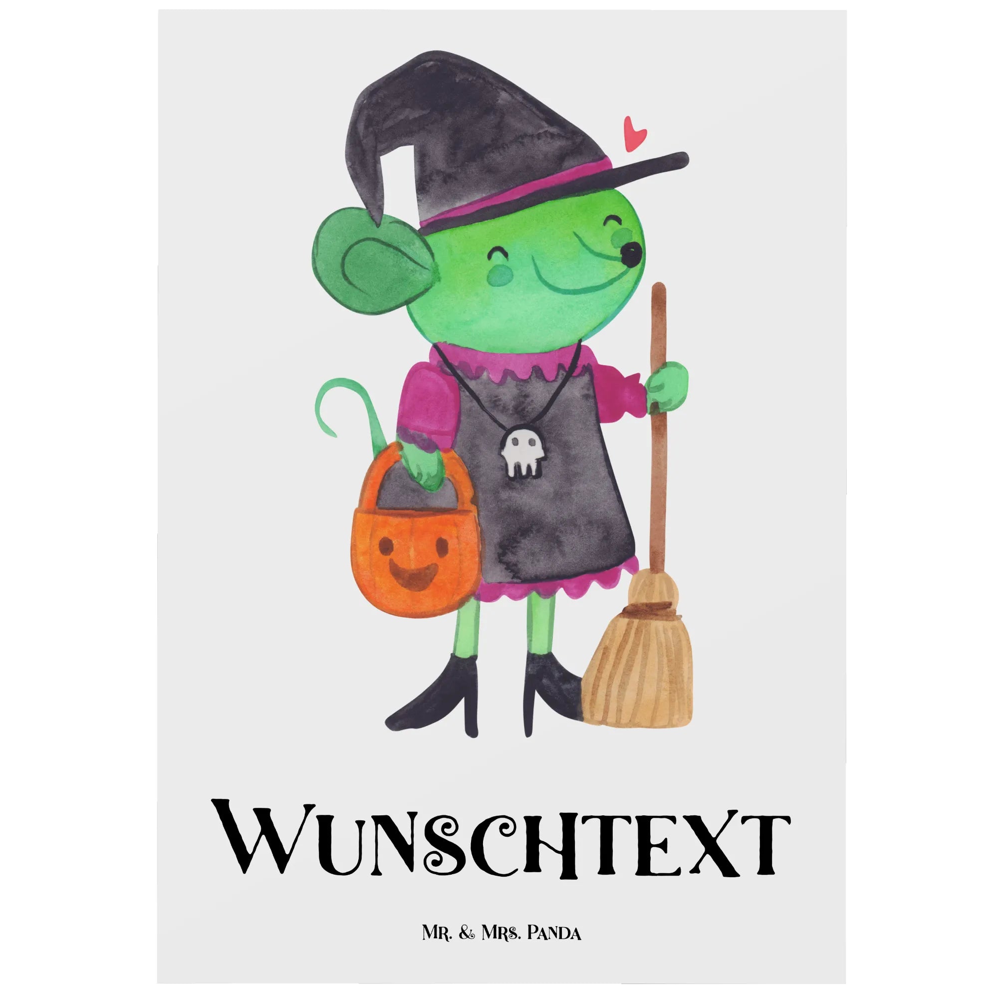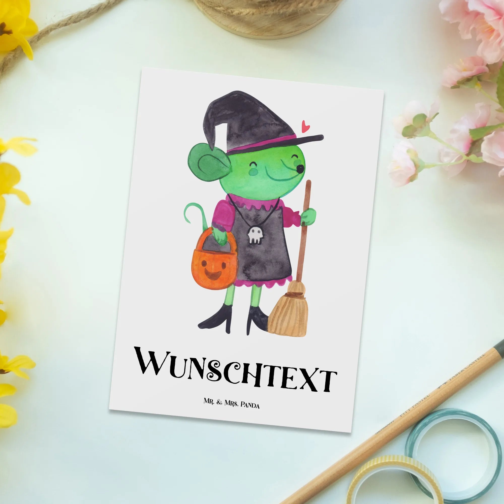 Unsere personalisierte Postkarte aus der Halloween Kollektion von Mr. & Mrs. Panda ist ein kleiner Glücksbringer für große und kleine Hexenfans. Die fröhliche, grüne Maus im Hexenkostüm mit Kürbiskorb und Besen verbreitet sofort gute Laune und eignet sich wunderbar als Postkarte mit Namen oder Grußkarte mit Wunschtext. 🎃