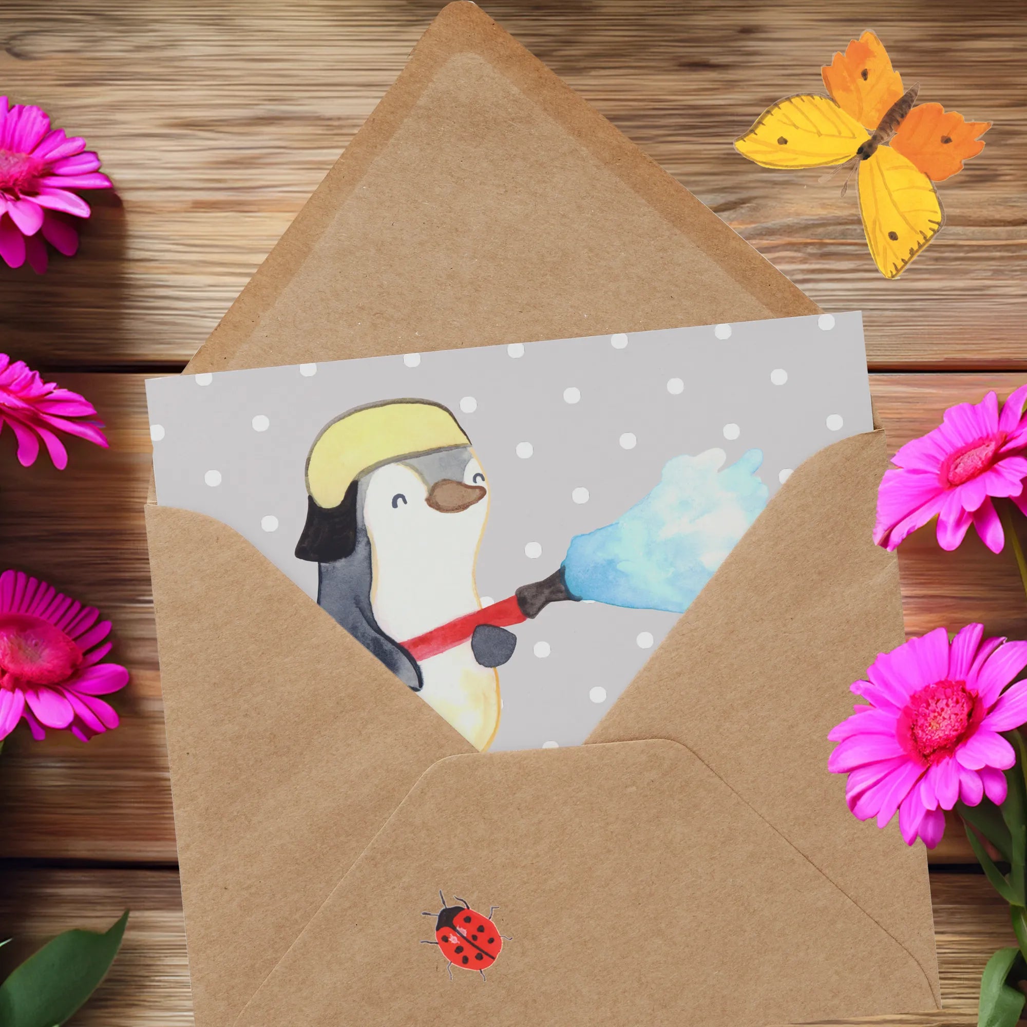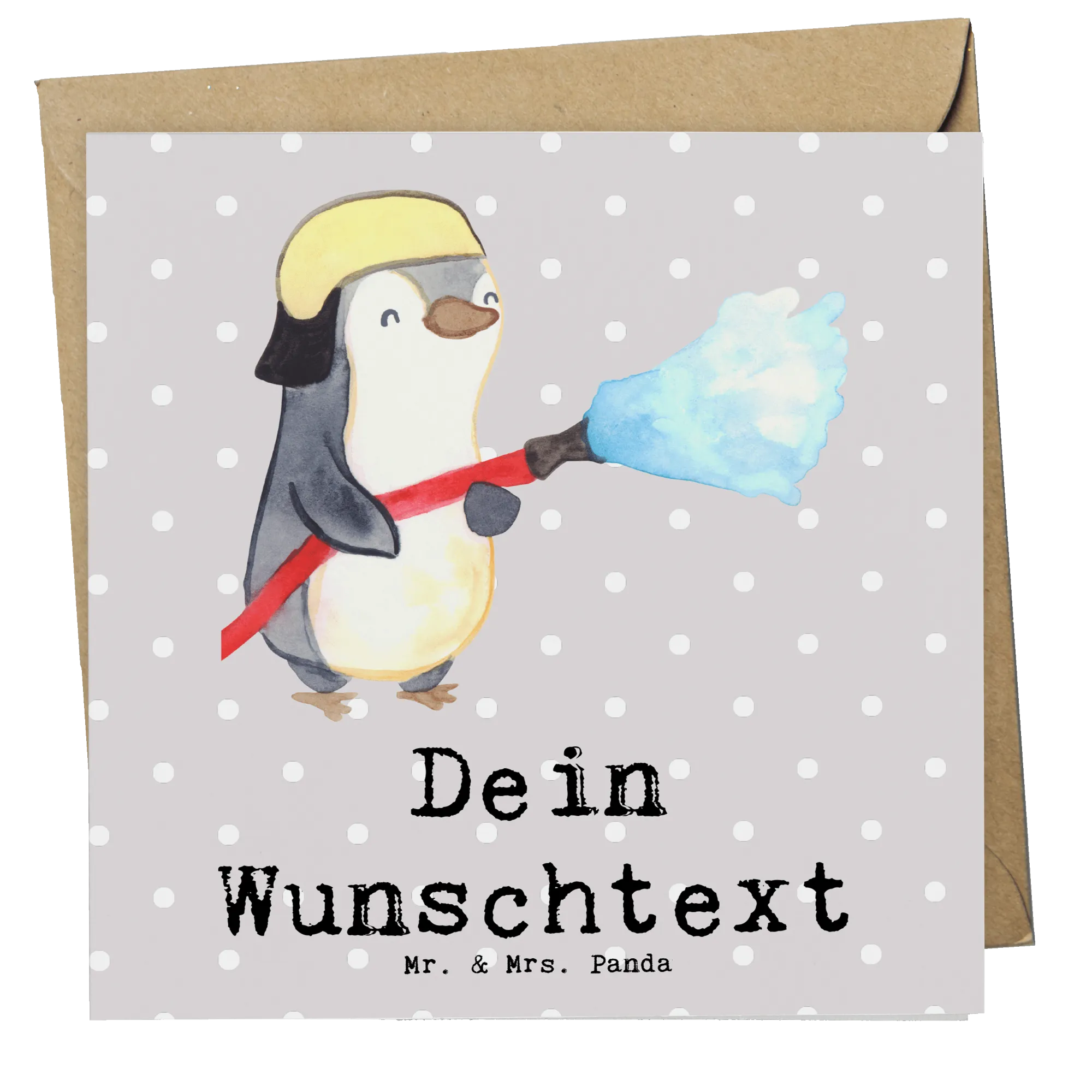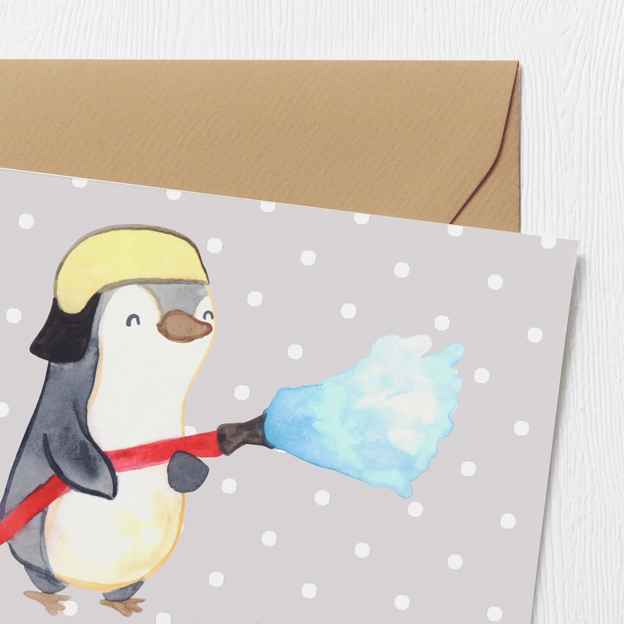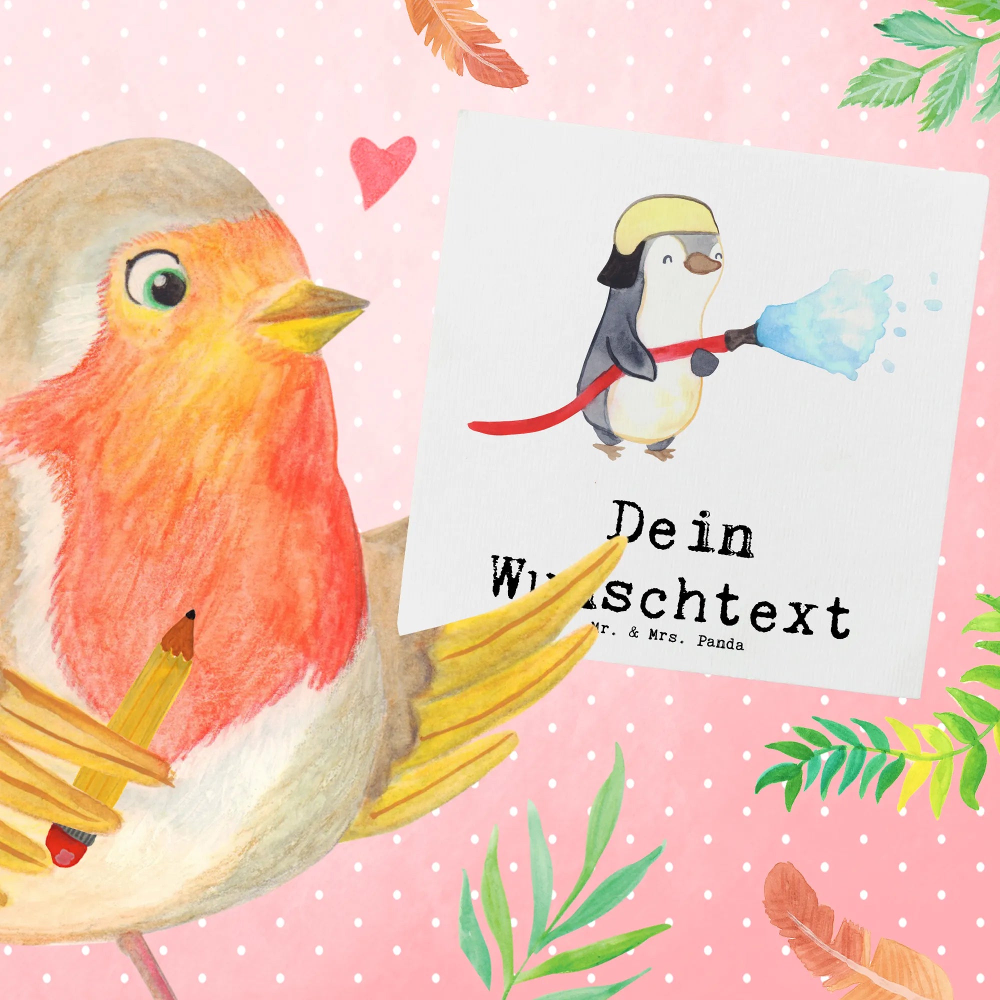 Personalisierte Deluxe Karte „Feuerwehrmann mit Herz“ – das liebevolle Geschenk für alle, die Feuerwehr nicht nur als Beruf, sondern als Berufung leben. Unser kleiner Pinguin im Feuerwehroutfit, handgezeichnet von Mrs. Panda, lächelt von der Vorderseite und trägt den stolzen Spruch: „Du bist nur ein halber Mensch, wenn du kein Feuerwehrmann bist.“ 🎖️