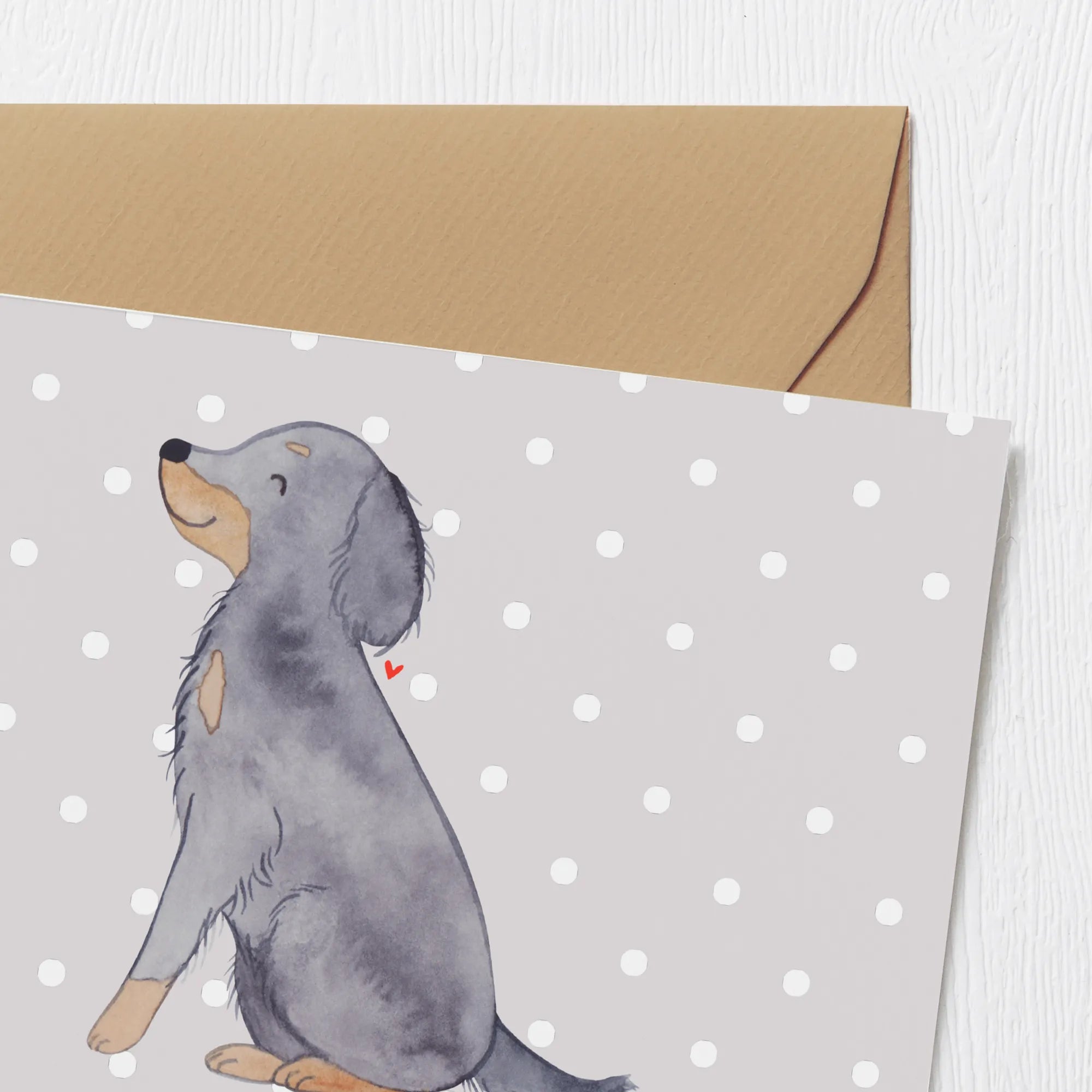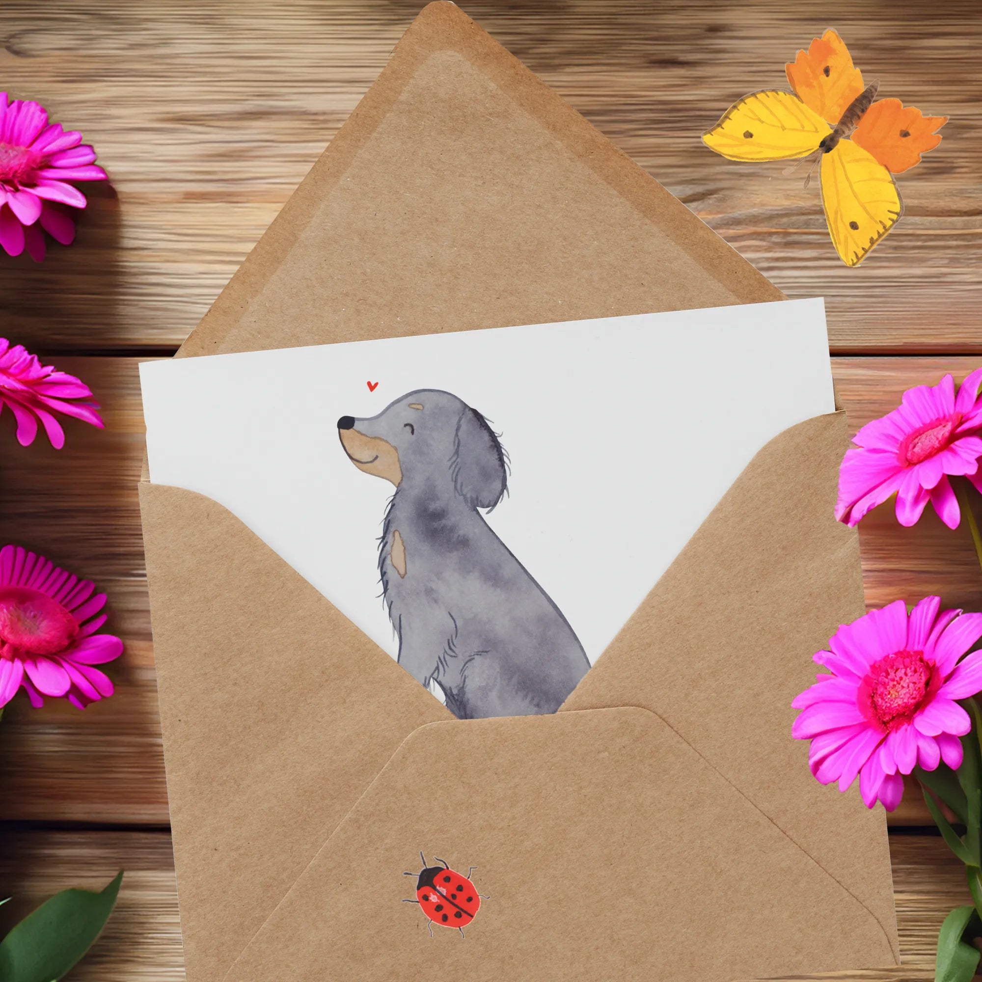 Das niedliche Motiv zeigt einen Gordon Setter in sanften Aquarelltönen, der liebevoll in die Höhe schaut. Mit dem Spruch "Mein Lebensretter ist ein Gordon Setter" bringt sie die besondere Verbindung zwischen Mensch und Hund zum Ausdruck. Neben der optischen Anziehungskraft ist die Karte auch praktisch, denn die innere matte Fläche eignet sich ideal für persönliche Nachrichten oder Glückwünsche. Du kannst die Karte ganz nach deinen Wünschen gestalten und sie wird mit einem edlen Umschlag geliefert.