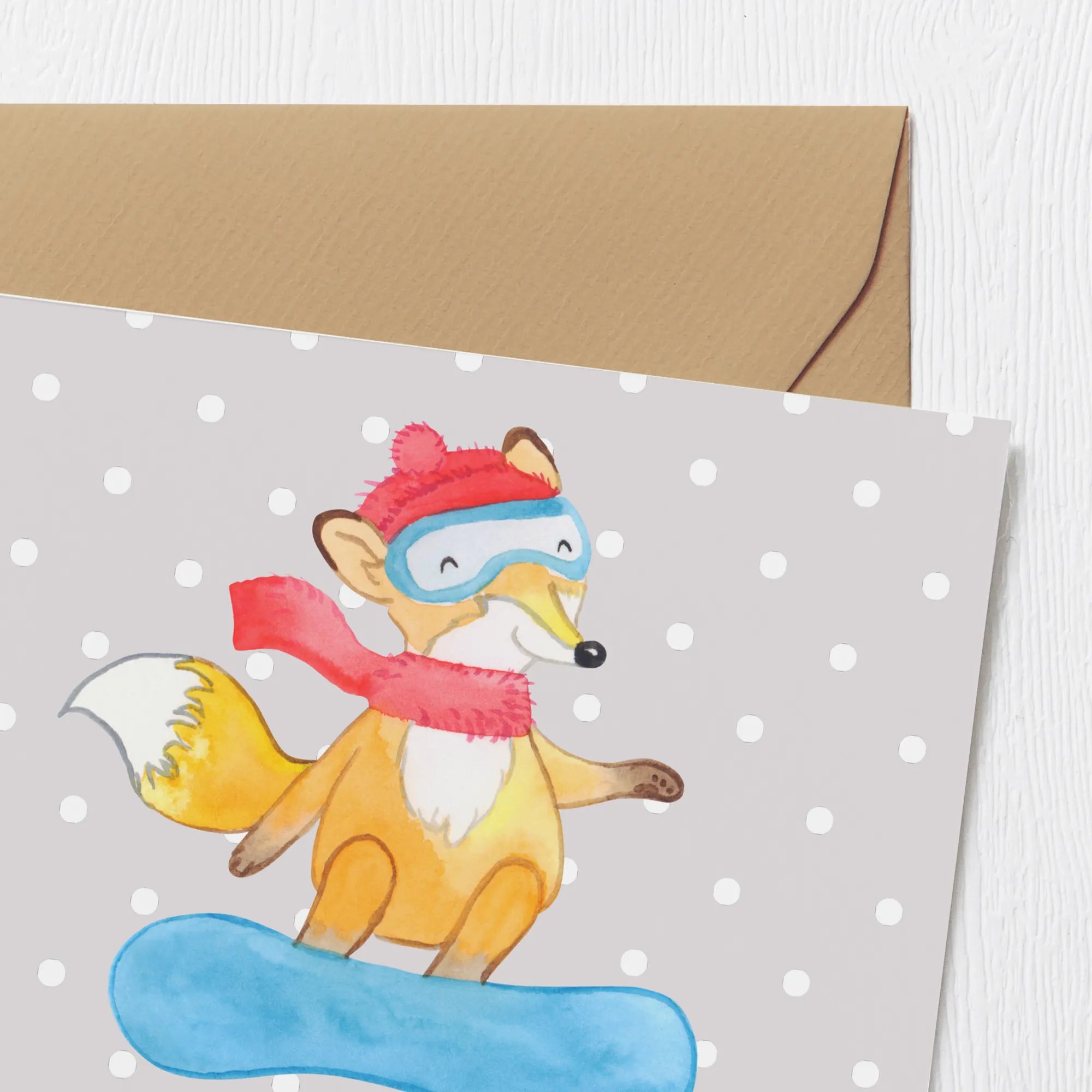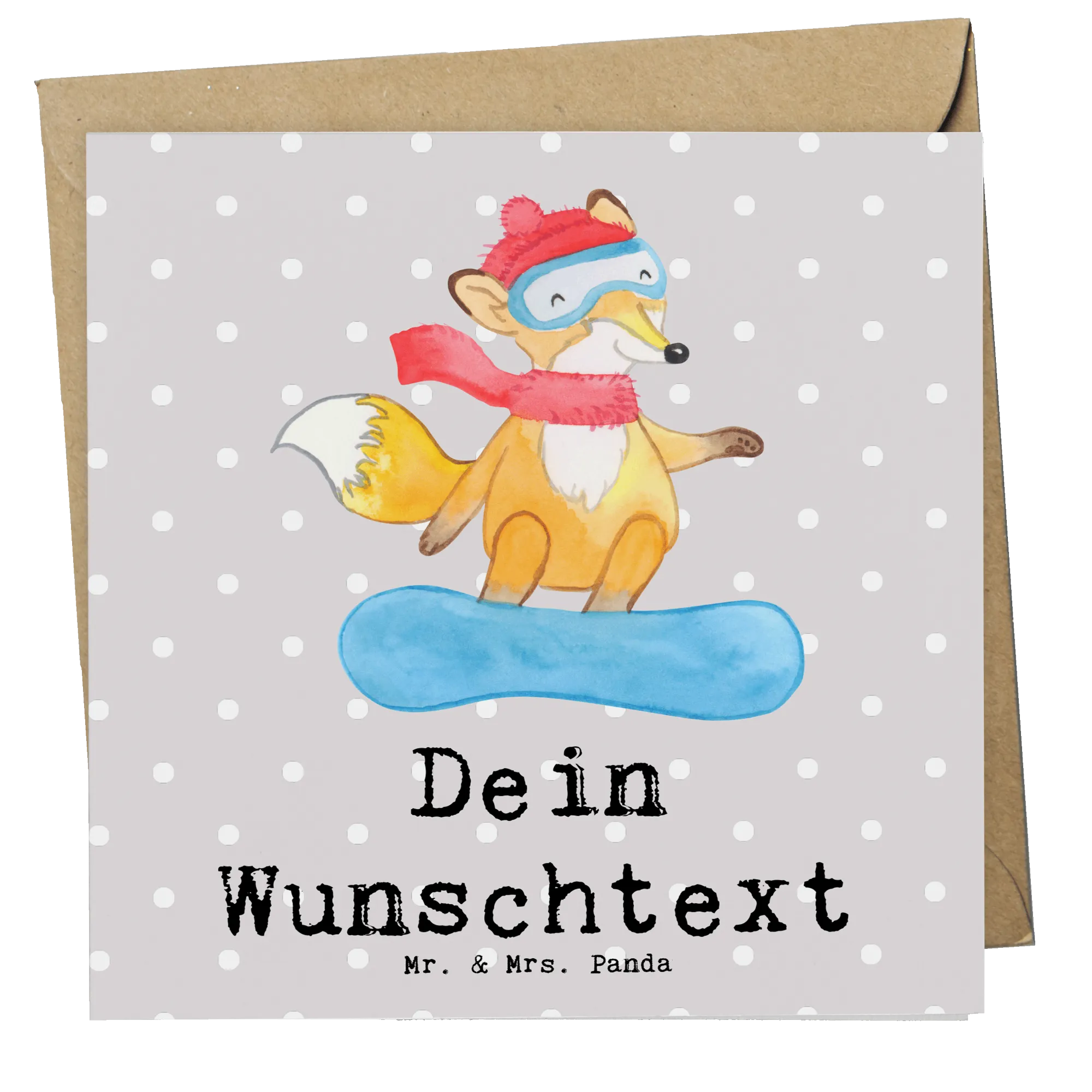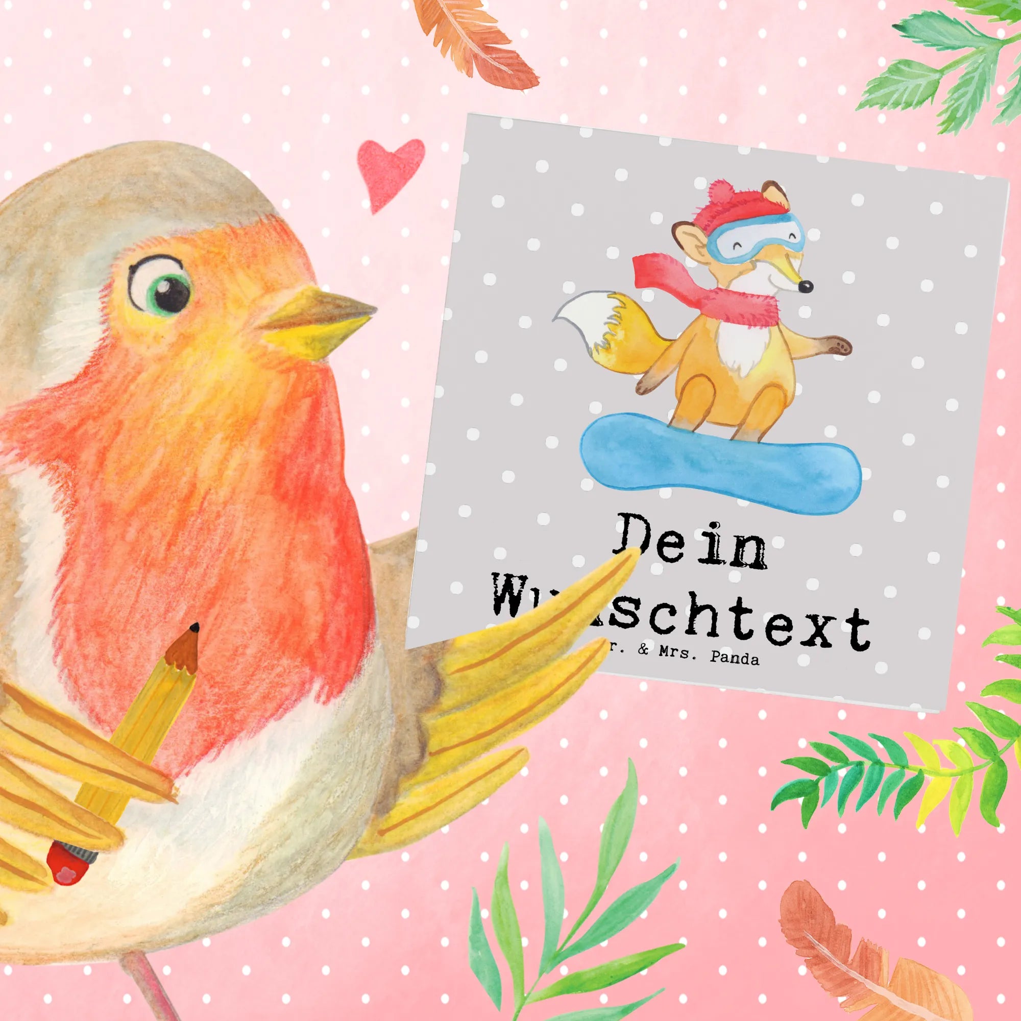 Die personalisierte Deluxe Karte Fuchs Snowboarden Tage von Mr. & Mrs. Panda ist das perfekte Geschenk für alle Snowboard-Liebhaber und Wintersport-Fans. Diese hochwertige, quadratische Karte in den Maßen 140 mm x 140 mm ist aus edlem 300 Gramm Karton gefertigt und begeistert mit einem liebevoll handgezeichneten Motiv: Ein süßer Fuchs, der voller Freude beim Snowboarden zu sehen ist.