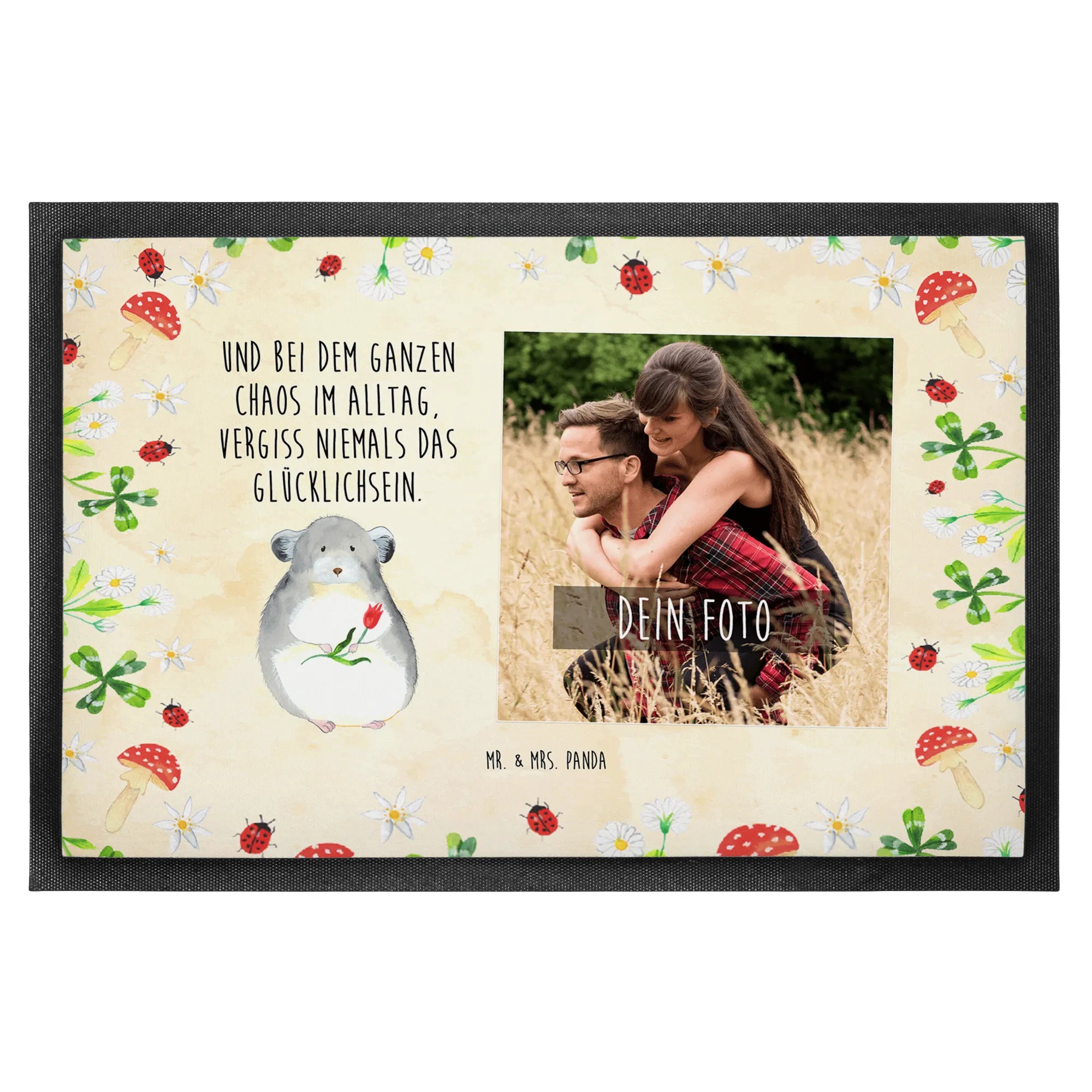 Die personalisierte Foto Fußmatte "Chinchilla mit Blume" aus der Kollektion Small World von Mr. & Mrs. Panda ist der perfekte Geschenktipp für Tierliebhaber und Menschen, die Freude in ihren Alltag bringen möchten! Diese Fußmatte kombiniert niedliches Design mit Funktionalität und schafft so eine einladende Atmosphäre in jedem Raum.