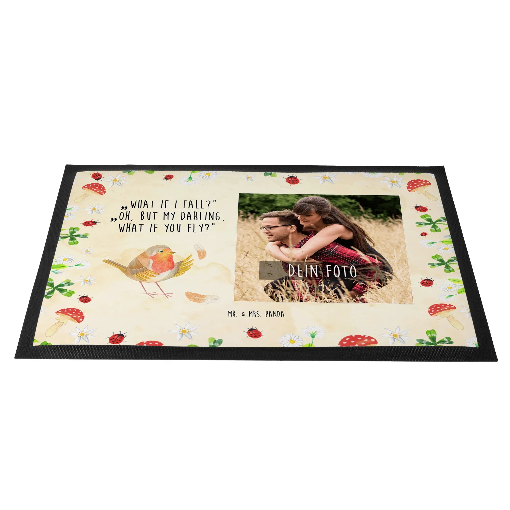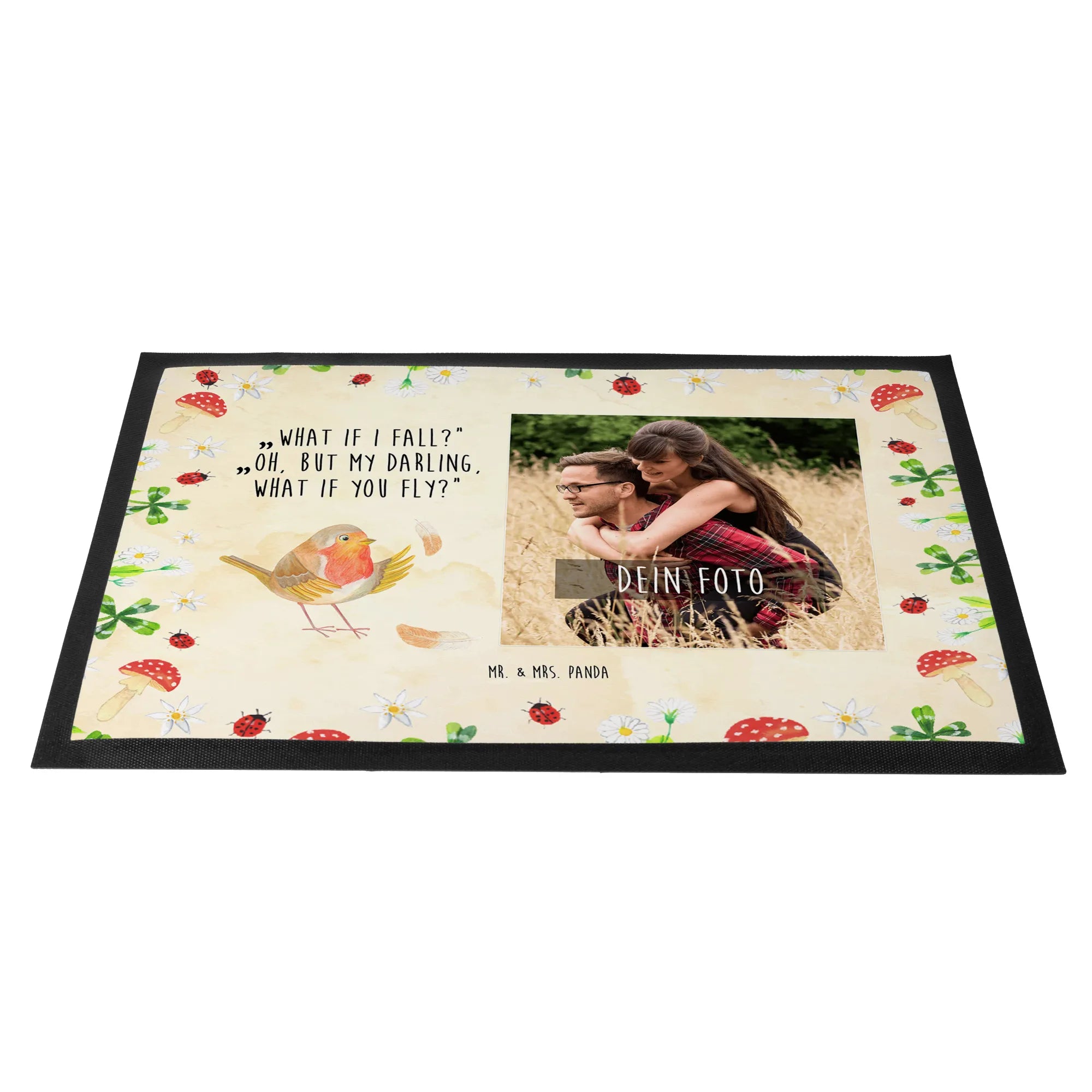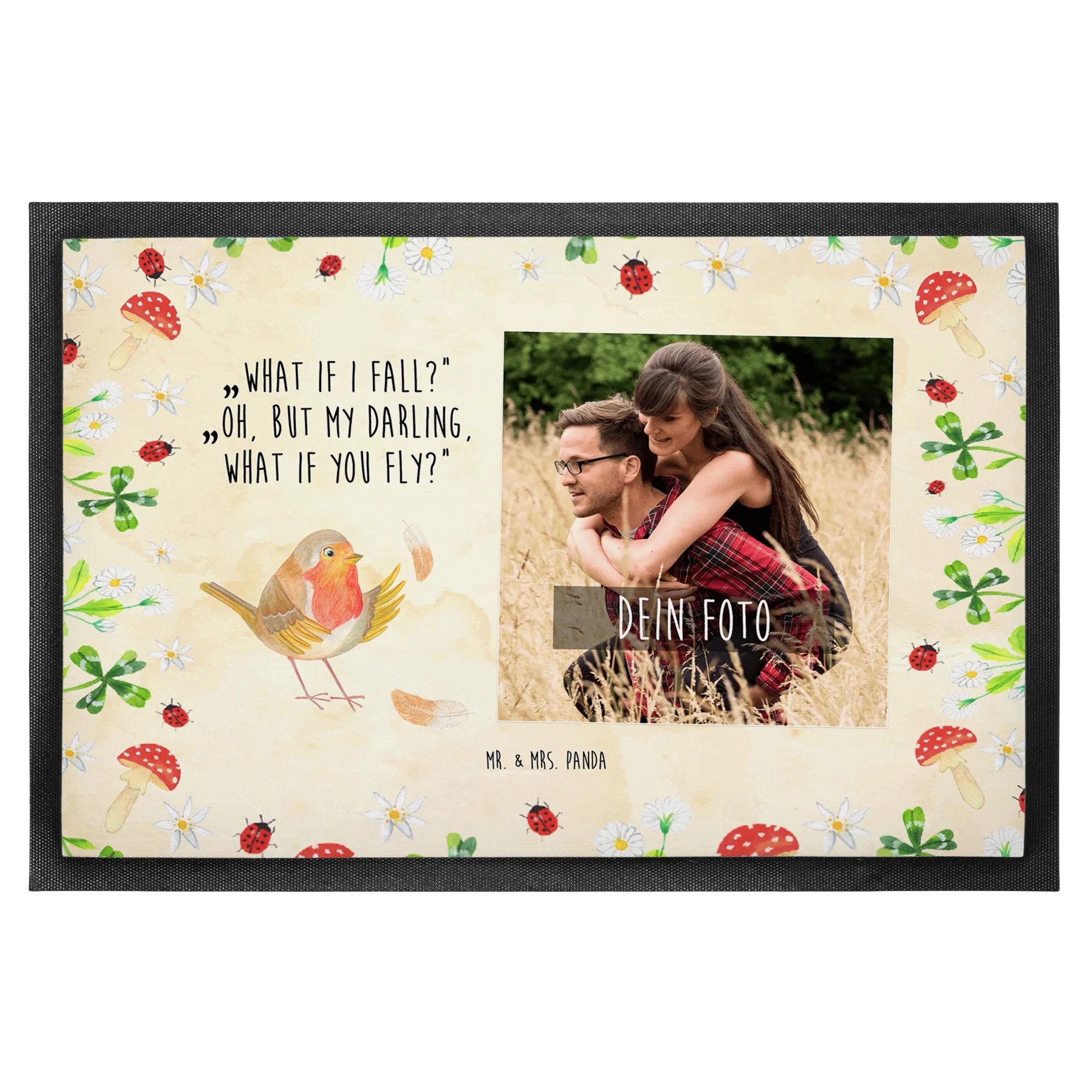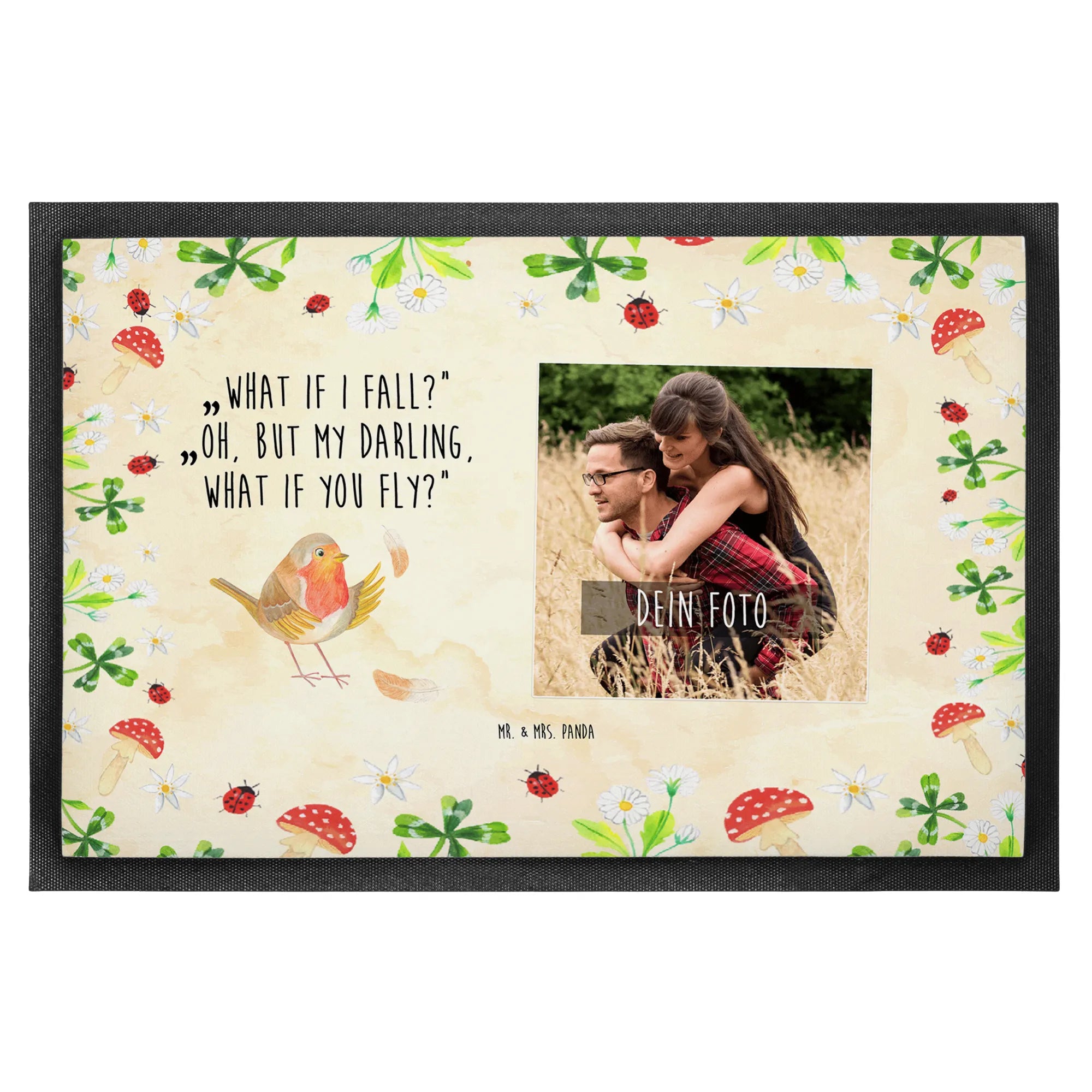 Die personalisierte Foto Fußmatte mit dem bezaubernden Rotkehlchen ist der perfekte Weg, um dein Zuhause zu verschönern und dabei eine Botschaft voller Mut und Inspiration zu vermitteln. Das süße Rotkehlchen, umgeben von bunten Federn, wurde mit viel Liebe von Mr. & Mrs. Panda handgezeichnet. Der Spruch „What if I fall? Oh, but my darling, what if you fly?“ ermutigt jeden Betrachter dazu, an sich zu glauben und seine Träume zu verfolgen.