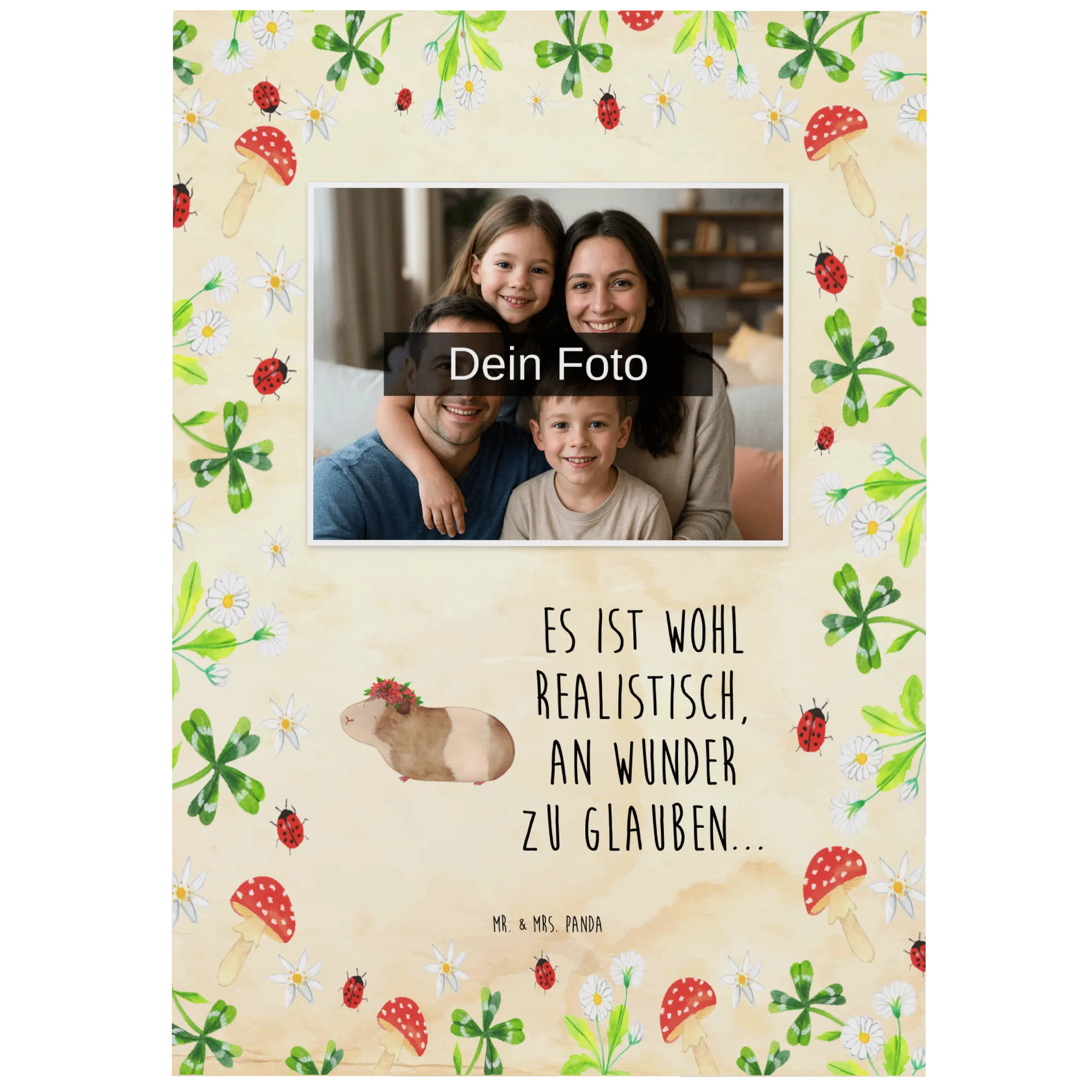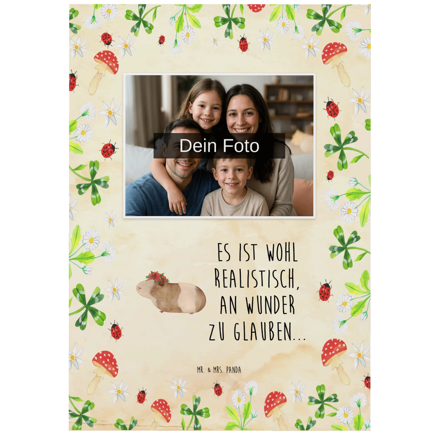 Diese wunderschöne Postkarte wird individuell mit deinem Foto gestaltet und zeigt das niedliche Meerschweinchen, das für Weisheit und Lebensfreude steht. Der Spruch "Es ist wohl realistisch, an Wunder zu glauben..." motiviert dazu, das Leben mit offenen Augen zu betrachten und sich auf die kleinen Wunder zu konzentrieren, die uns täglich begegnen.