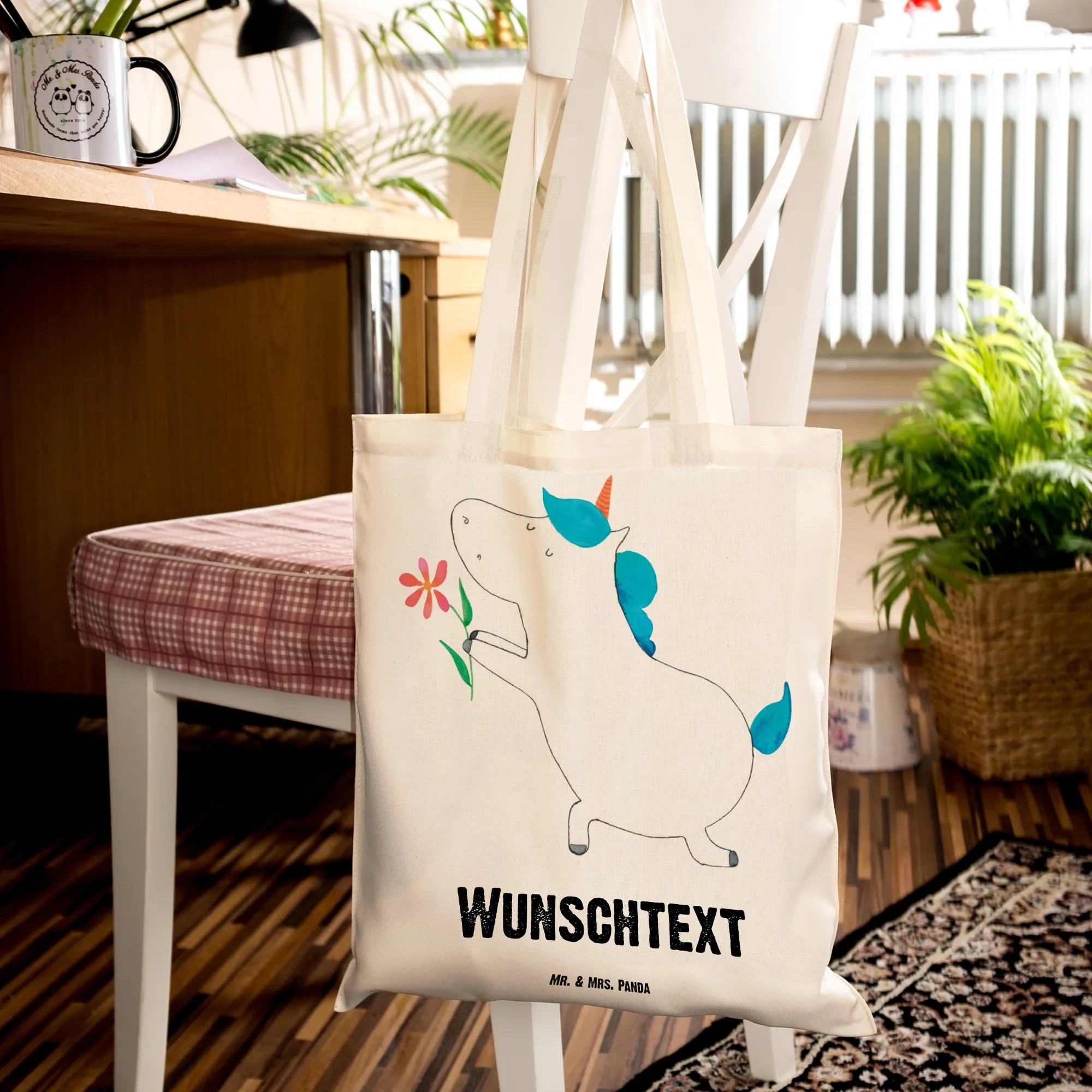 Die personalisierte Tragetasche „Einhorn Blume“ von Mr. & Mrs. Panda ist das perfekte Geschenk für alle, die Einhörner lieben und einen Hauch von Magie in ihrem Alltag haben möchten. Diese wunderschöne, personalisierte Tragetasche wird aus hochwertiger, 100 % Baumwolle hergestellt und kombiniert Funktionalität mit einem einzigartigen Design. Sie hat die Maße 420 mm x 380 mm und ist somit ideal für Einkäufe, den täglichen Gebrauch oder als stylisches Accessoire für das nächste Picknick.