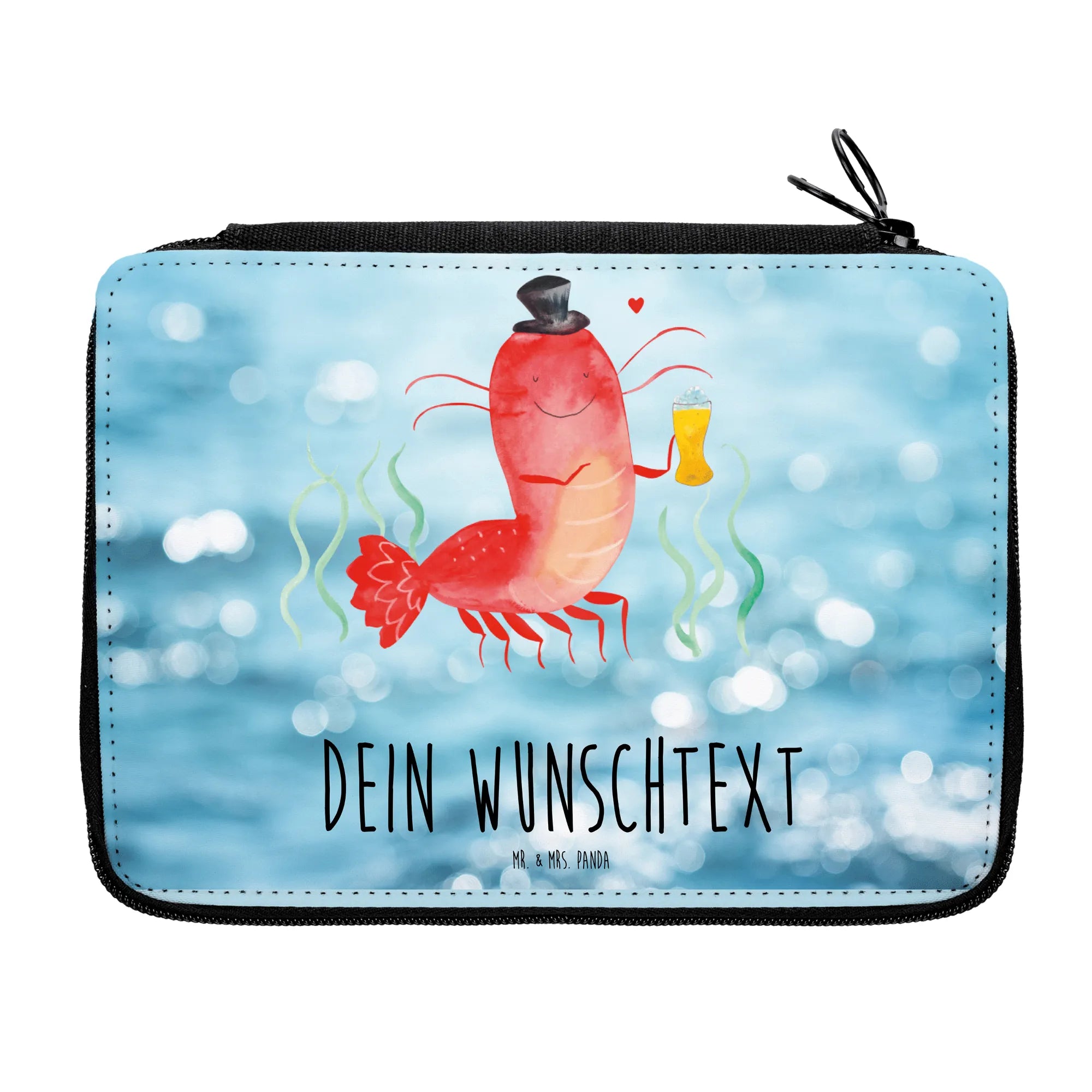 Auf der Federmappe prangt ein fröhlicher Hummer, der eine goldene Krone trägt und ein Glas mit einem sprudelnden Getränk in seinen Scheren hält. Umgeben von spielerischen Seegras-Elementen und einem kleinen roten Herz strahlt der Hummer pure Freude aus und wird so zum idealen Begleiter im Schulalltag.