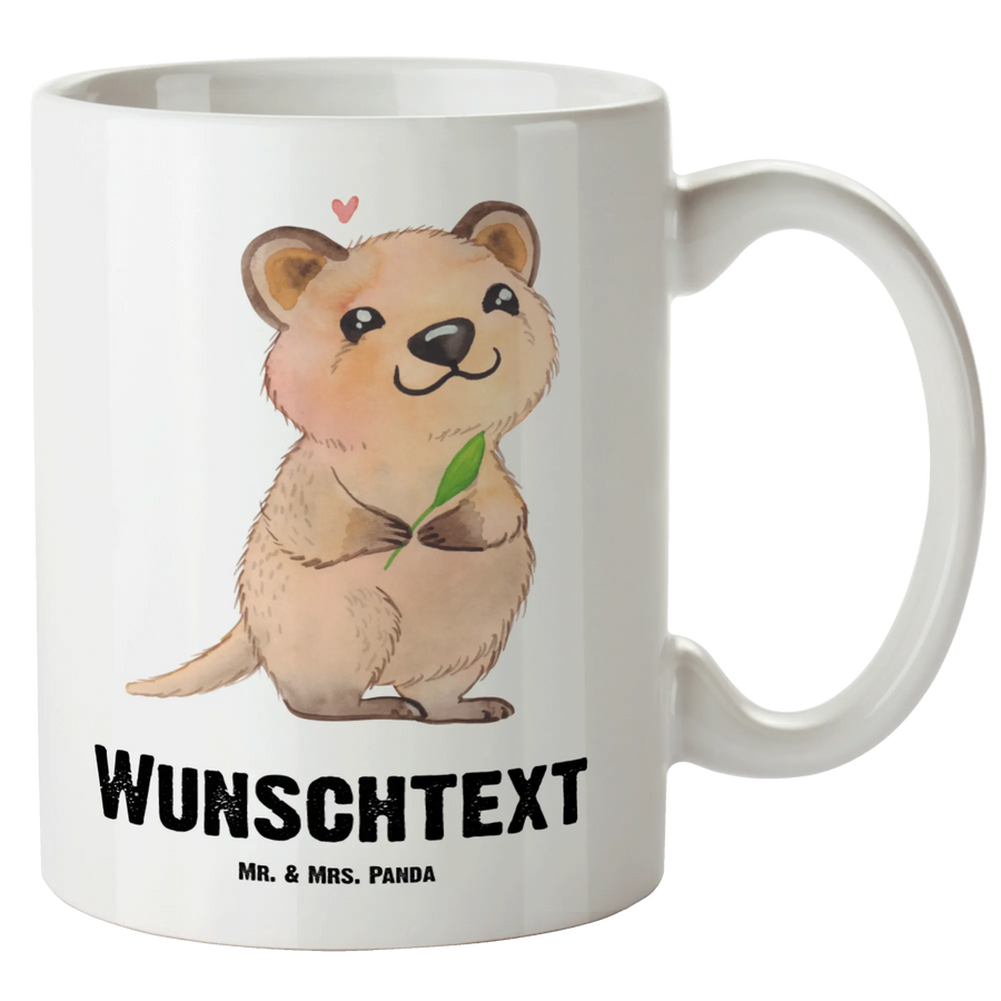 Die personalisierte XL Tasse Quokka Happy aus der Kollektion Small World ist das perfekte Geschenk für alle Tierliebhaber und Kaffeefreunde. Mit einem niedlichen Quokka, das aufrecht steht und mit einem herzlichen Lächeln ein grünes Blatt hält, strahlt diese Tasse pure Lebensfreude aus.