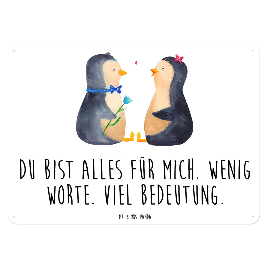 Entdecke das wundervolle Blechschild aus der Pinguin-Kollektion von Mr. & Mrs. Panda, das mit einem bezaubernden Pinguin Pärchen verziert ist. Es zeigt zwei süße Pinguine, die sich liebevoll anschauen, während sie auf dem Schild den Satz 'Du bist alles für mich. Wenig Worte. Viel Bedeutung.' präsentieren. Damit ist dieses Schild das perfekte Liebesgeschenk für deinen Partner oder deine Partnerin, egal ob zu einem Jahrestag, einer Verlobung oder einfach nur, um deine Gefühle auszudrücken.