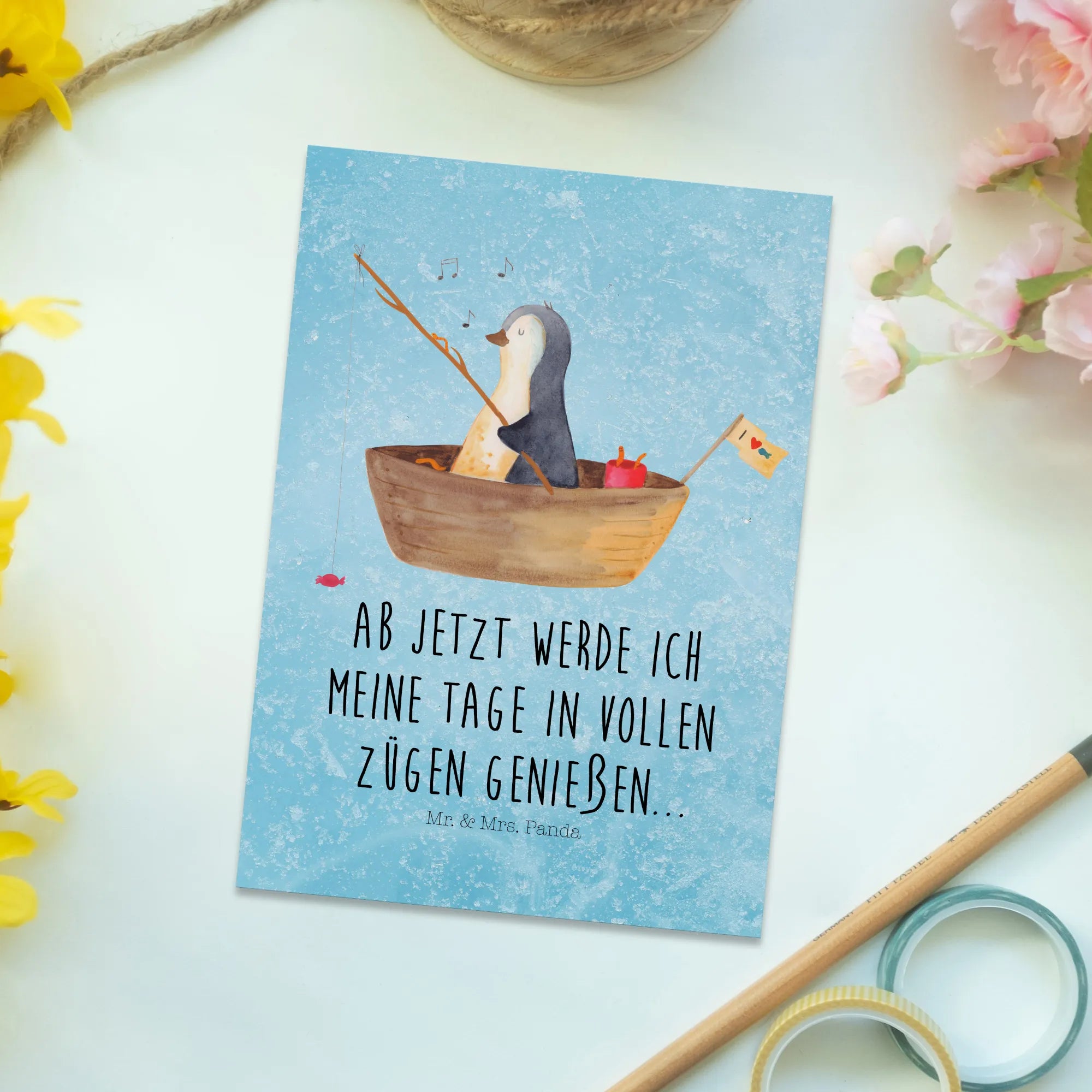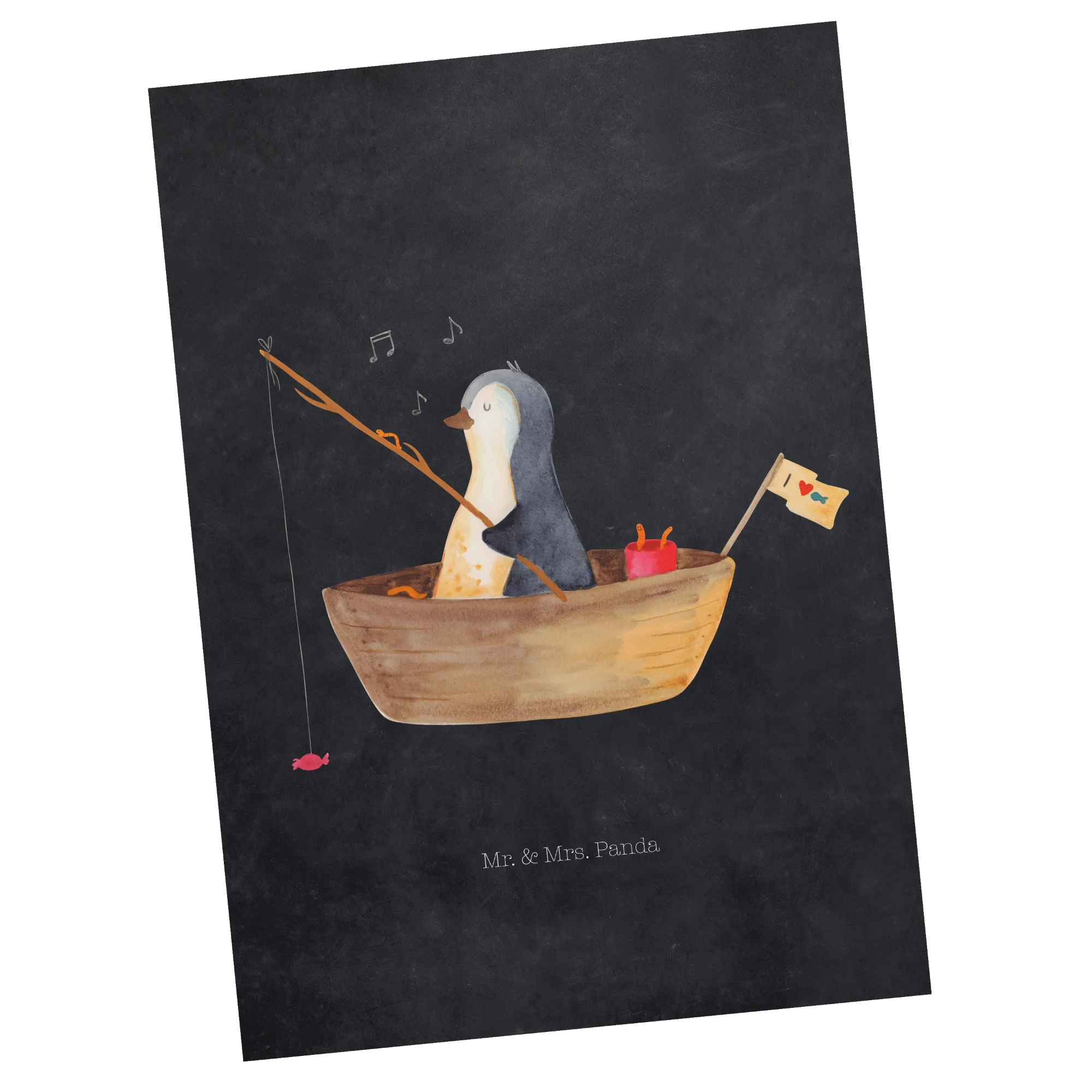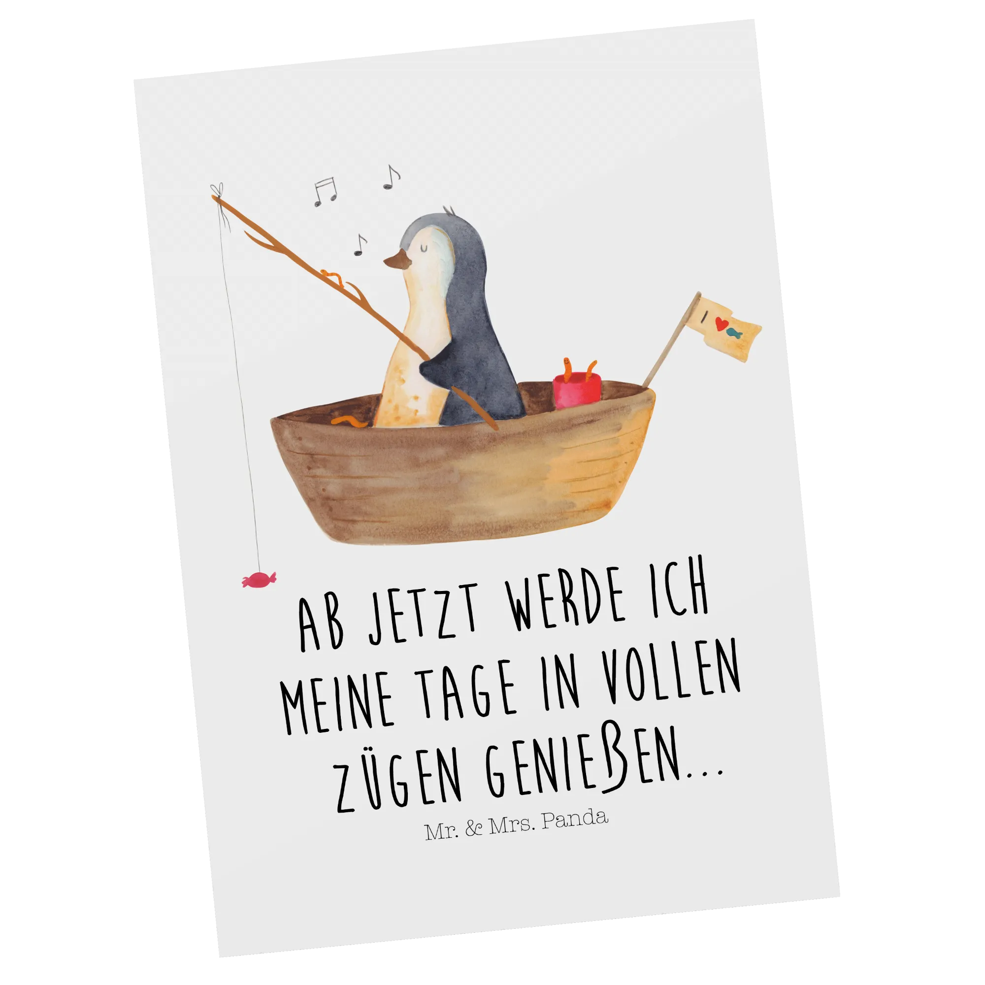 Pocztówka pingwin łódka wędkarska - z napisem - biały