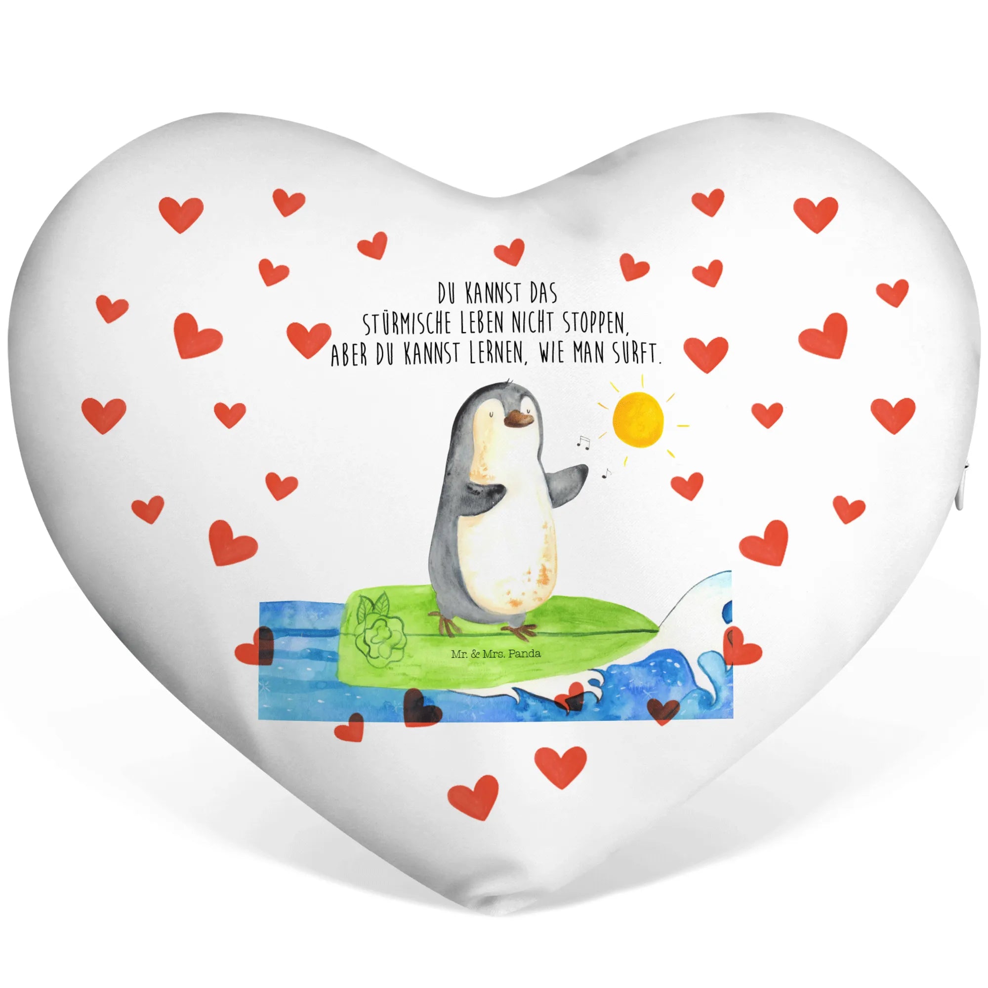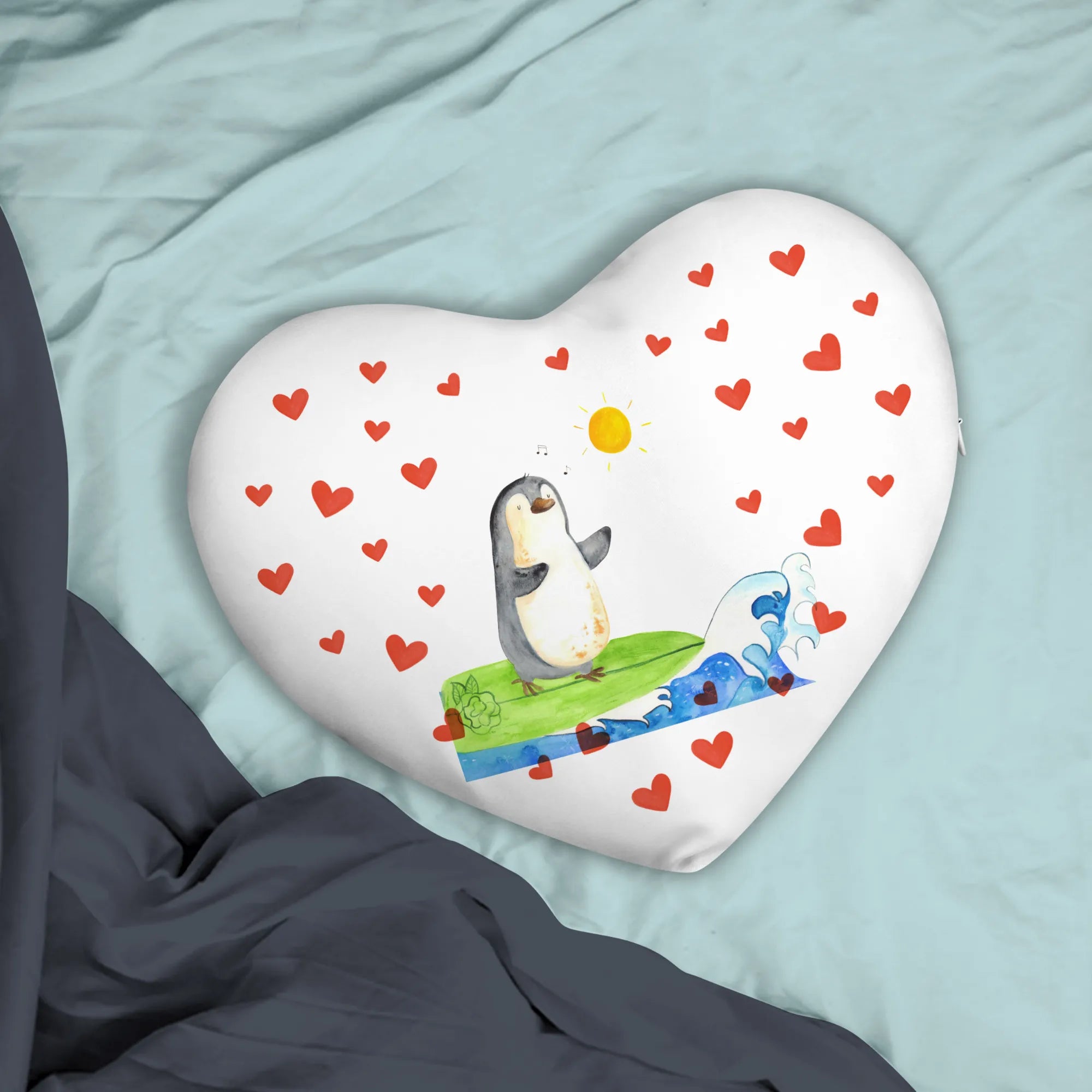 Poduszka w kształcie serca Pingwin surfista - z napisem