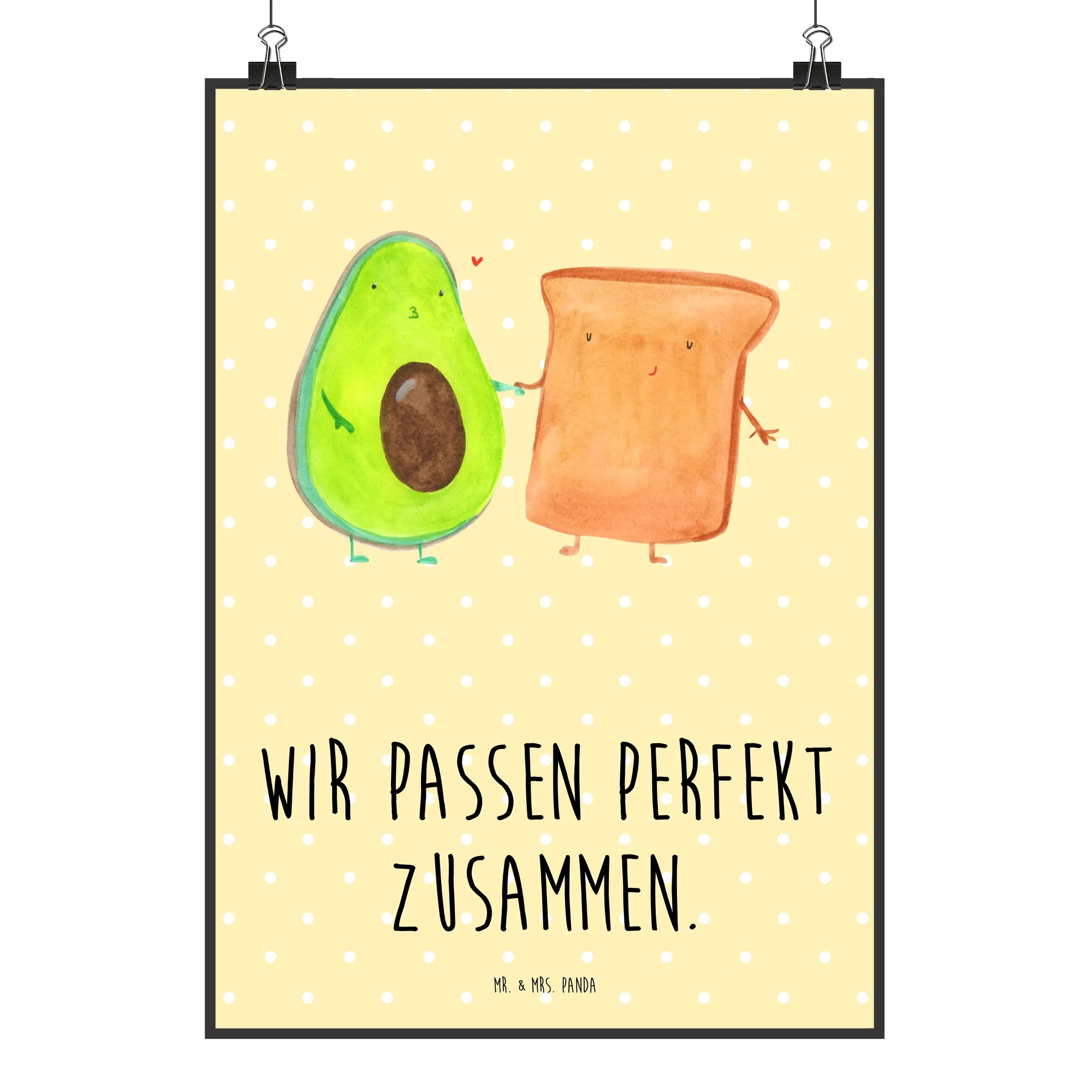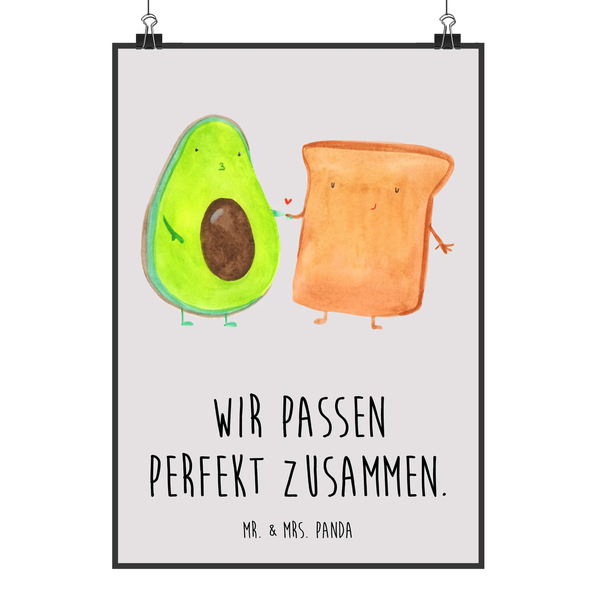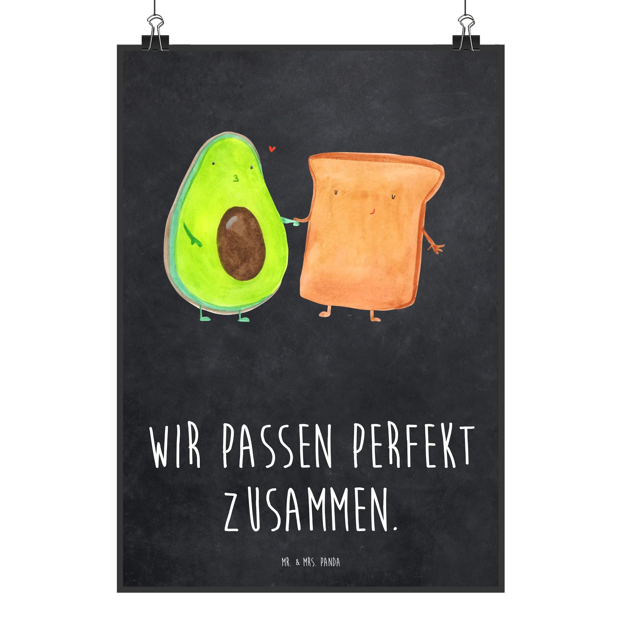 Ein wunderschönes und edles Poster von Mr. & Mrs. Panda: Das Avocado + Toast Poster mit dem liebevollen Spruch „Wir passen perfekt zusammen.“ bringt Charme und gute Laune an deine Wand. Auf einem hellen Hintergrund halten sich eine süße Avocado und ein niedlicher Toast an den Händen – ein Motiv, das sofort ein Lächeln schenkt.