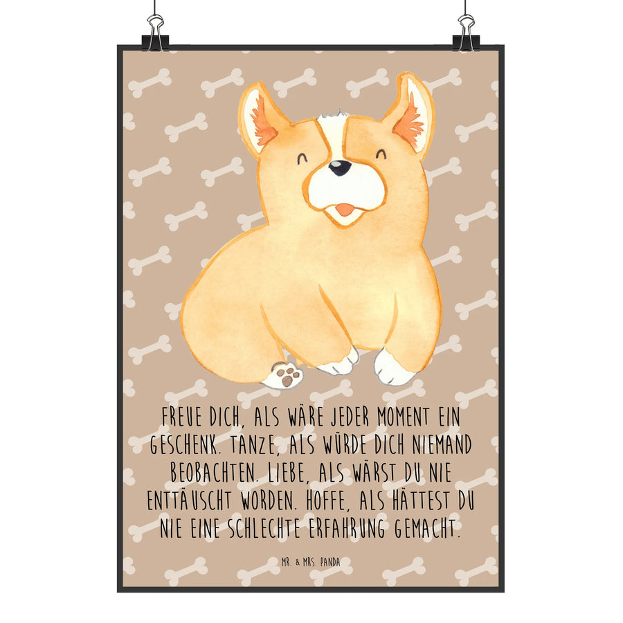 Ein wundervolles Poster von Mr. & Mrs. Panda: Unser Corgie Poster aus der Hunde Kollektion vereint zarte Aquarellzeichnung mit einem lebensbejahenden Spruch und ist damit das perfekte Geschenk für Hunde- und Corgi-Fans. Die Illustration von Mrs. Panda zeigt einen niedlichen Welsh Corgie Pembroke in warmen, freundlichen Tönen und bringt sofort Wohlfühl-Atmosphäre in Dein Zuhause.