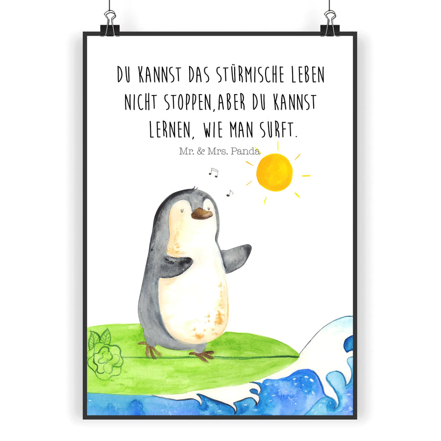 Plakat Pingwin surfista - DIN A0 - z napisem - Biały