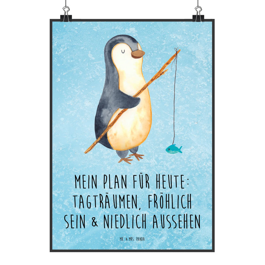 Plakat Pingwin Wędkarz - DIN A5 - z napisem - Eisblau