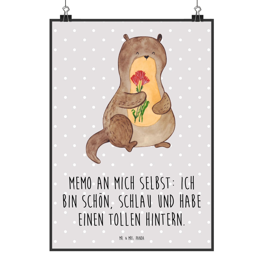 Dieses bezaubernde Design Poster zeigt einen süßen Seeotter mit einem bunten Blumenstrauß in den Pfötchen und den frechen Spruch: "Memo an mich selbst: ich bin schön, schlau und habe einen tollen Hintern." Die Illustration stammt aus der Otter - Kollektion und wurde liebevoll von Mrs. Panda aquarellhandgezeichnet. Das Ergebnis ist ein fröhliches, typografisches Poster, das sofort gute Laune verbreitet.