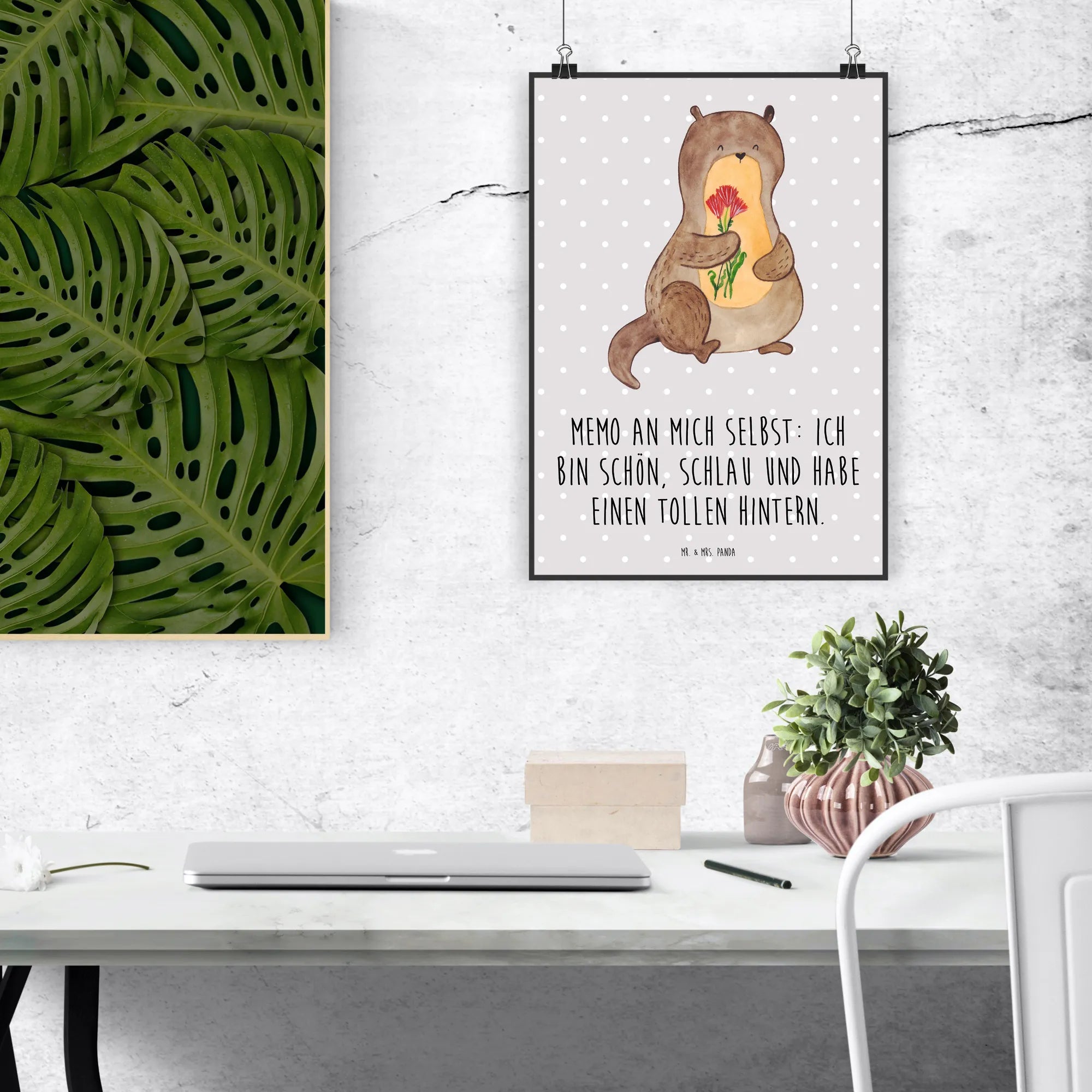 Ein wunderschönes Poster von Mr. & Mrs. Panda: Das Otter Blumenstrauß Poster aus der Otter - Kollektion bringt sofort gute Laune an deine Wand. Ein niedlicher Seeotter hält einen kunterbunten Blumenstrauß und schaut dich glücklich an. Mrs. Panda hat das Motiv mit Liebe als Aquarell gezeichnet – die Farben sind frisch, freundlich und voller Leichtigkeit.
