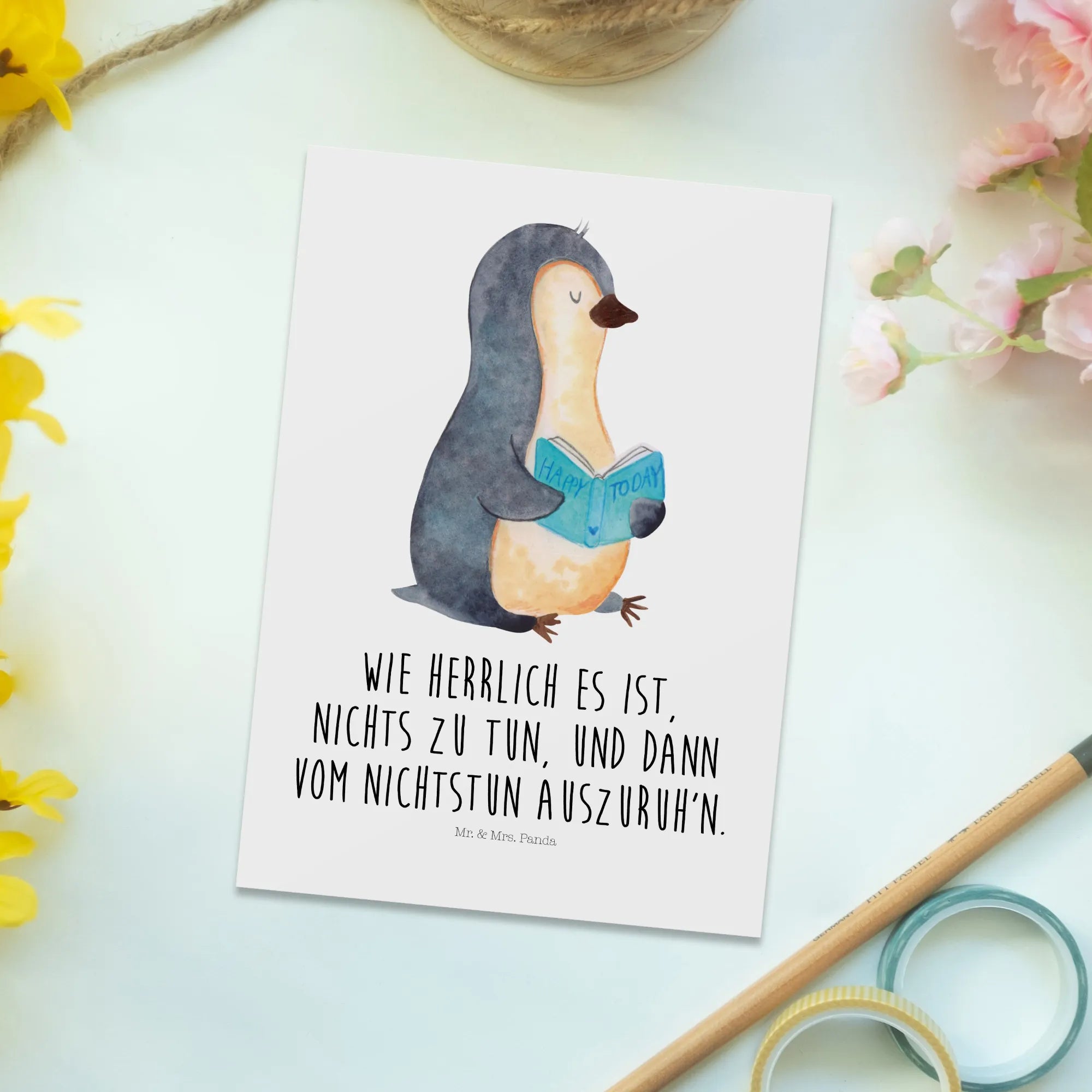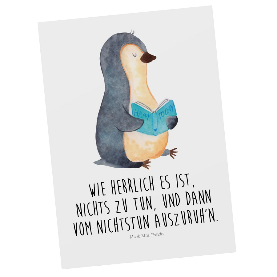 Pocztówka pingwin książka - z napisem - biały