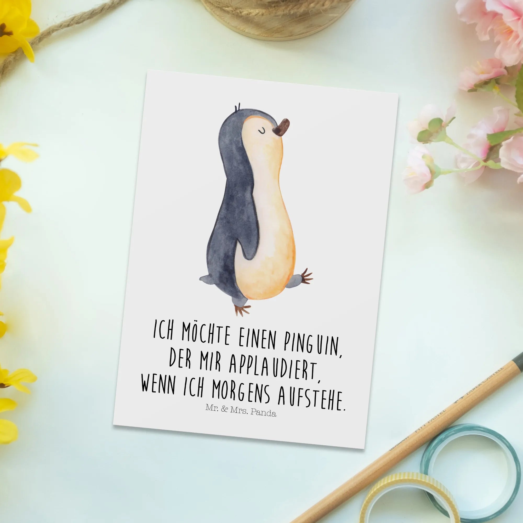 Pocztówka Pingwin maszerować - z napisem - biały