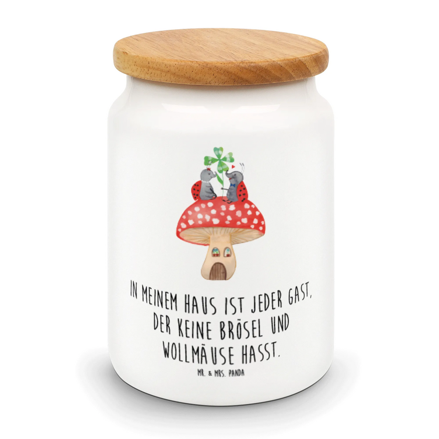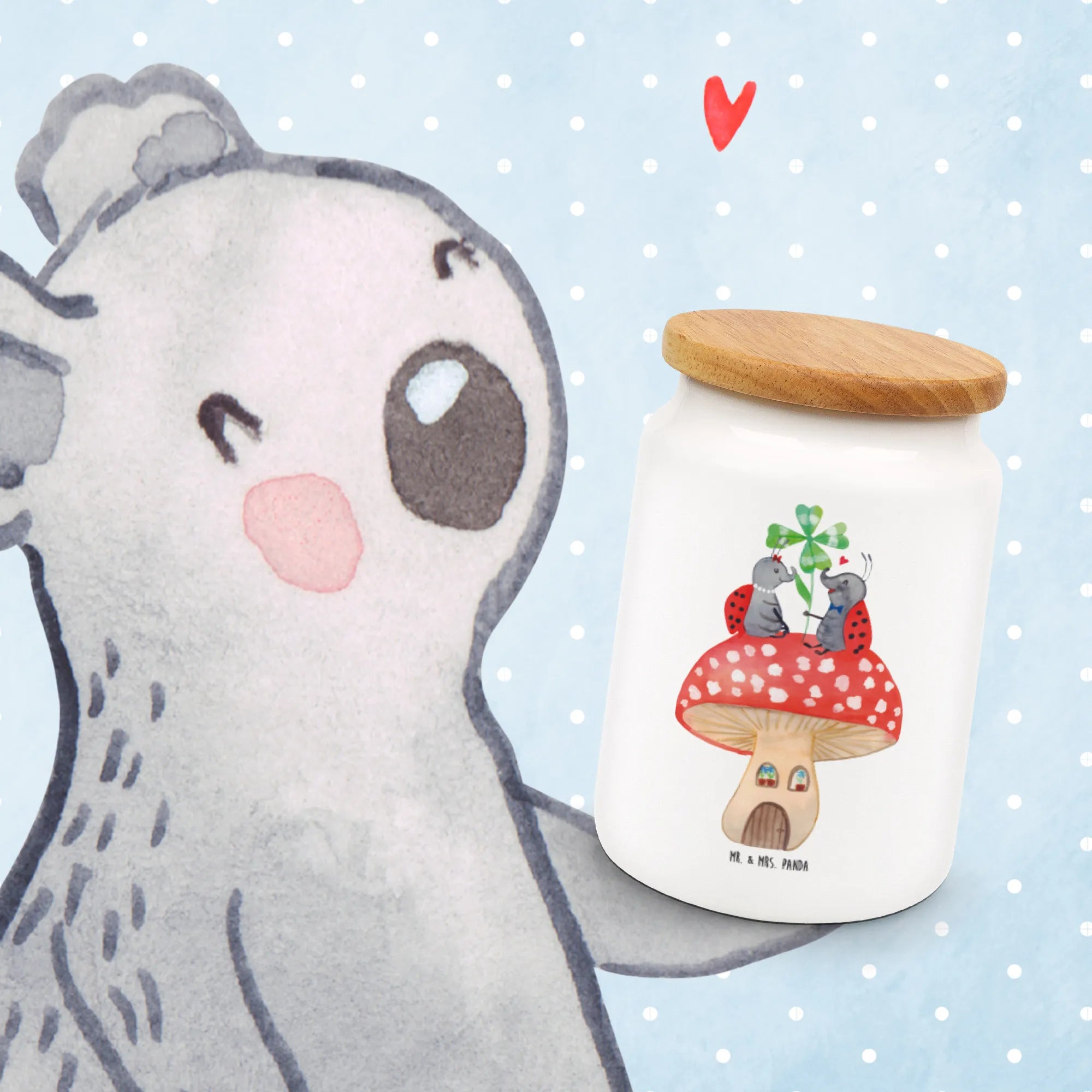 Entdecke die zauberhafte Vorratsdose im Marienkäfer Paar Fliegenpilz Design von Mr. & Mrs. Panda! Diese liebevoll bedruckte Keramikdose begeistert nicht nur durch ihr charmantes Design, sondern bietet auch praktischen Nutzen. Mit einer Füllmenge von 650 ml ist sie perfekt zum Aufbewahren von Keksen, Mehl oder anderen Leckereien geeignet.