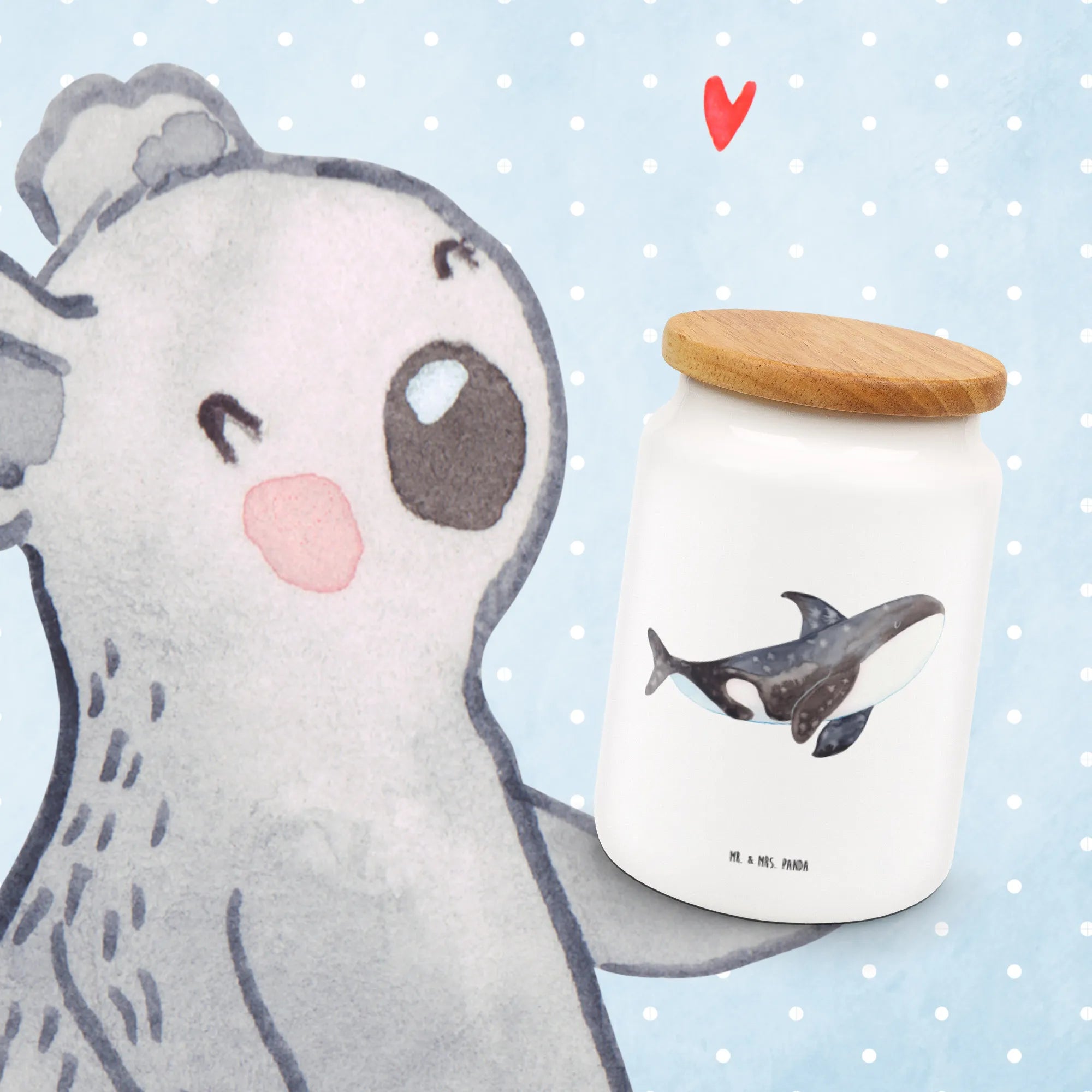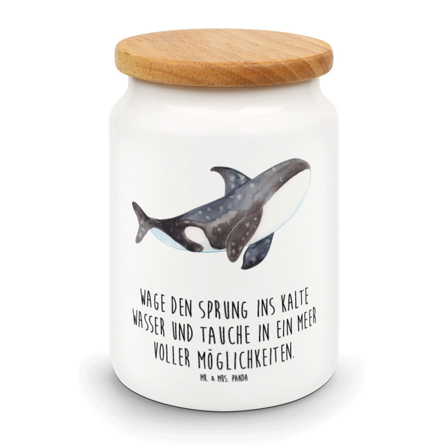 Entdecke die liebevolle Vorratsdose mit dem fantastischen Orca-Motiv von Mr. & Mrs. Panda! Diese wunderschöne Keramikdose ist nicht nur praktisch, sondern auch ein echter Hingucker in jeder Küche oder im Büro. Mit einer Höhe von 145 mm und einem Durchmesser von 95 mm bietet sie genügend Platz für all deine Lieblingssnacks, Kekse oder Mehl.