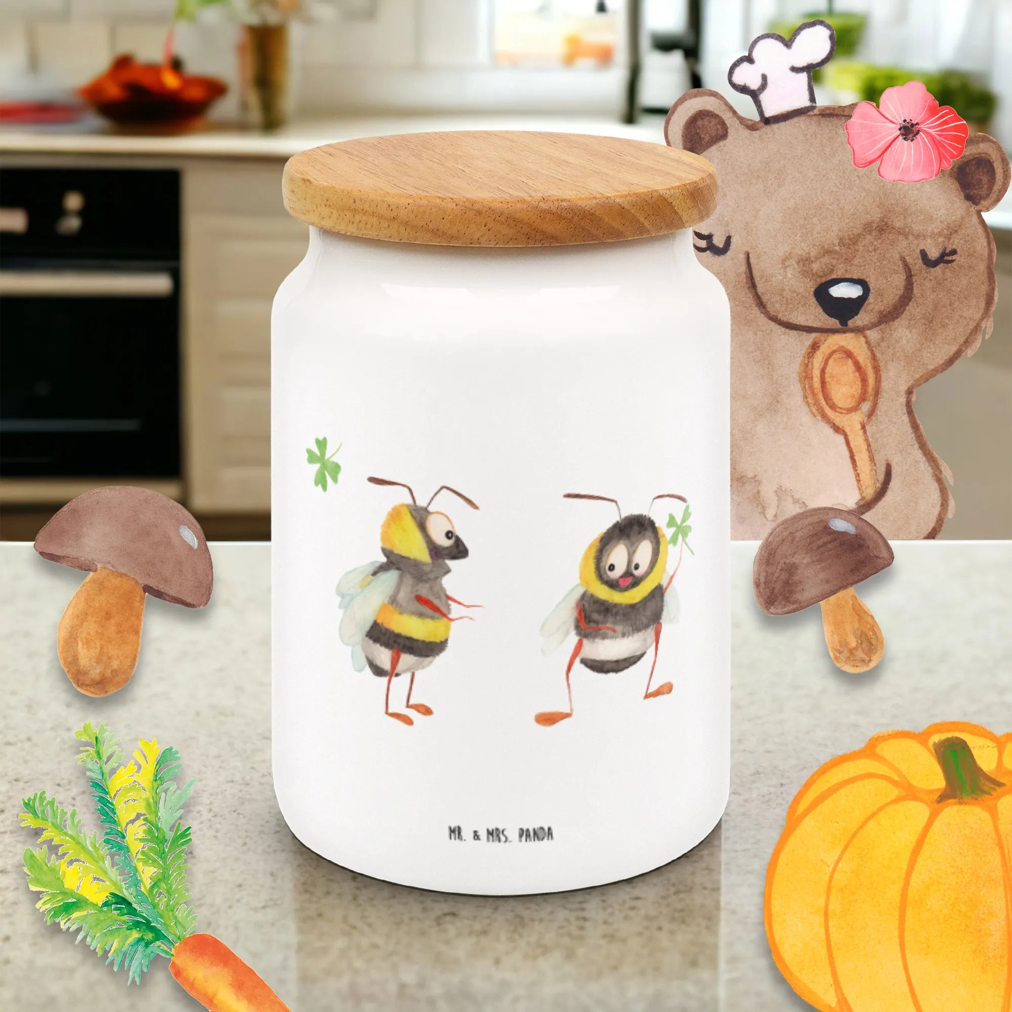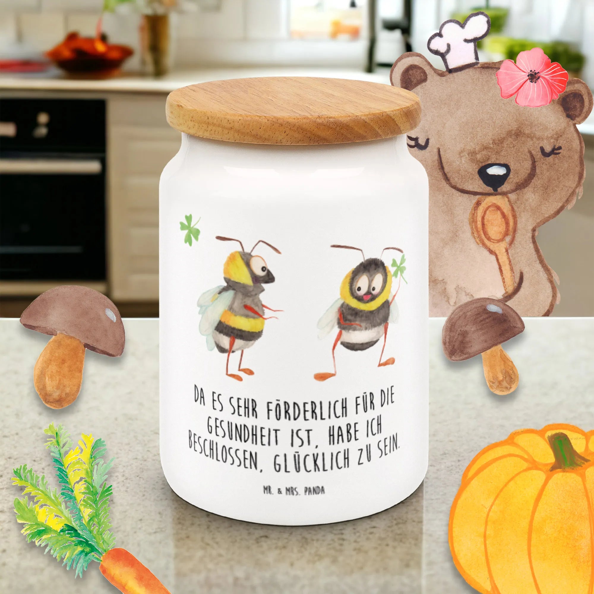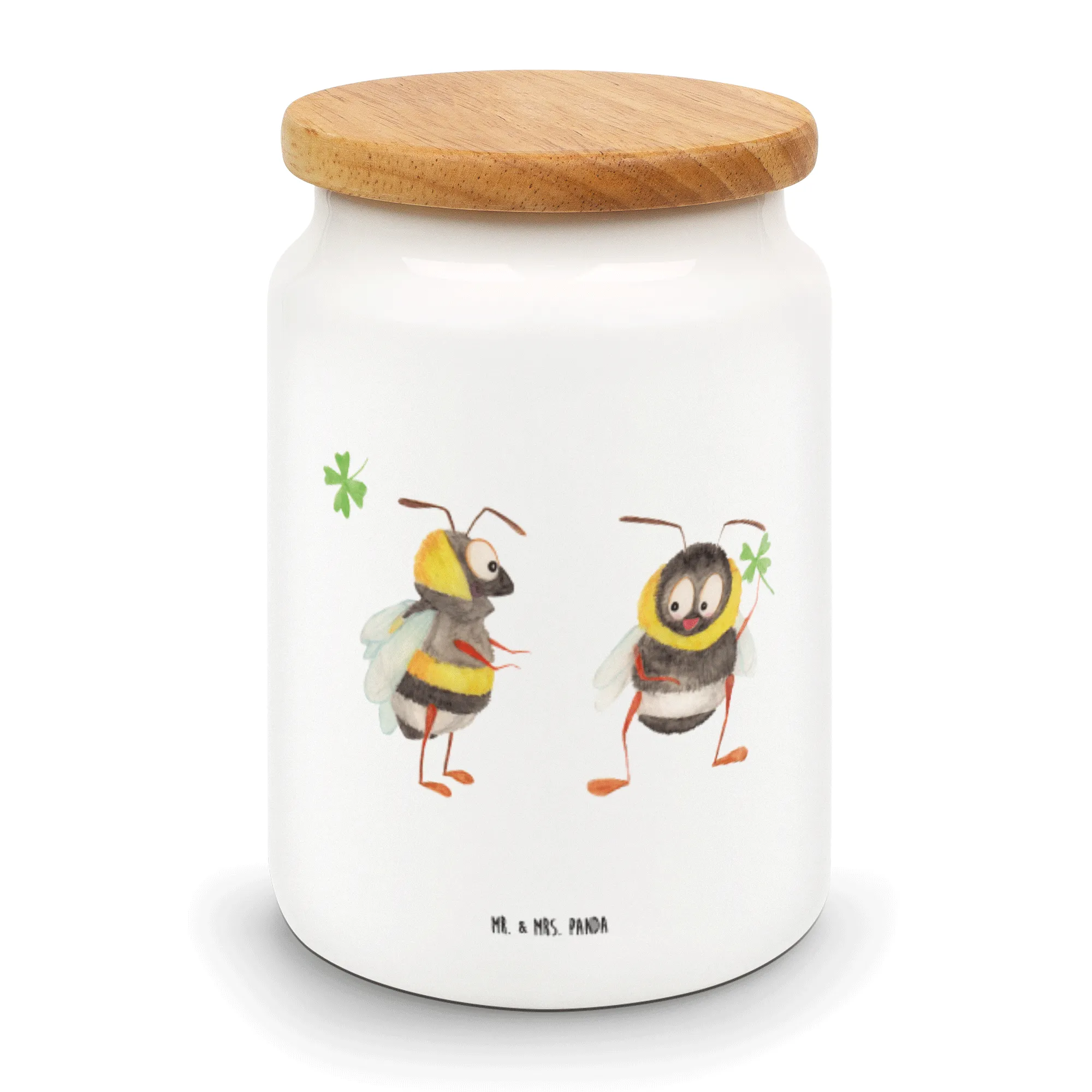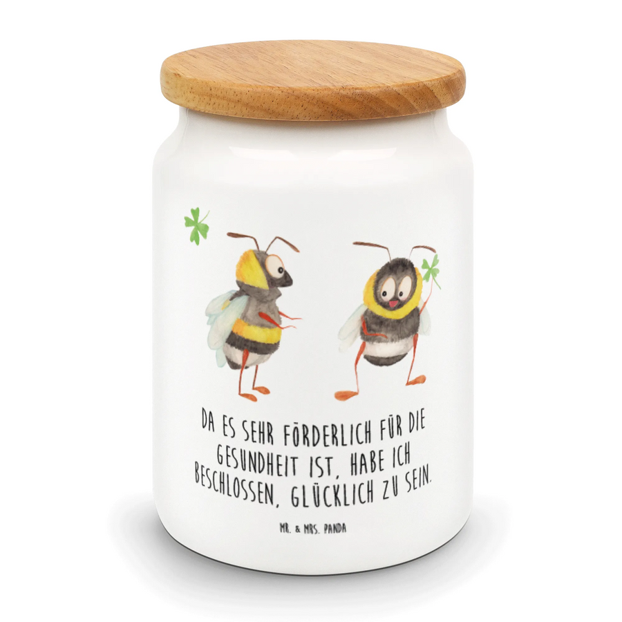 Entdecke die bezaubernde Vorratsdose mit dem Motiven von zwei süßen Hummeln, die ein Kleeblatt halten. Diese liebevoll bedruckte Vorratsdose von Mr. & Mrs. Panda ist nicht nur ein echter Hingucker in deiner Küche, sondern auch extrem praktisch! Mit einer Höhe von 145 mm und einem Durchmesser von 95 mm bietet sie genug Platz für all deine Leckereien. Die Füllmenge von 650 ml macht sie perfekt für Kekse, Mehl oder andere Küchenutensilien. Die hochwertige Keramik sorgt für eine angenehme Haptik, während der Massiv-Holzdeckel mit Kunststoffdichtung dafür sorgt, dass deine Lebensmittel frisch bleiben.