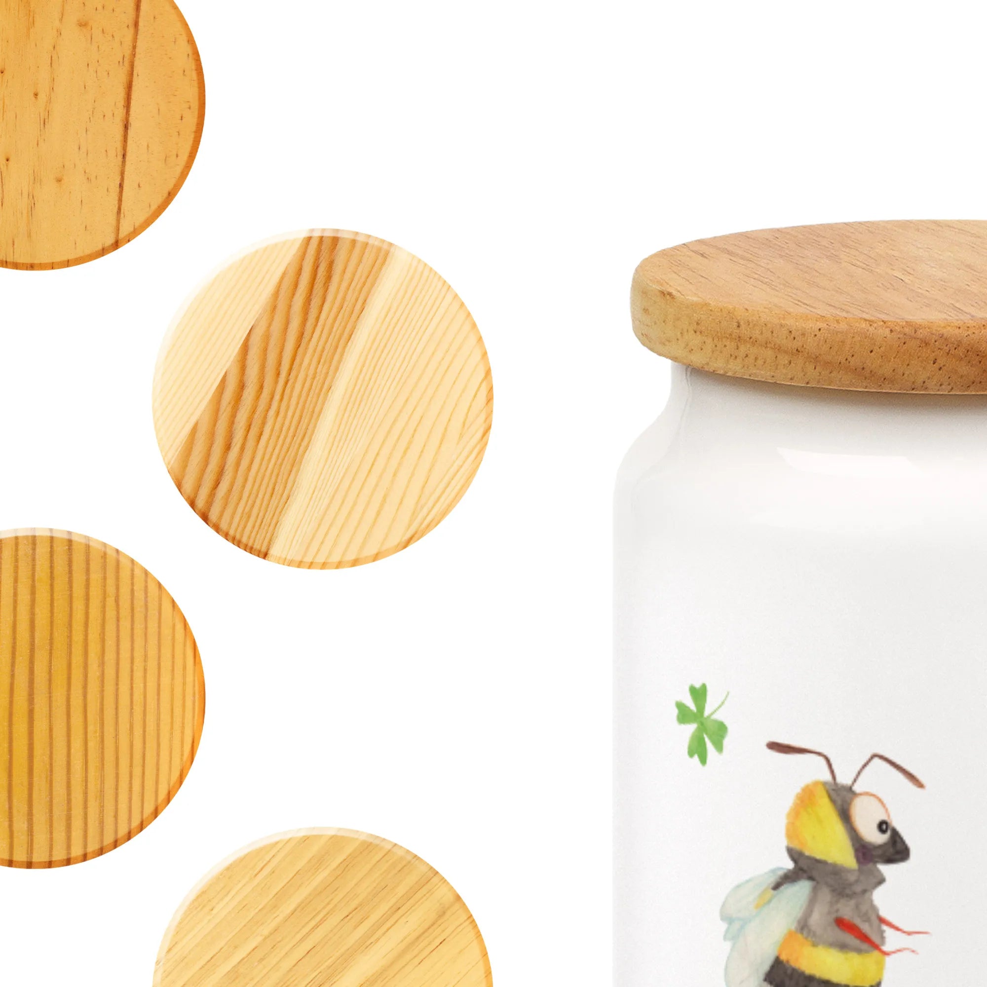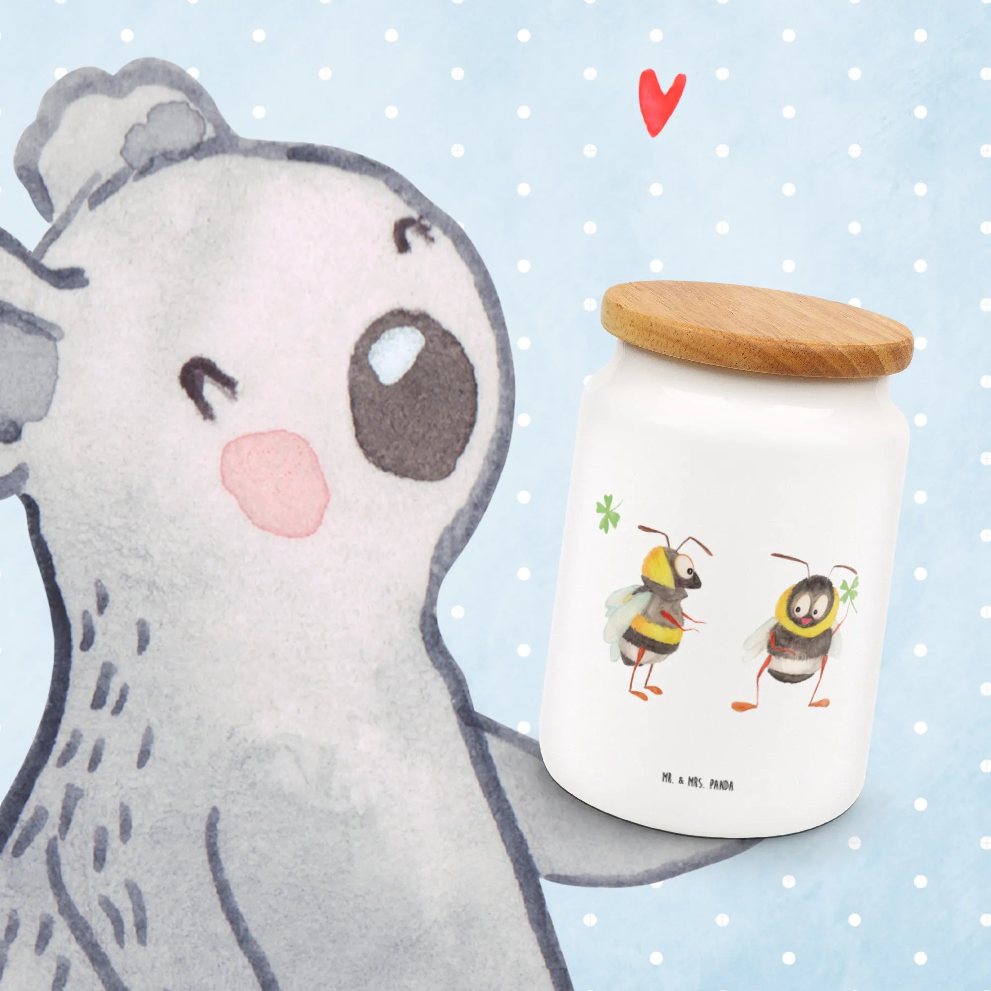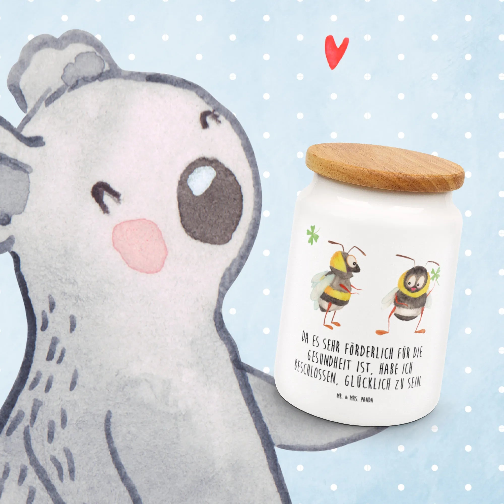 Entdecke die bezaubernde Vorratsdose mit dem Motiven von zwei süßen Hummeln, die ein Kleeblatt halten. Diese liebevoll bedruckte Vorratsdose von Mr. & Mrs. Panda ist nicht nur ein echter Hingucker in deiner Küche, sondern auch extrem praktisch! Mit einer Höhe von 145 mm und einem Durchmesser von 95 mm bietet sie genug Platz für all deine Leckereien. Die Füllmenge von 650 ml macht sie perfekt für Kekse, Mehl oder andere Küchenutensilien. Die hochwertige Keramik sorgt für eine angenehme Haptik, während der Massiv-Holzdeckel mit Kunststoffdichtung dafür sorgt, dass deine Lebensmittel frisch bleiben.
