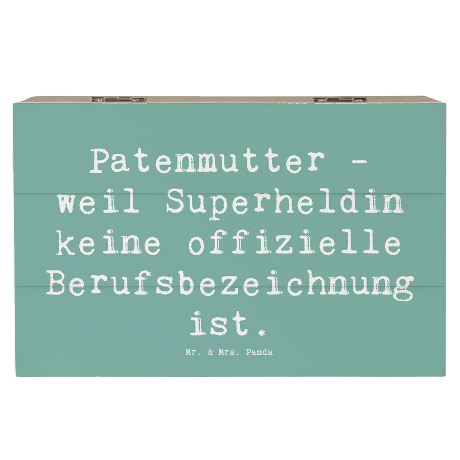 Die Holzkiste "Patenmutter - weil Superheldin keine offizielle Berufsbezeichnung ist" von Mr. & Mrs. Panda ist nicht nur eine Aufbewahrungsbox, sondern ein ganz besonderes Geschenk für alle Patenmütter. Diese wunderschöne Schatzkiste ist der perfekte Ort, um wertvolle Erinnerungen, Fotos und kleine Geschenke aufzubewahren. Mit ihren robusten Materialien und der stabilen Bauweise sorgt sie dafür, dass alle Schätze sicher verstaut sind und gleichzeitig als ansprechende Deko dient.