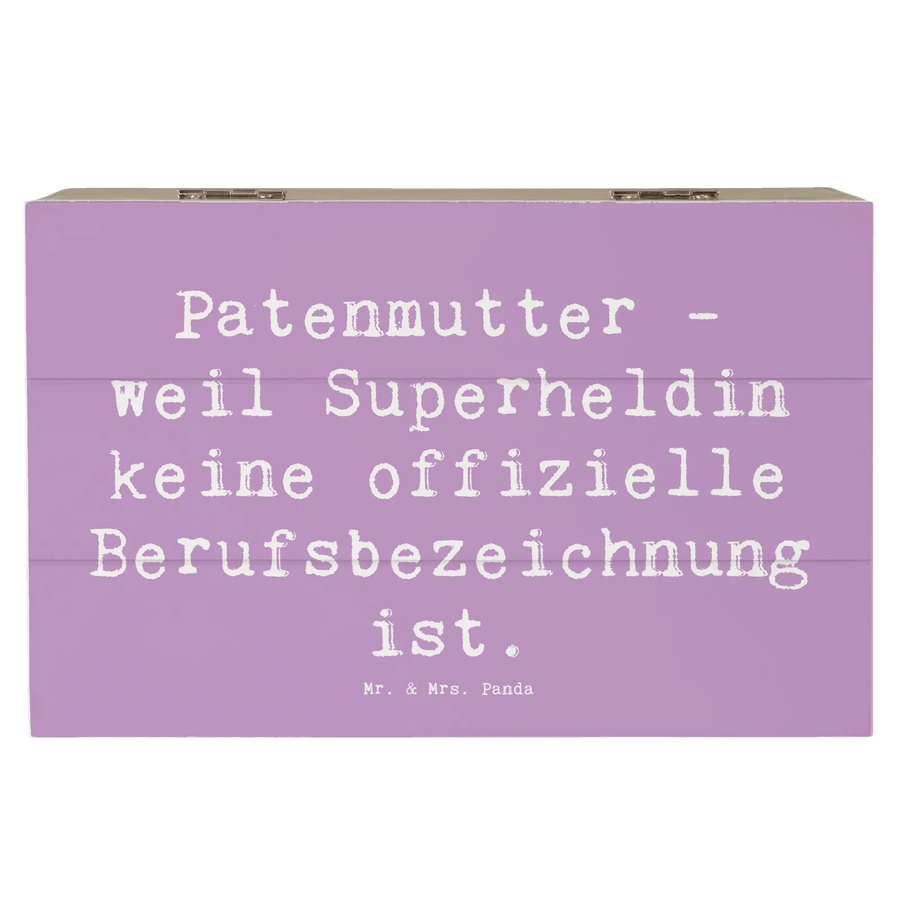Die Holzkiste "Patenmutter - weil Superheldin keine offizielle Berufsbezeichnung ist" von Mr. & Mrs. Panda ist nicht nur eine Aufbewahrungsbox, sondern ein ganz besonderes Geschenk für alle Patenmütter. Diese wunderschöne Schatzkiste ist der perfekte Ort, um wertvolle Erinnerungen, Fotos und kleine Geschenke aufzubewahren. Mit ihren robusten Materialien und der stabilen Bauweise sorgt sie dafür, dass alle Schätze sicher verstaut sind und gleichzeitig als ansprechende Deko dient.