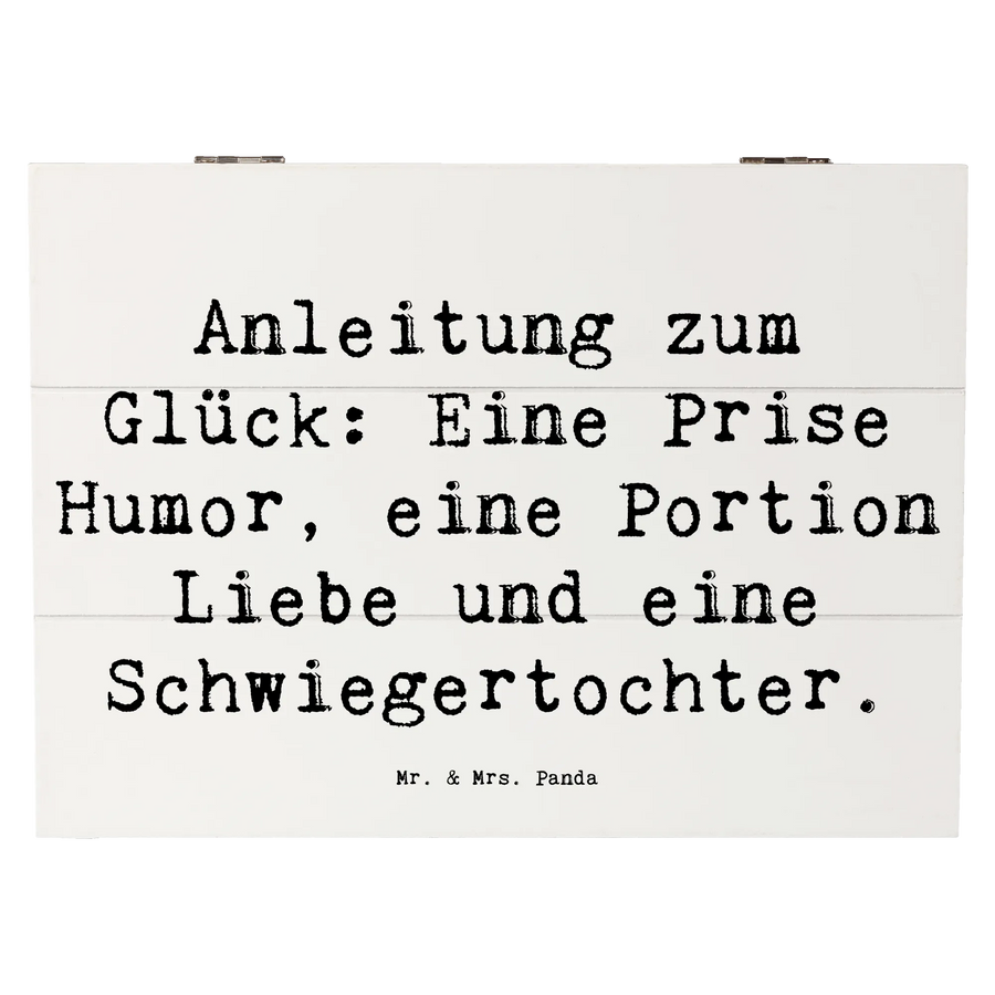 Der Spruch "Anleitung zum Glück: Eine Prise Humor, eine Portion Liebe und eine Schwiegertochter" strahlt einfach nur Liebe und Zuneigung aus. So wird diese Kiste zu einem besonderen Platz für Erinnerungen, die geliebt, geschätzt und bewahrt werden sollten.