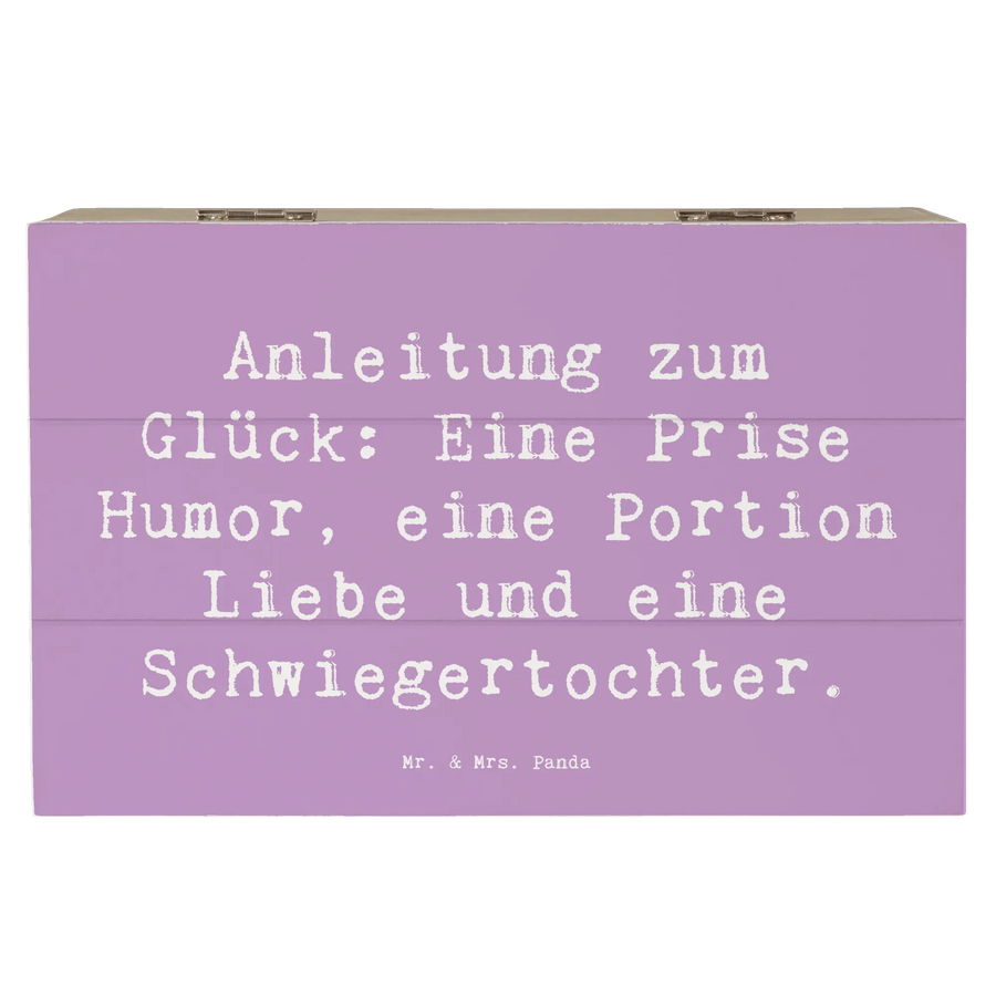 Der Spruch "Anleitung zum Glück: Eine Prise Humor, eine Portion Liebe und eine Schwiegertochter" strahlt einfach nur Liebe und Zuneigung aus. So wird diese Kiste zu einem besonderen Platz für Erinnerungen, die geliebt, geschätzt und bewahrt werden sollten.