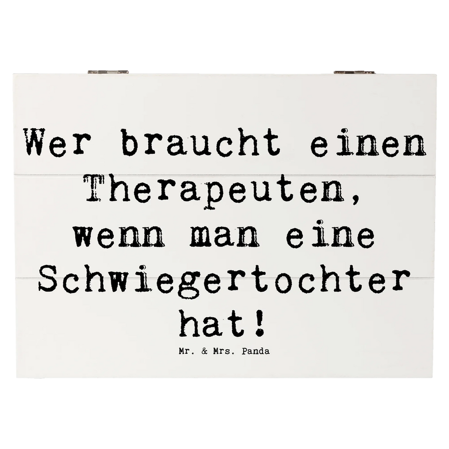 Die wunderschöne Holzkiste von Mr. & Mrs. Panda ist das perfekte Geschenk für Deine Schwiegertochter! Mit dem charmanten Spruch "Wer braucht einen Therapeuten, wenn man eine Schwiegertochter hat!" wird sie nicht nur zu einem praktischen Aufbewahrungsort für all die kleinen und großen Schätze des Lebens, sondern auch zu einem liebevollen Ausdruck Deiner Wertschätzung.