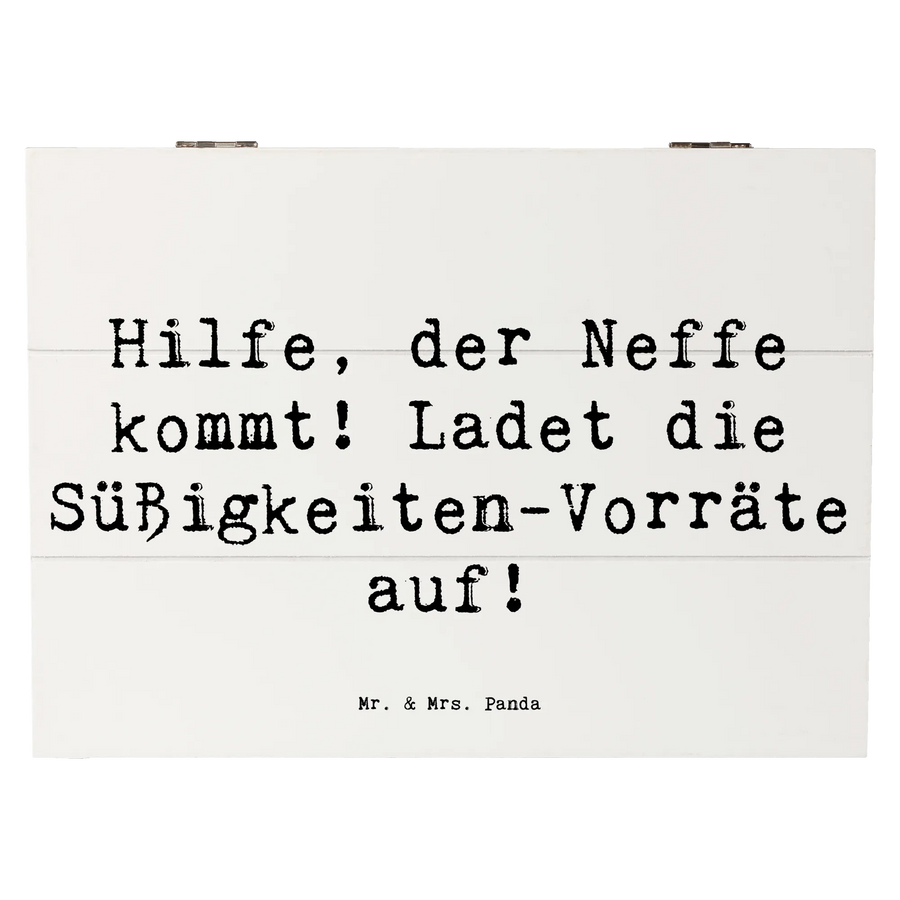 Entdecke die zauberhafte Holzkiste von Mr. & Mrs. Panda, die perfekt für deinen Neffen geeignet ist. Diese wunderschöne Schatzkiste bietet nicht nur genug Platz für all die kleinen und großen Schätze deines Lieblings, sondern bringt mit ihrem liebevollen Design auch direkt gute Laune ins Kinderzimmer! Bedruckt mit dem witzigen Spruch "Hilfe, der Neffe kommt! Ladet die Süßigkeiten-Vorräte auf!" weckt sie die Vorfreude auf fröhliche Abenteuer voller Spiele und Süßigkeiten. Ein ganz besonderes Geschenk für deinen Neffen – egal ob zur Geburtstagsfeier, zur Kommunion oder einfach als nettes Dankeschön für all die schönen Momente, die ihr miteinander teilt.