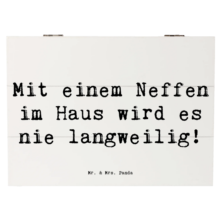 Die Holzkiste "Für meinen Neffen" von Mr. & Mrs. Panda ist das perfekte Geschenk für all jene, die ihren Neffen eine besondere Freude bereiten möchten. Diese wunderschöne Kiste mit dem liebevollen Spruch "Mit einem Neffen im Haus wird es nie langweilig!" ist nicht nur ein toller Blickfang, sondern bietet auch einen idealen Aufbewahrungsort für all die kleinen Schätze, die sich im Laufe der Zeit ansammeln.
