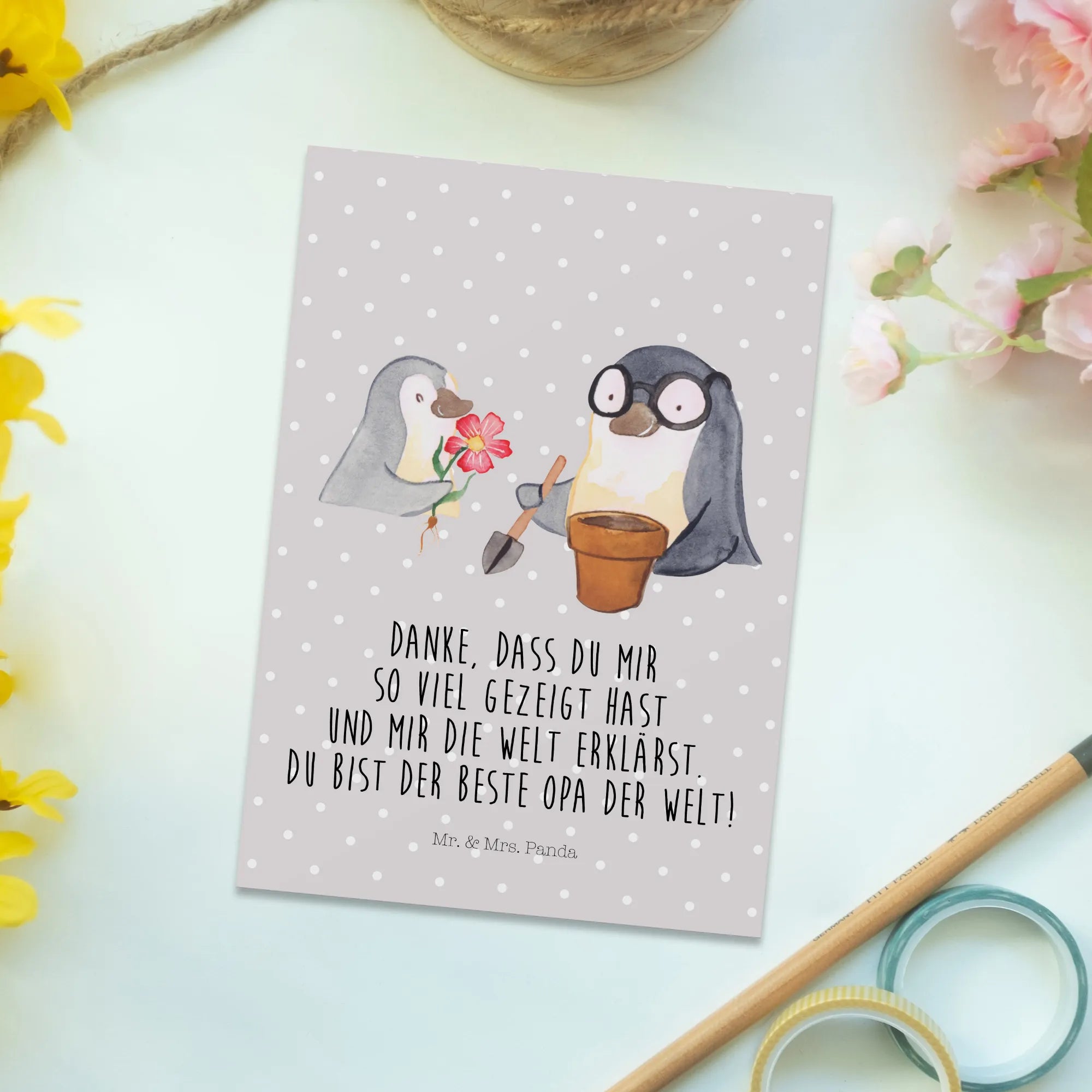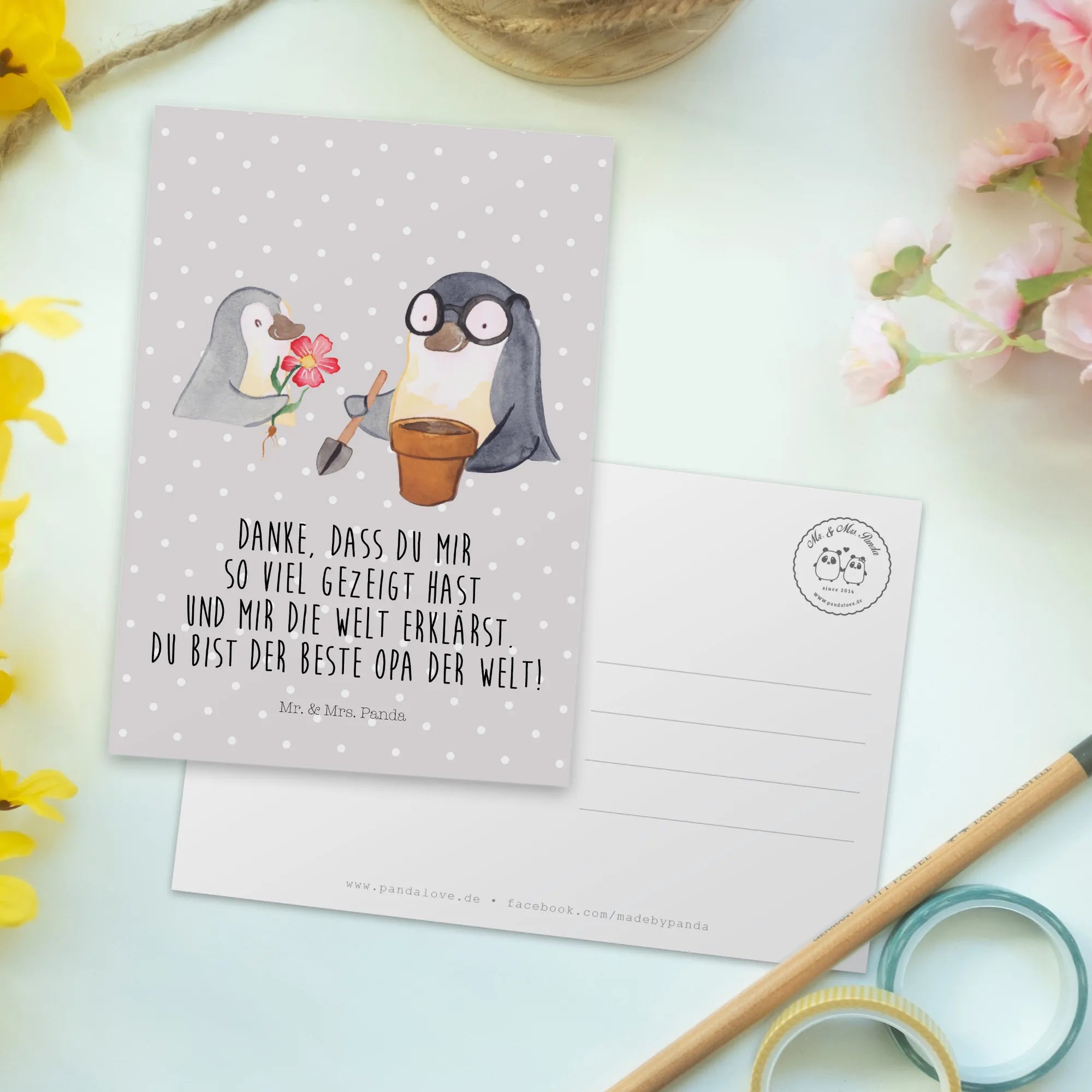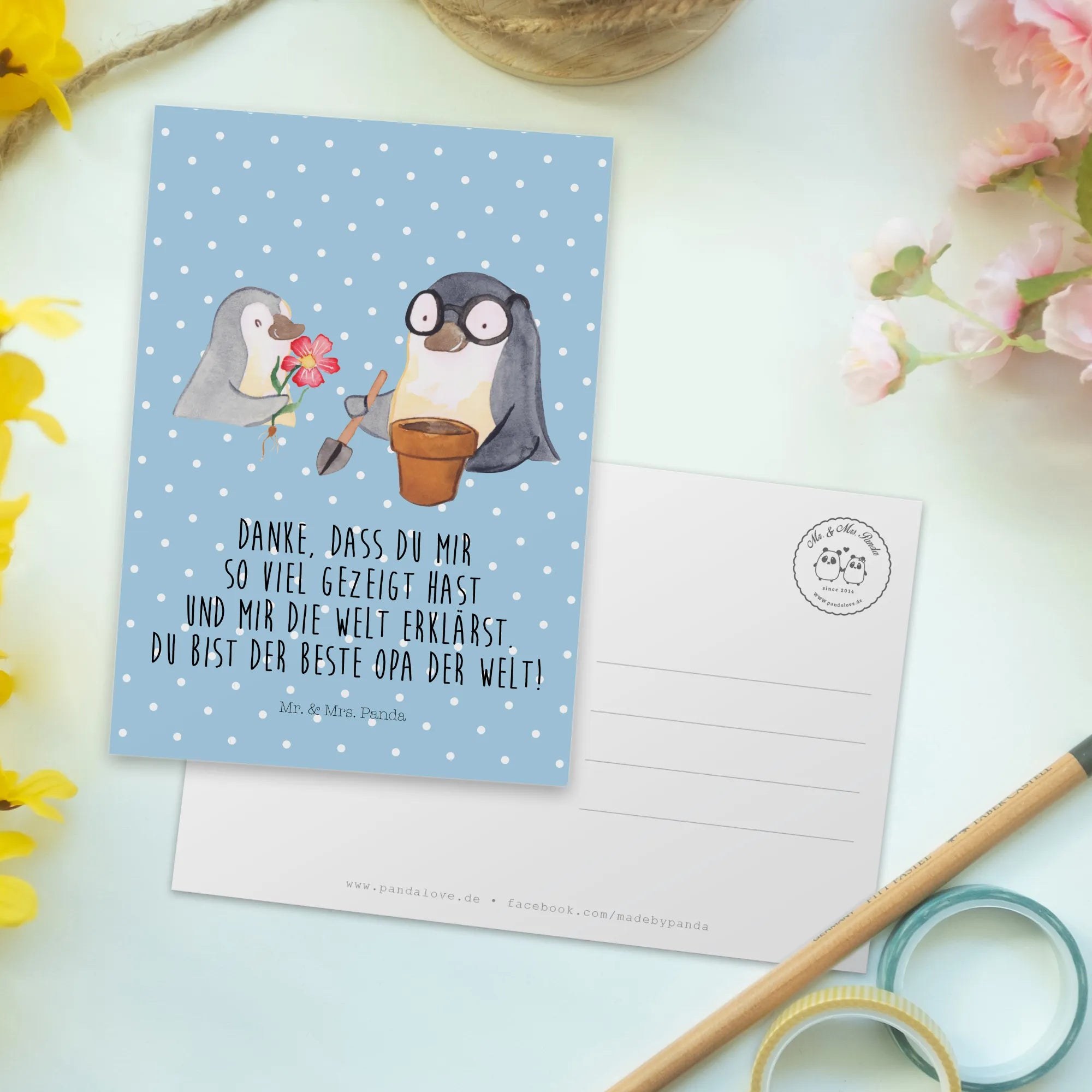 Pocztówka Pingwin dziadek sadzi kwiaty - z napisem - Niebieski Pastel