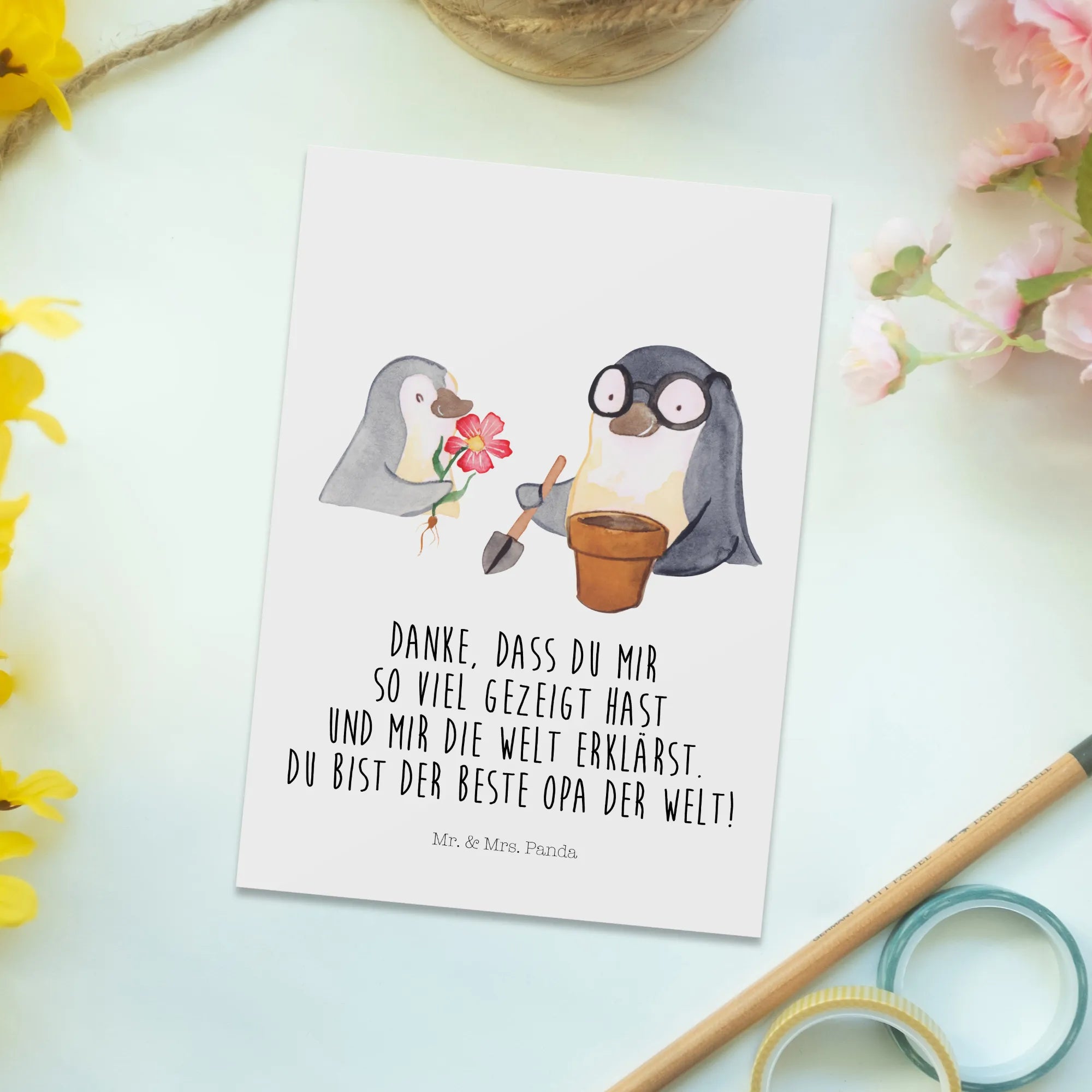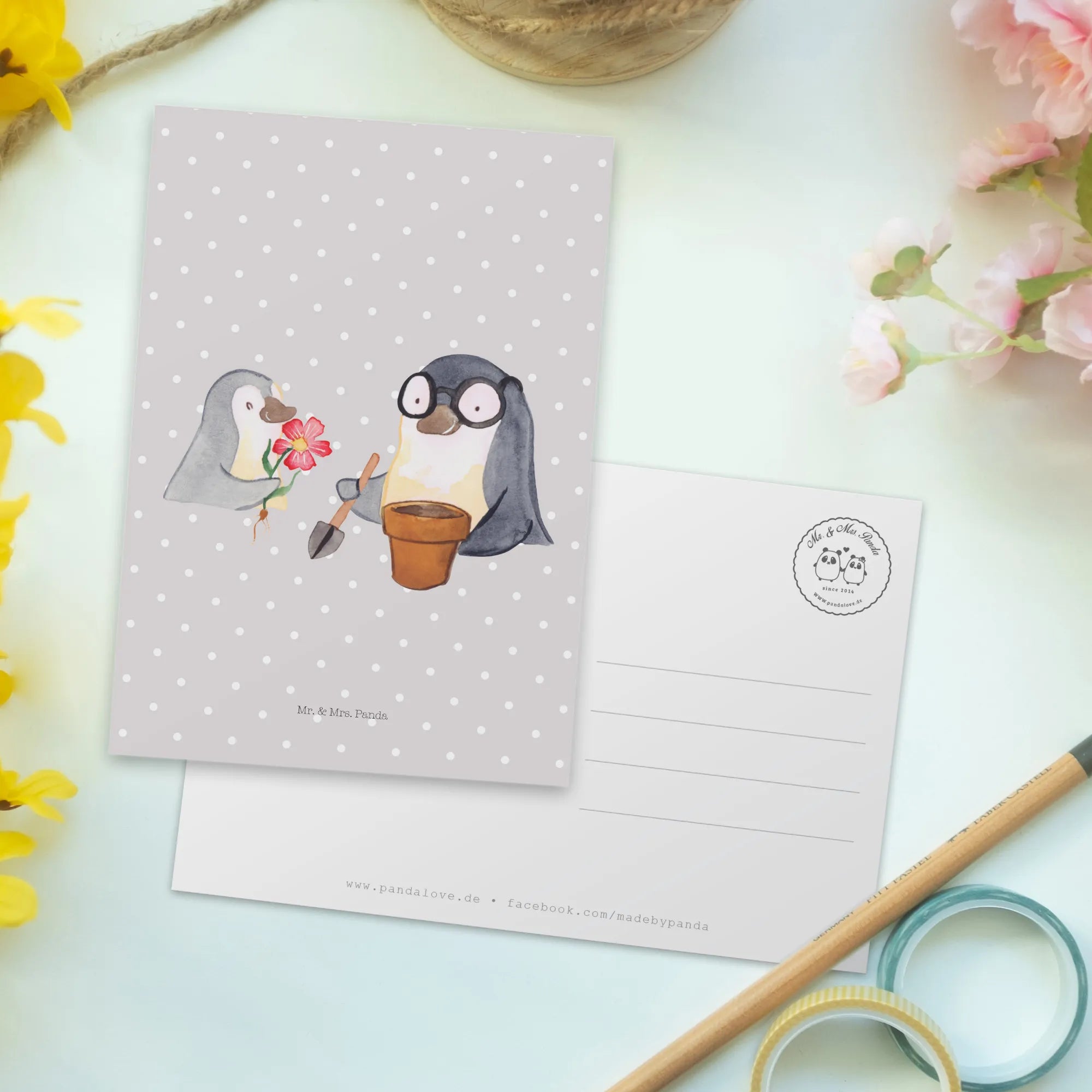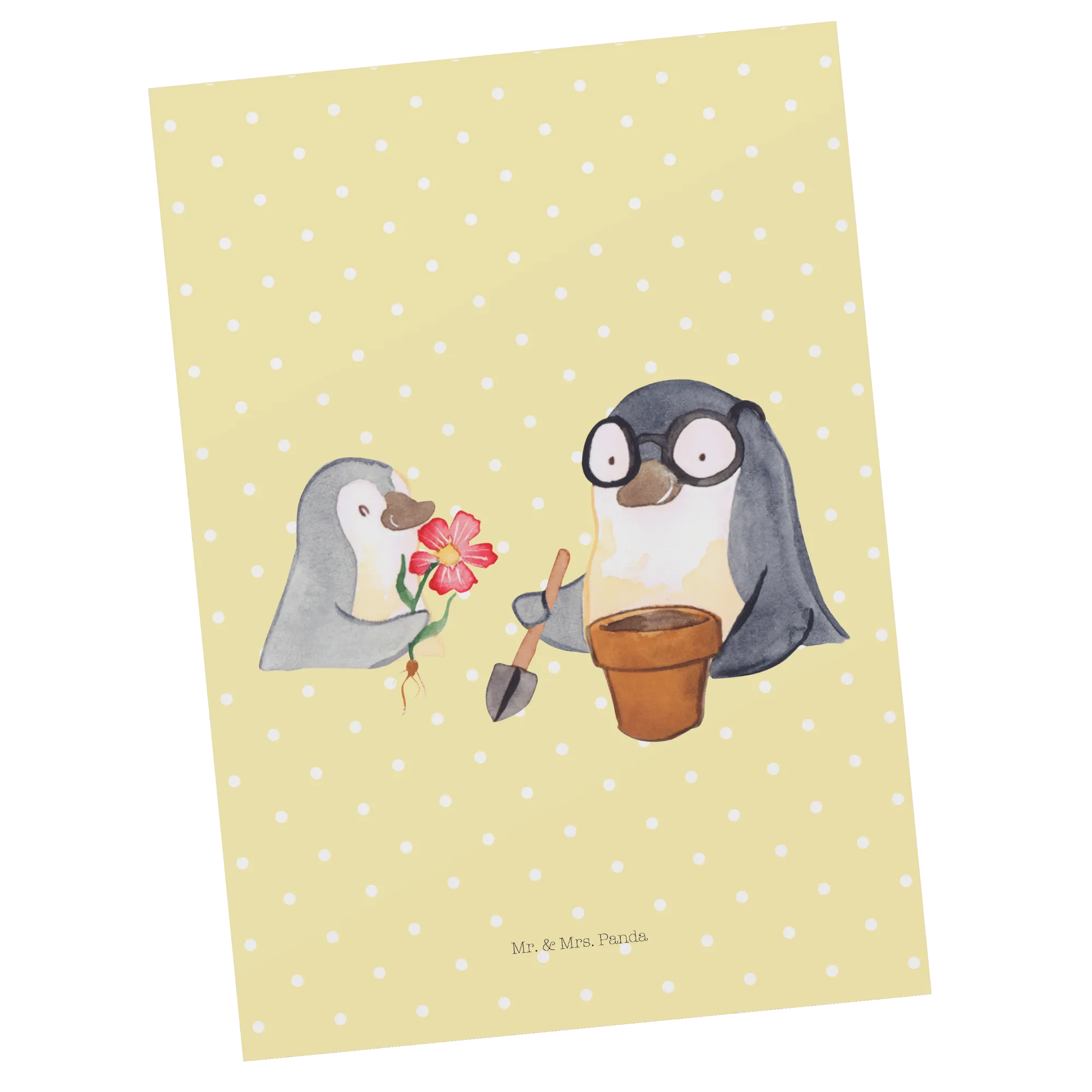 Pocztówka Pingwin dziadek sadzi kwiaty - z napisem - Niebieski Pastel