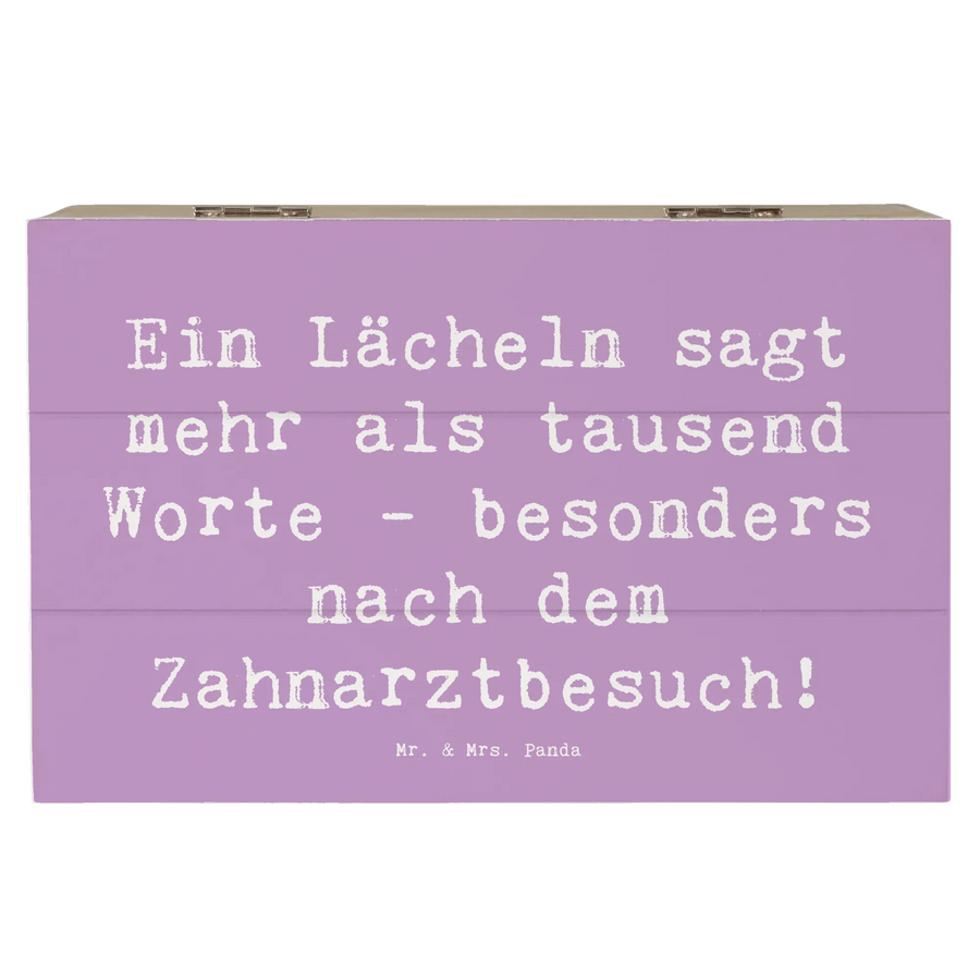Auf der Kiste prangt der tolle Spruch: 'Ein Lächeln sagt mehr als tausend Worte - besonders nach dem Zahnarztbesuch!'. Dieses liebevoll gestaltete Motiv wird mit viel Herz von Mrs. Panda handgezeichnet und sorgt für Freude bei jedem Blick darauf.