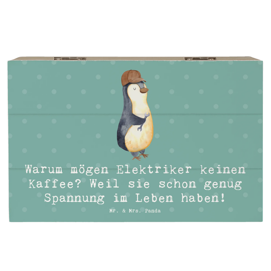 Die zauberhafte Holzkiste von Mr. & Mrs. Panda ist das perfekte Geschenk für Elektiker und alle, die sich mit diesem spannenden Beruf identifizieren. Bedruckt mit dem humorvollen Spruch "Warum mögen Elektriker keinen Kaffee? Weil sie schon genug Spannung im Leben haben!" bringt diese Kiste nicht nur Freude, sondern ist auch eine praktische Aufbewahrungslösung für all die kleinen Schätze im Leben.