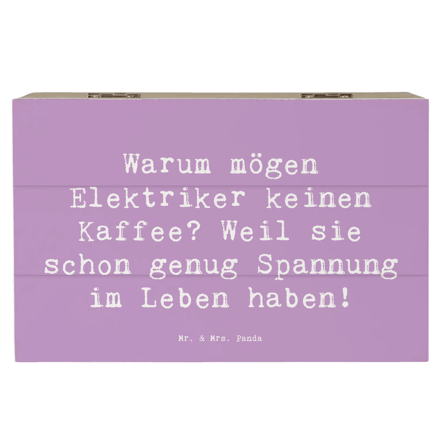 Entdecke die wunderschöne Holzkiste für Elektriker aus der Berufe-Kollektion von Mr. & Mrs. Panda! Diese einzigartige Schatzkiste wird mit einem charmanten Spruch verschönert: "Warum mögen Elektriker keinen Kaffee? Weil sie schon genug Spannung im Leben haben!". Die Kiste ist nicht nur ein praktischer Aufbewahrungsort für Deine wertvollsten Erinnerungen, sondern auch ein echtes Highlight in jedem Raum.