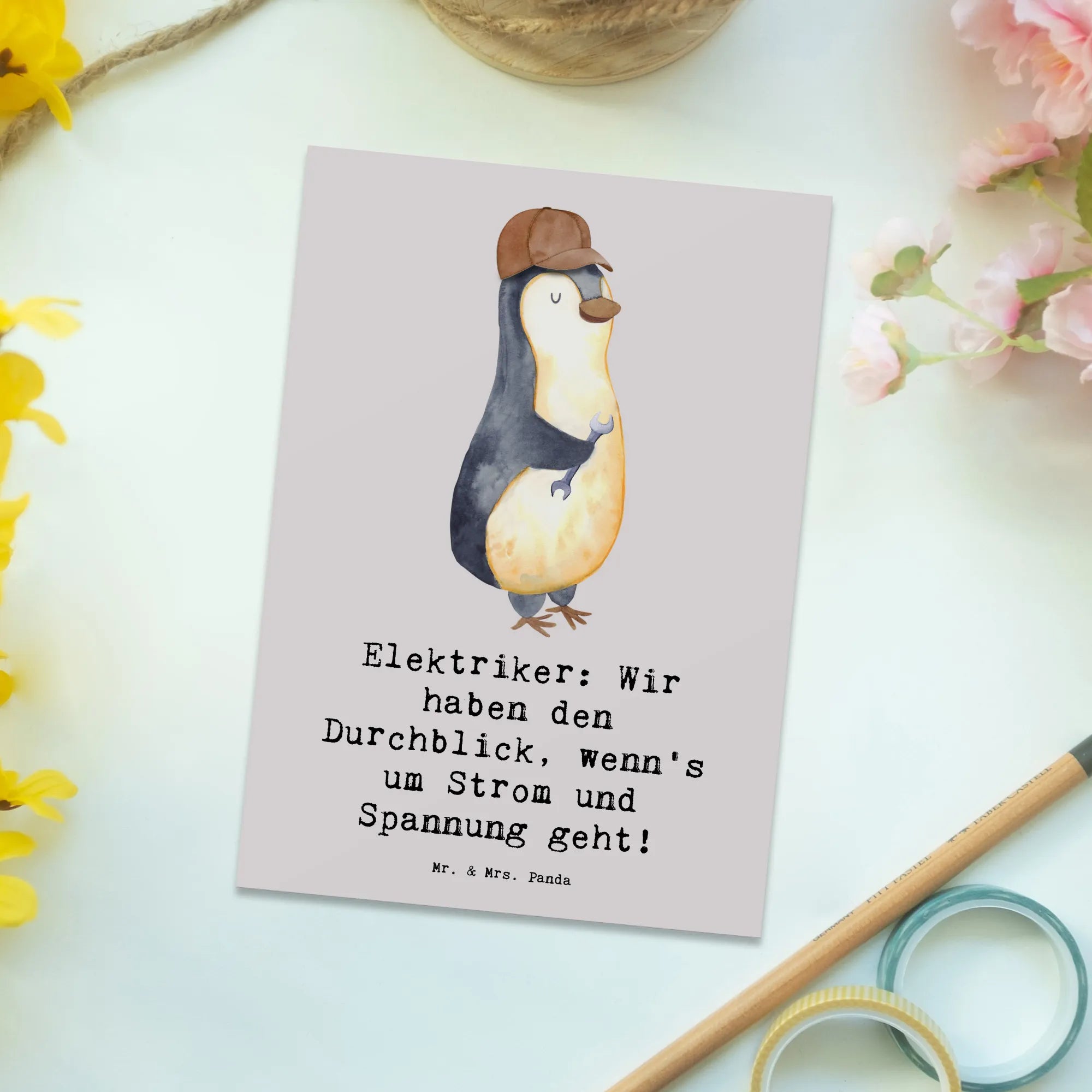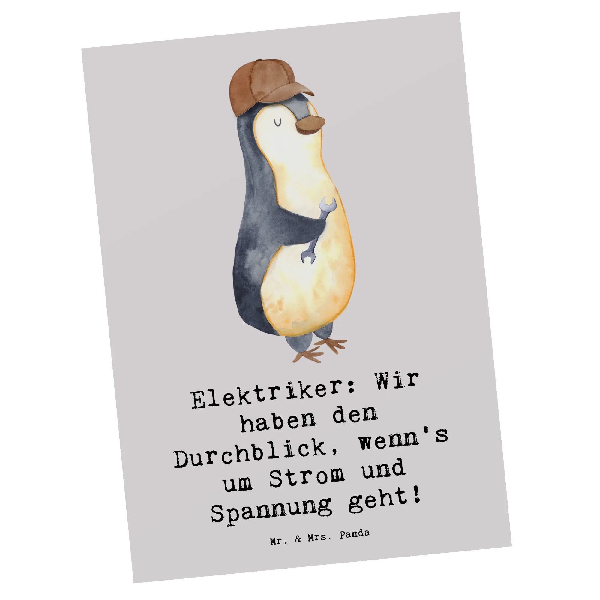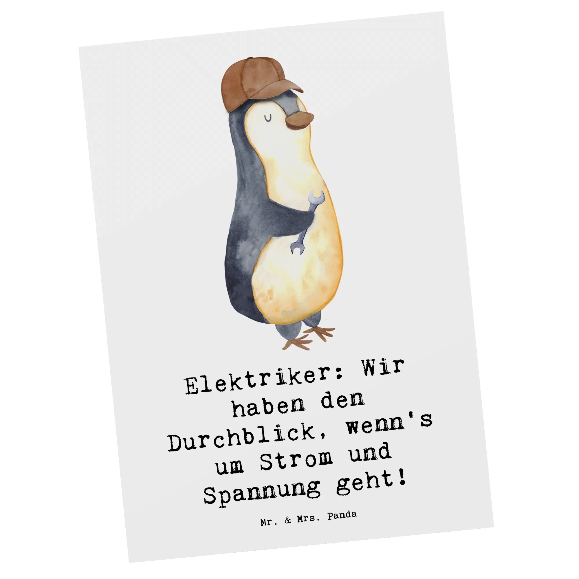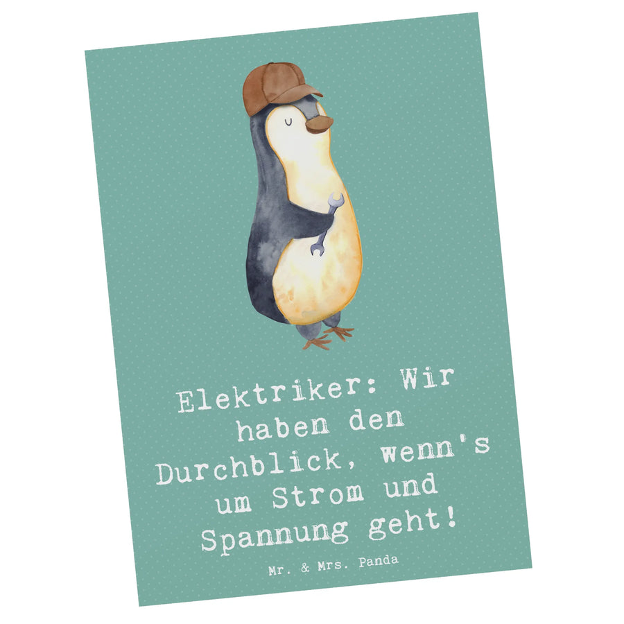 Die Postkarte "Elektriker: Wir haben den Durchblick, wenn's um Strom und Spannung geht!" aus der bezaubernden Berufe-Kollektion von Mr. & Mrs. Panda ist das perfekte Geschenk für jeden Elektriker oder jemand, der mit Elektrizität arbeitet.