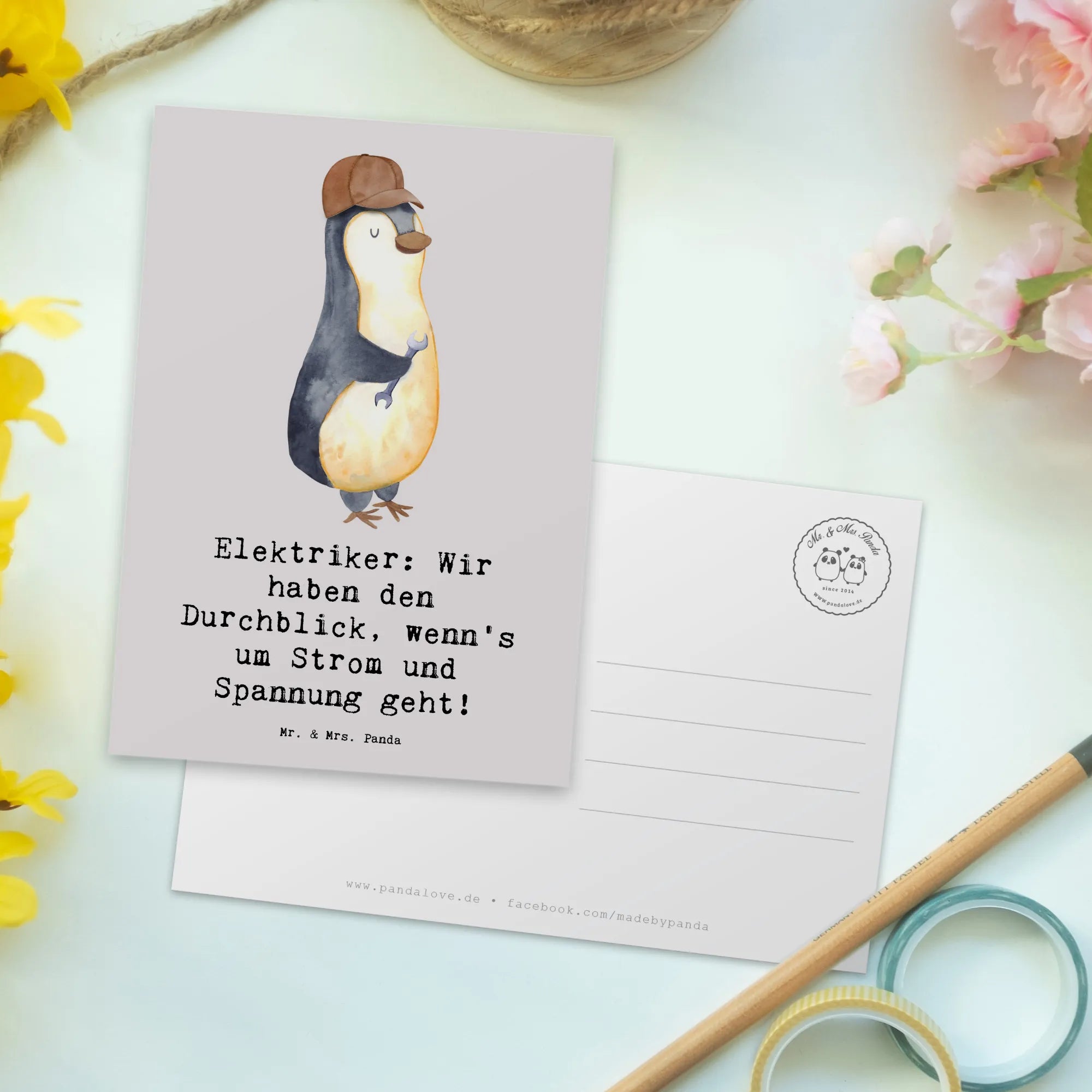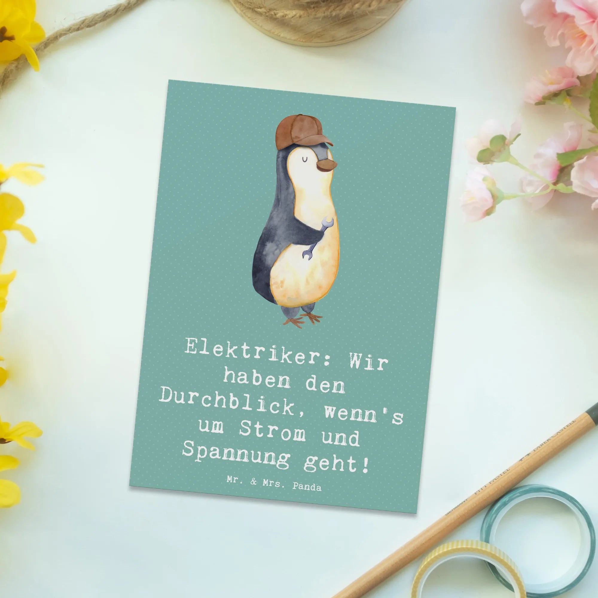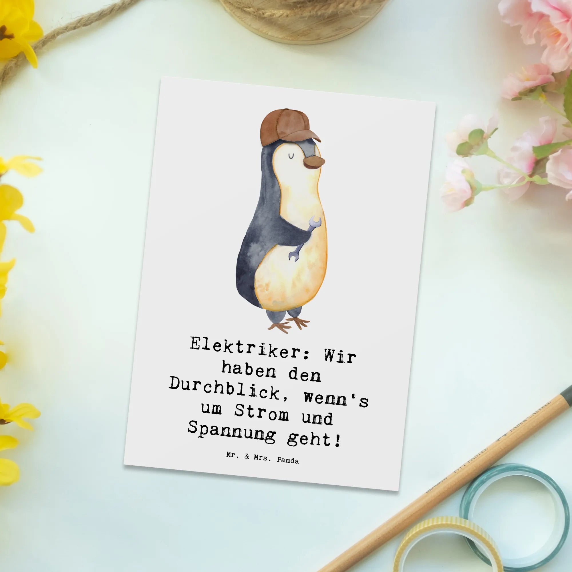 Die Postkarte "Elektriker: Wir haben den Durchblick, wenn's um Strom und Spannung geht!" aus der bezaubernden Berufe-Kollektion von Mr. & Mrs. Panda ist das perfekte Geschenk für jeden Elektriker oder jemand, der mit Elektrizität arbeitet.