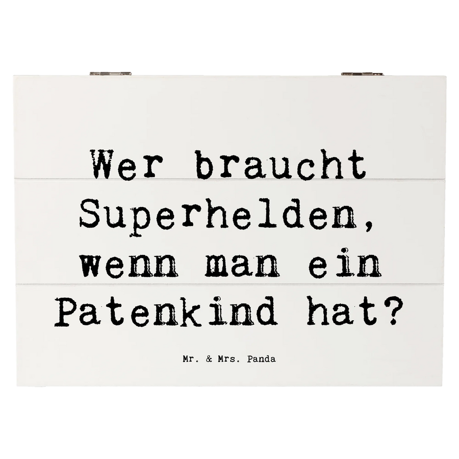 Die Botschaft 'Wer braucht Superhelden, wenn man ein Patenkind hat?' bringt die außergewöhnliche Beziehung zwischen einem Paten und seinem Patenkind perfekt auf den Punkt und macht die Kiste zu einem liebevollen Geschenk.