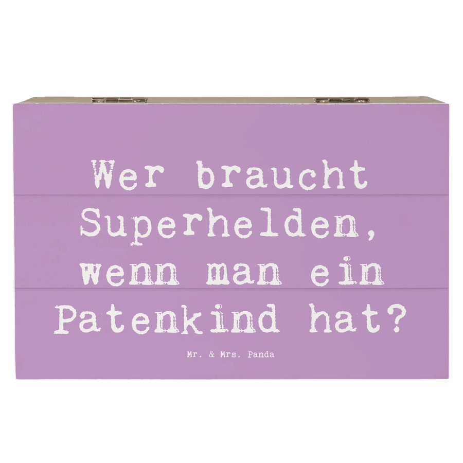 Die Botschaft 'Wer braucht Superhelden, wenn man ein Patenkind hat?' bringt die außergewöhnliche Beziehung zwischen einem Paten und seinem Patenkind perfekt auf den Punkt und macht die Kiste zu einem liebevollen Geschenk.