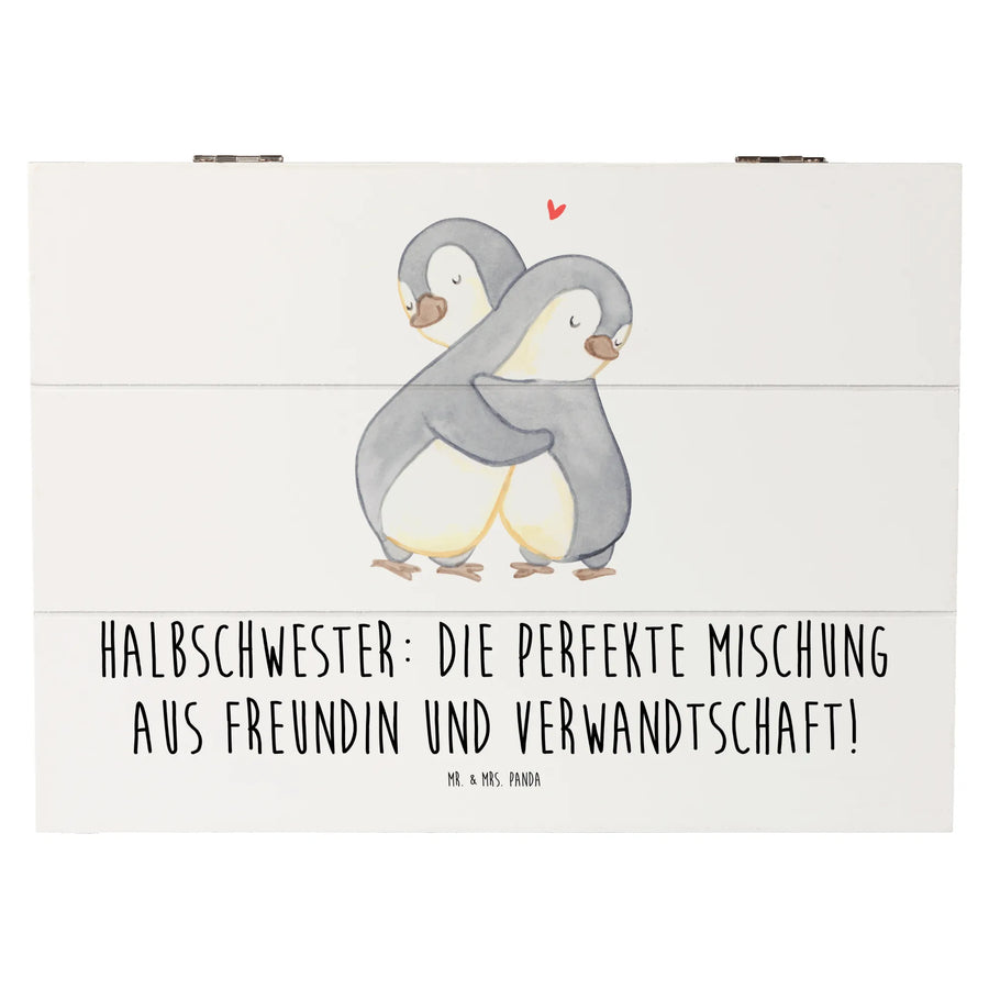 Die wunderschöne Holzkiste mit dem motivierenden Spruch "Halbschwester: Die perfekte Mischung aus Freundin und Verwandtschaft!" von Mr. & Mrs. Panda ist das ideale Geschenk für jede Halbschwester. Sie eignet sich hervorragend zur Aufbewahrung von besonderen Erinnerungen und Schätzen.