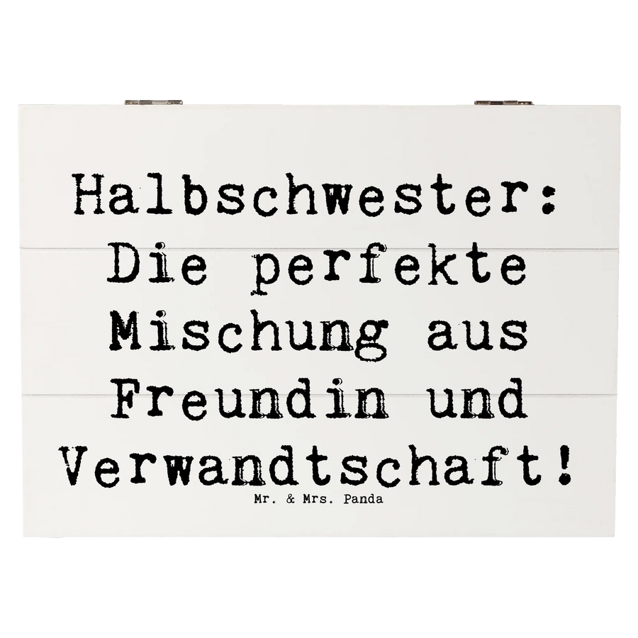 Mit dem Spruch 'Halbschwester: Die perfekte Mischung aus Freundin und Verwandtschaft!' macht sie deutlich, wie wichtig diese Verbindung ist und feiert die einzigartige Rolle, die Halbschwestern im Leben der Menschen spielen. Jedes Mal, wenn ihr die Kiste öffnet, werdet ihr an all die gemeinsamen Erlebnisse erinnert, die euch verbinden.