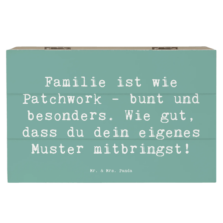 Der wunderbare Spruch "Familie ist wie Patchwork - bunt und besonders. Wie gut, dass du dein eigenes Muster mitbringst!" ziert den Deckel dieser Kiste und erinnert an die einzigartigen Familienbande, die durch Adoption entstehen. Dieses Motto ist nicht nur ein schöner Gedanke, sondern unterstreicht auch die Liebe und den Zusammenhalt, die in einer Patchworkfamilie bestehen.
