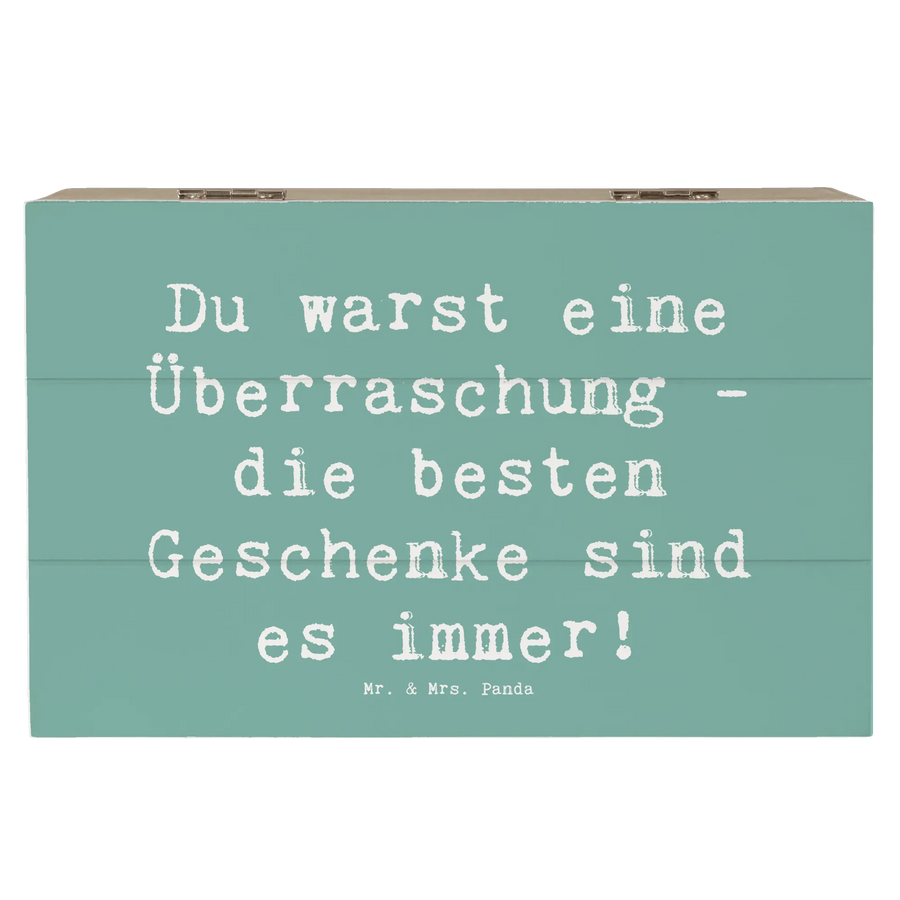 Mit dem Slogan 'Du warst eine Überraschung - die besten Geschenke sind es immer!' wirst Du garantiert ein Lächeln auf die Gesichter der Beschenkten zaubern. Ob zu festlichen Anlässen, zur Kommunion, Konfirmation oder einfach als Dankeschön, diese Holzschatulle ist ein Geschenk, das von Herzen kommt.