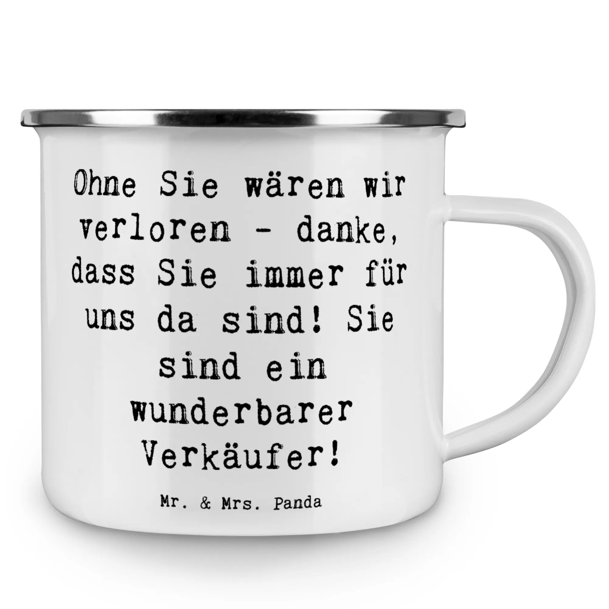 Die wunderschöne Camping Emaille Tasse von Mr. & Mrs. Panda ist das perfekte Geschenk für all jene, die gerne in der Natur unterwegs sind und gleichzeitig ihren Lieblingskaffee oder -tee stilvoll genießen möchten. Mit einem charmanten Motiv, das den Spruch "Ohne Sie wären wir verloren - danke, dass Sie immer für uns da sind! Sie sind ein wunderbarer Verkäufer!" präsentiert, ist diese Tasse nicht nur funktional, sondern zaubert auch ein Lächeln auf die Lippen.